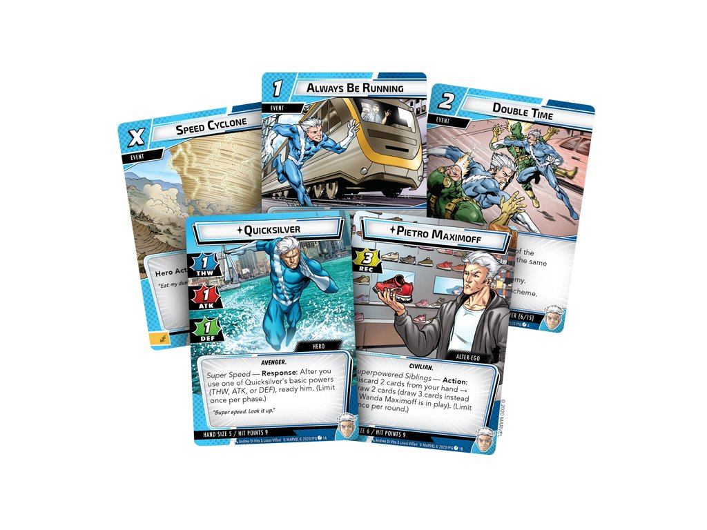 A bolygó leggyorsabb emberének kissé kétes múltja lehet, de Pietro Maximoff most arra használja képességeit, hogy jót tegyen a Bosszúálókkal mind Quicksilver. Most lehetősége van kipróbálni a sebességét a Quicksilver Hero Pack-ben a Marvel Champoions kártyajátékhoz!