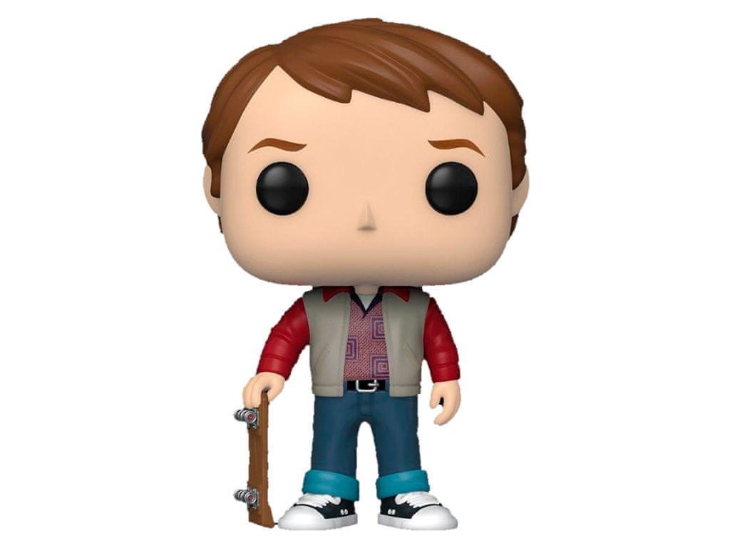 Funko figura Marty McFly tipikus kabátjában és gördeszkájával a kultikus Vissza a jövőbe című sci-fi filmből.