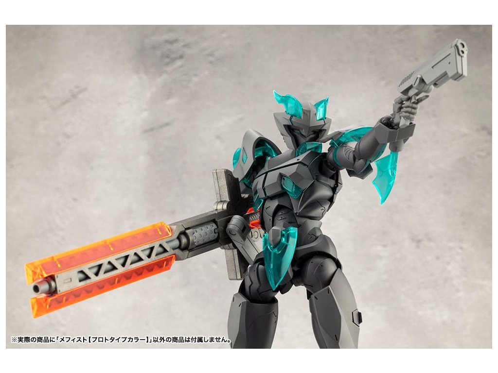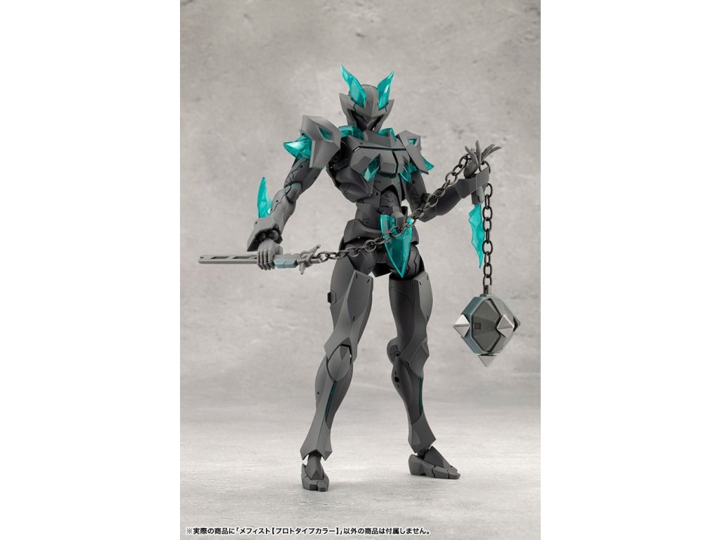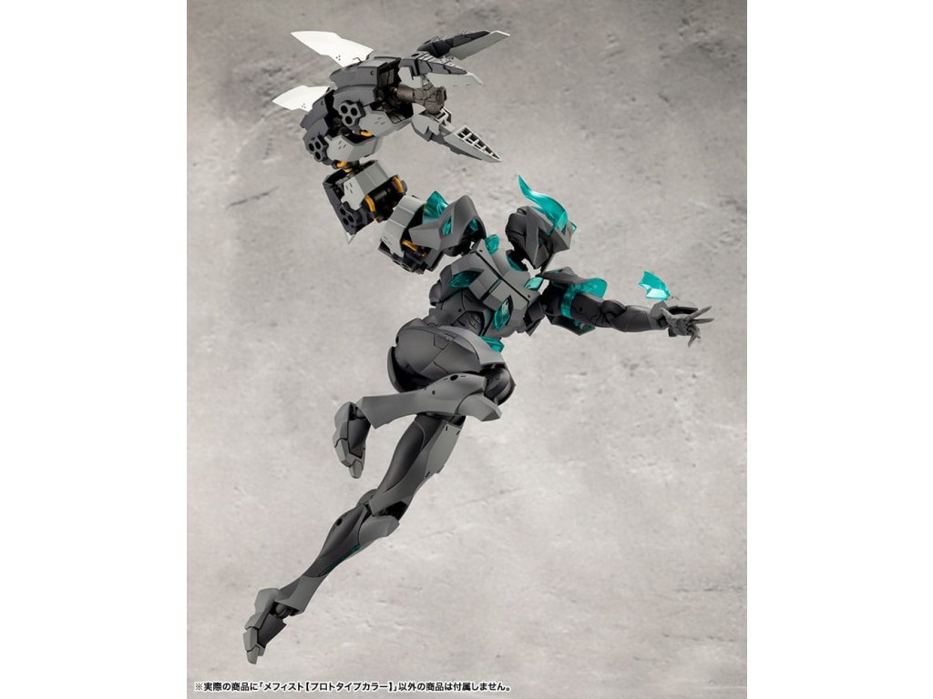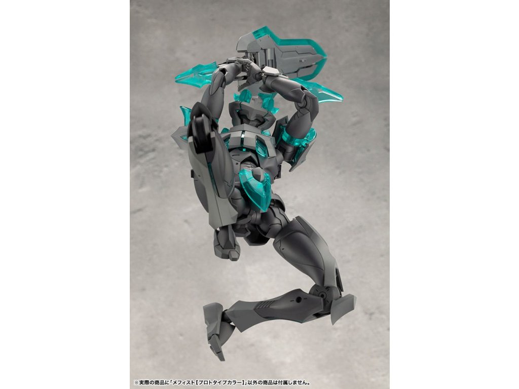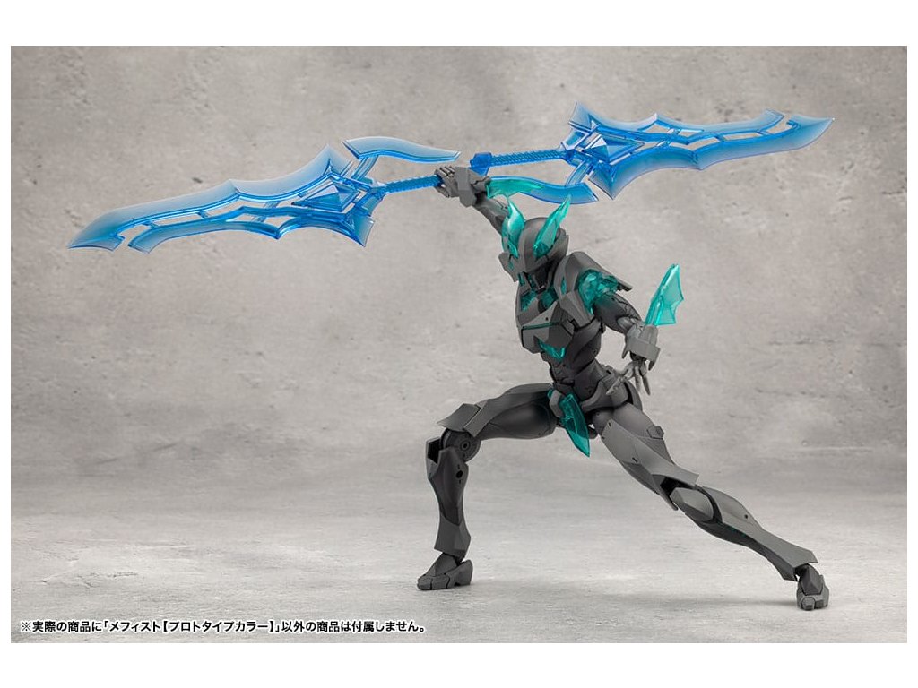Sok felhasználó kérésére a tizedik MEGALOMARIA figura Mephisto színes prototípusa. Színösszeállítás: A modell három színt használ - HEXA fekete, HEXA szürke és átlátszó türkiz zöld, egy olyan kombinációt, amelyet úgy terveztek, hogy jól illeszkedjen mind az M.S.G.-hez, mind a HEXA GEAR-hoz. Mozgó részek: A Mephisto körülbelül 54 mozgási ponttal rendelkezik a testén. Az új sípcsont-artikulációval ellátott térdízület egyetlen ízületi rétegből áll, és eléggé befelé hajlítható ahhoz, hogy a modell szeiza-pózban, azaz a lábak alá hajtva ülhessen. A lábujjak új csuklója lehetővé teszi az agresszívabb pozíciók felvételét. A térdpáncél önállóan mozgatható és a kívánt pozícióba állítható. A karok több ízületből állnak, és előre lehet nyújtani őket, hogy keresztbe tett karpozíciót hozzanak létre. Hárompontos csuklóízület: a csuklót úgy tervezték, hogy közel 180 fokban befelé hajoljon, lehetővé téve a kemény pont előrevitelét. Mephisto nagyobb ízületekkel rendelkezik, mint a női testű karakterek, például Principal, ami lehetővé teszi, hogy Mephisto nagyobb és erősebb fegyvereket használjon. A normál csuklóízületek és a rés szabadon használható, ahogyan azt előnyben részesítik. Kezek: A készlet hétféle kezet tartalmaz. Ezek között vannak kardok tartására, fegyverek fogására tervezett kezek, valamint zárt ököl és különböző nyitott kezek. Tartalmazza: - 1 x Mephisto modell - 1 x csuklós pengék (bal és jobb) - Hétféle kéz - 1 x bunkósbot alakú páncél 3 mm-es csuklóval, amely kompatibilis a repülő bázissal - 1 x normál csuklócsukló és rés (bal és jobb) - 1 x egyrészes hátpáncél.Kiegészítő paraméterek