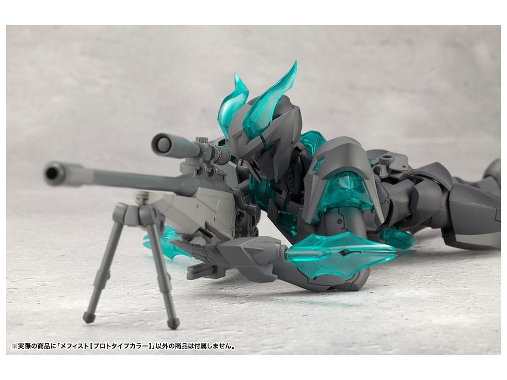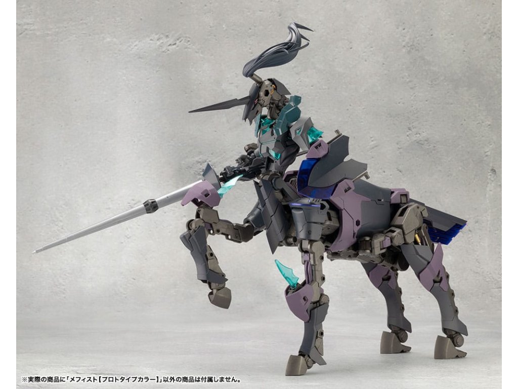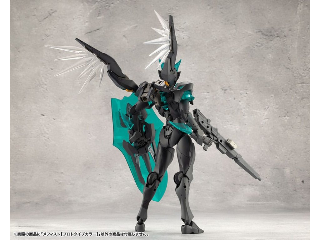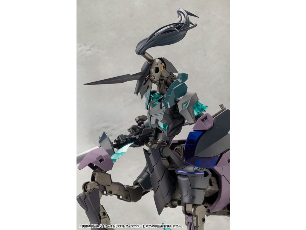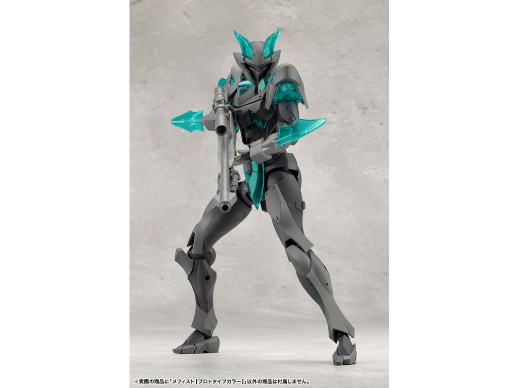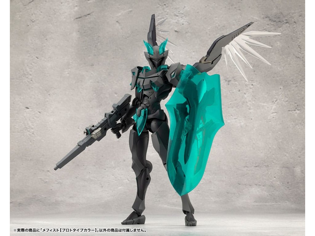 Sok felhasználó kérésére a tizedik MEGALOMARIA figura Mephisto színes prototípusa. Színösszeállítás: A modell három színt használ - HEXA fekete, HEXA szürke és átlátszó türkiz zöld, egy olyan kombinációt, amelyet úgy terveztek, hogy jól illeszkedjen mind az M.S.G.-hez, mind a HEXA GEAR-hoz. Mozgó részek: A Mephisto körülbelül 54 mozgási ponttal rendelkezik a testén. Az új sípcsont-artikulációval ellátott térdízület egyetlen ízületi rétegből áll, és eléggé befelé hajlítható ahhoz, hogy a modell szeiza-pózban, azaz a lábak alá hajtva ülhessen. A lábujjak új csuklója lehetővé teszi az agresszívabb pozíciók felvételét. A térdpáncél önállóan mozgatható és a kívánt pozícióba állítható. A karok több ízületből állnak, és előre lehet nyújtani őket, hogy keresztbe tett karpozíciót hozzanak létre. Hárompontos csuklóízület: a csuklót úgy tervezték, hogy közel 180 fokban befelé hajoljon, lehetővé téve a kemény pont előrevitelét. Mephisto nagyobb ízületekkel rendelkezik, mint a női testű karakterek, például Principal, ami lehetővé teszi, hogy Mephisto nagyobb és erősebb fegyvereket használjon. A normál csuklóízületek és a rés szabadon használható, ahogyan azt előnyben részesítik. Kezek: A készlet hétféle kezet tartalmaz. Ezek között vannak kardok tartására, fegyverek fogására tervezett kezek, valamint zárt ököl és különböző nyitott kezek. Tartalmazza: - 1 x Mephisto modell - 1 x csuklós pengék (bal és jobb) - Hétféle kéz - 1 x bunkósbot alakú páncél 3 mm-es csuklóval, amely kompatibilis a repülő bázissal - 1 x normál csuklócsukló és rés (bal és jobb) - 1 x egyrészes hátpáncél.Kiegészítő paraméterek