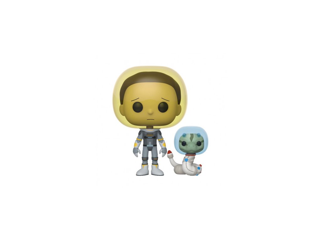 Vinyl Funko POP! figura, amely Morty-t ábrázolja űrruhában egy kígyóval együtt a népszerű Rick és Morty sorozat 4. évadának "Rattlestar Ricklactica" című epizódja alapján.