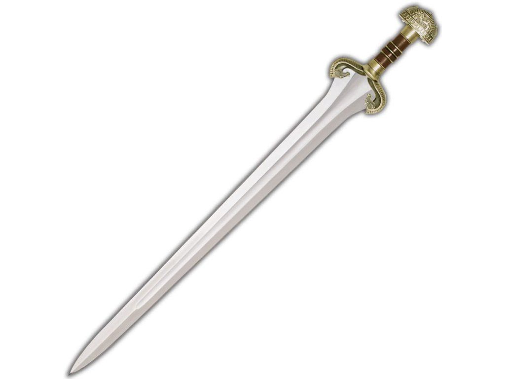 Eowyn Edorasban született, és korán elszenvedte szülei halálát. Kénytelen volt gondoskodni beteg nagybátyjáról, Theoden királyról, akinek egészsége Szarumán és Gríma Pajzs egyre növekvő befolyása alatt rohamosan romlott. A gyönyörű és erős Eowynt pajzslánynak képezték ki, és úgy gondolták, hogy sok tekintetben felülmúlja Rohan férfiait. Egy teljes hosszúságú kardot viselt, amely a hegyétől a markolatig csaknem három láb hosszú volt. A bronz sarkantyúk és rügyek gyönyörűen megformáltak a mear tiszteletére, és javították Eowyn kis kezének a kardot tartó fogását. A kard markolatát három bronzgyűrűből álló, kiemelkedő középpontú középen készítették el. A pengének 3/4 részén széles barázda futott végig, hogy csökkentse a súlyt, de anélkül, hogy a penge fontos erősségét elveszítené. Ez a fajta barázda a Rohirrim királyi kardokra volt jellemző. Nagybátyjai akarata ellenére Eowyn a hobbit Merryvel együtt álruhában részt vett a pelennori mezők csatájában, hogy megvédje bukott királyukat. Eowyn igazi hősiességet ért el, amikor sikerült megölnie a varázslókirályt és annak baljós paripáját, de súlyos sérüléseket szenvedett a keresztút során. Miután Elesar király meggyógyította, Eowyn végül felhagyott a harci hősiesség iránti szenvedélyével, és Faramir karjaiban megtalálta az igaz szerelmet. A csomaghoz tartozik egy pergamenre írt eredetiségigazolás és egy fa plakett a bemutatáshoz. ÖSSZES HOSSZÚ: 92,71 cm Pengehossz: 76,52 cm Pengehossz: 0,64 cm Pengehossz: 420 J2 edzett acél, teljes csiszolással, hamisan élezett. PÁLYAANYAG: Teljesen fém sarkantyú és markolat antikolt sárgaréz bevonattal, a markolat a híres rohan lovak jelzéseivel öntött, valódi bőrbe burkolt markolat, kúpos ágyékkal ellátott konstrukció. LAP: 27,94 cm x 26,99 cm x 1,91 cm fa, a Rohan ikon szitanyomásos mintája. Összeszerelési anyag, használati utasítás mellékelve.Kiegészítő paraméterek