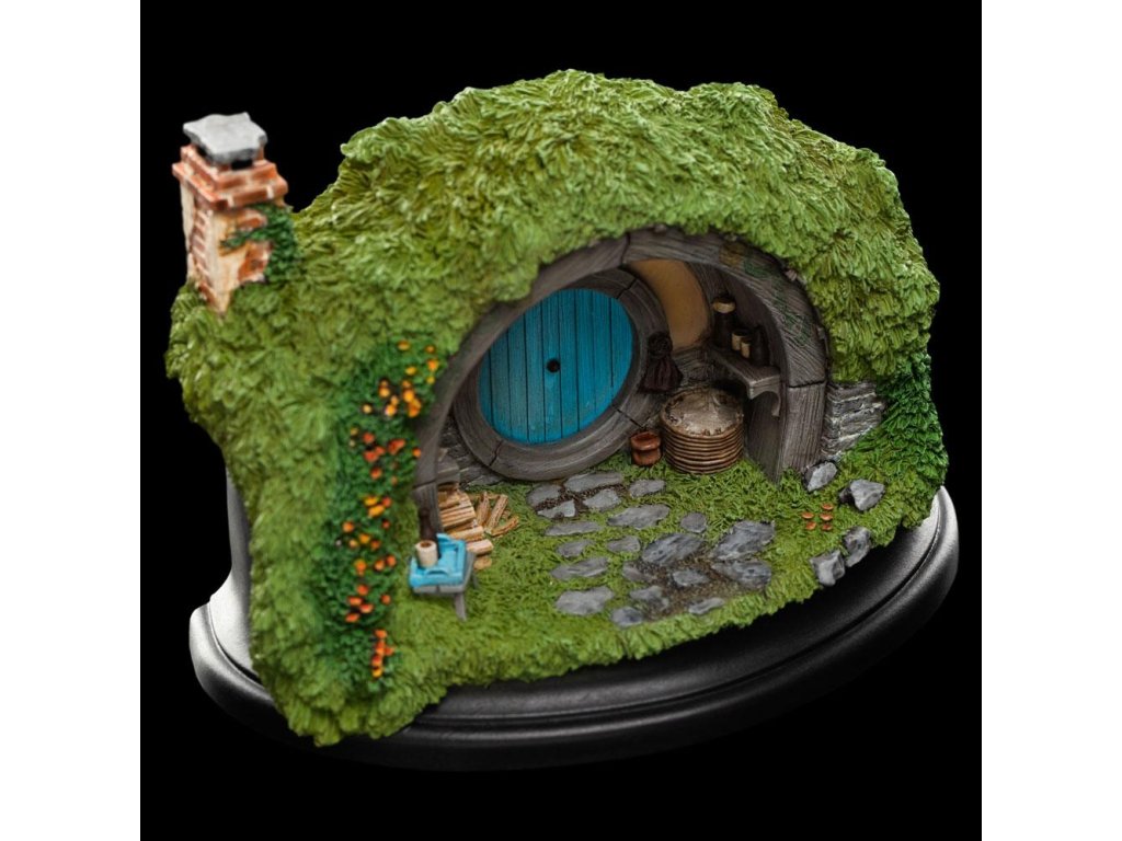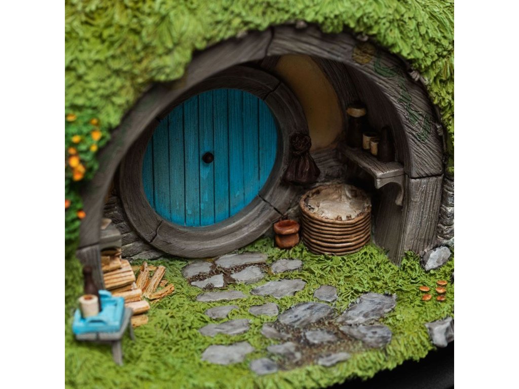 Egy földbe vájt lyukban élt egy hobbit. Nyári színekben pompázó, fényes kerek ajtók tarkítják Hobbiton buja, füves dombjait, mint a vadvirágok. Minden ajtó mögött kényelmetlenül a földbe nyúlnak az odúk: mindegyikben egy-egy hobbit, vagy a Királyságból származó piruló kisemberek családja lakik. Minden egyes hobbitlyuk egyedi, a színek, a kertek, a bútorok és a mindennapi élet vidéki kacatjai révén fejezik ki lakói személyiségét. A Bagshot Row és a kiterjedt Bag End birtok pazar szmájlijai alatt a Hill Lane kanyarog a domb alsó lejtőinek ráncai között, ahol Hobbiton néhány szerényebb hobbitlakása található. A 2A szám, pompás türkizkék ajtajával, egyike ezeknek a kisebb, de mégis elbűvölő lyukaknak. Azt mondják, hogy egy meleg nyári estén az itt lakó hobbitot lehet látni, amint egy jól megérdemelt korsó Southfarthingot fogyaszt. Minden hobbitlakás egyedi, ami közvetlenül alkalmas a kreatív elhelyezésre a szekrényben. Lapos hátoldaluknak és kis, mindössze 55 mm-es mélységüknek köszönhetően kandallókon, kandallópárkányokon, polcokon és ablakokban is elhelyezhetők. Ez a bájos kis díszlet pontos miniatűr mása a film díszletének, amely az új-zélandi The Hobbitin Matamata-ban látogatható. Ugyanazok a művészek és kézművesek tervezték, akik a filmben is dolgoztak. Méretek: 11,5 x 5 x 7 cm.Kiegészítő paraméterek