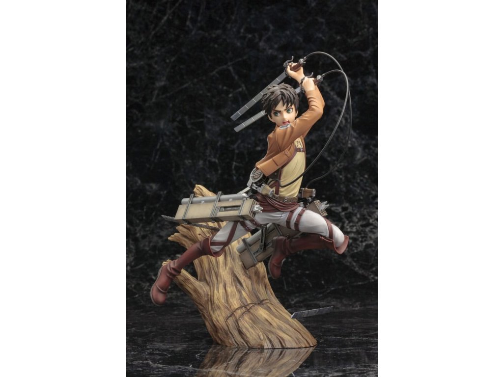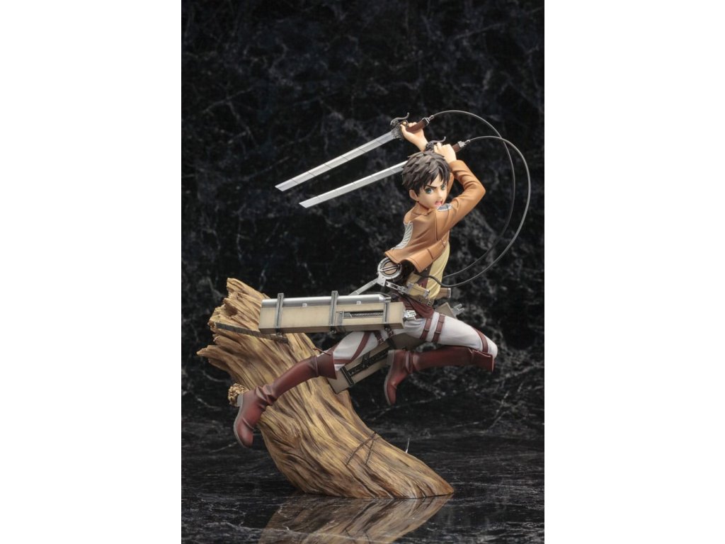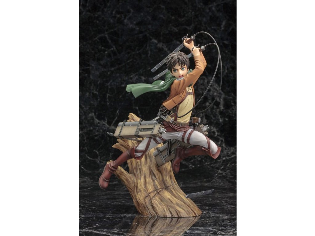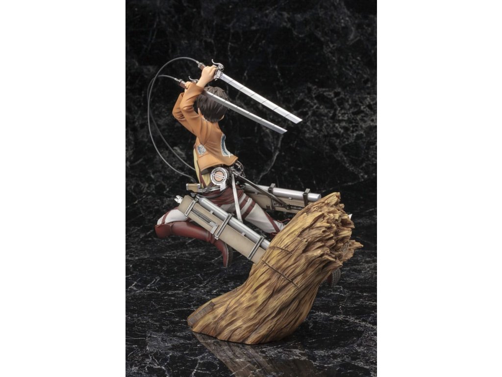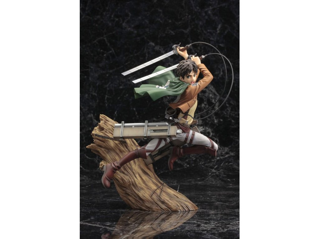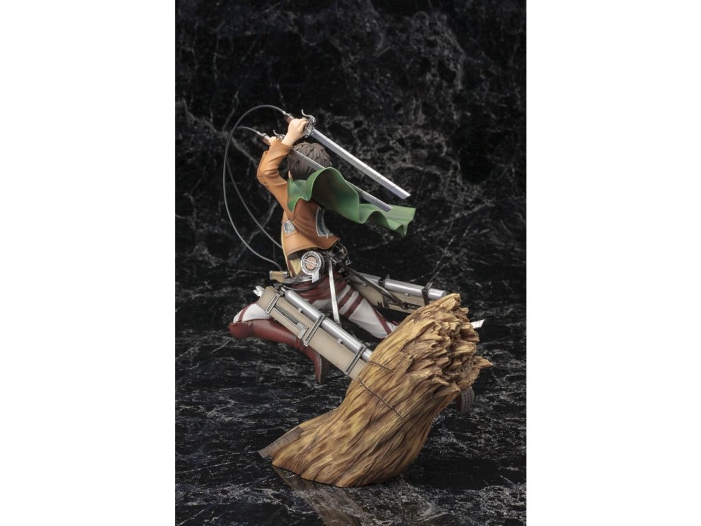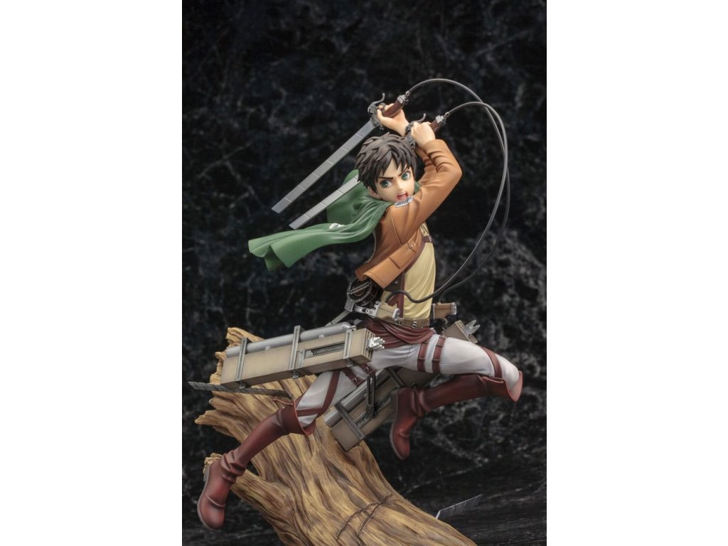A Kotobukiya ARTFX J sorozat új dimenzióba lép! A népszerű "Attack on Titan" anime sorozat főszereplője, Eren Yeager most egy teljesen új csomagban csatlakozik az ARTFX J sorozathoz! A szobor dinamikus pózban van ábrázolva, amely egy erdei csata képeit idézi fel! Eren a szuperkemény kardjával a magasba emelve látható, amint éppen a Titánt támadja! Az Eren arcán megjelenő erős akarat és az általános póz a fő jellemzője ennek a szobornak; a lábak olyan természetesnek tűnnek, mintha Eren valóban a levegőbe ugrott volna. Eren szobra nyilvánvalóan részletgazdag, de a függőleges manőverező eszközt is olyan precizitással készítették el, hogy egyetlen rész sem veszítette el gépszerűségét. Emellett a szobor alapjául szolgáló nagy fa minden részletét aprólékosan kidolgozták: a kéregmintáktól kezdve a törzsön lévő karcolásokig. A szobor kétféle stílusban állítható ki, mivel levehető héjjal rendelkezik. *Ez a termék reprodukció.Kiegészítő paraméterek