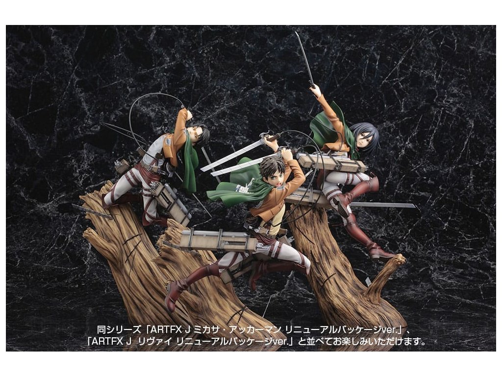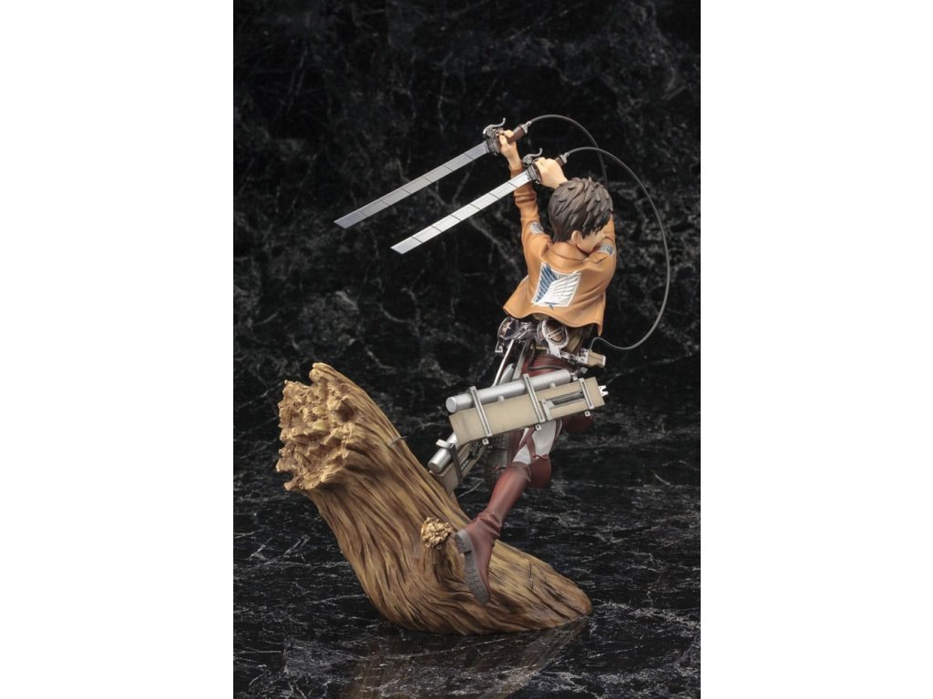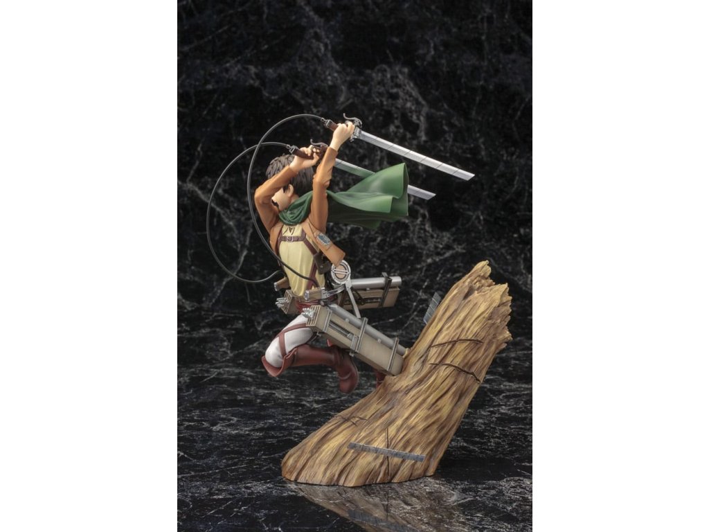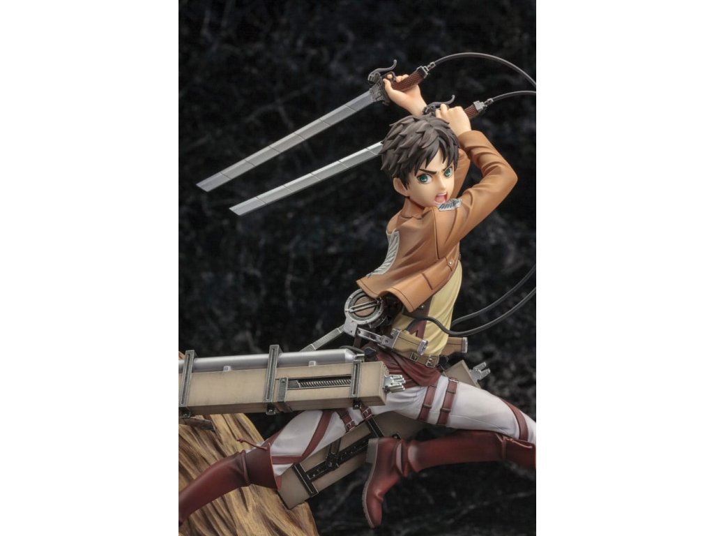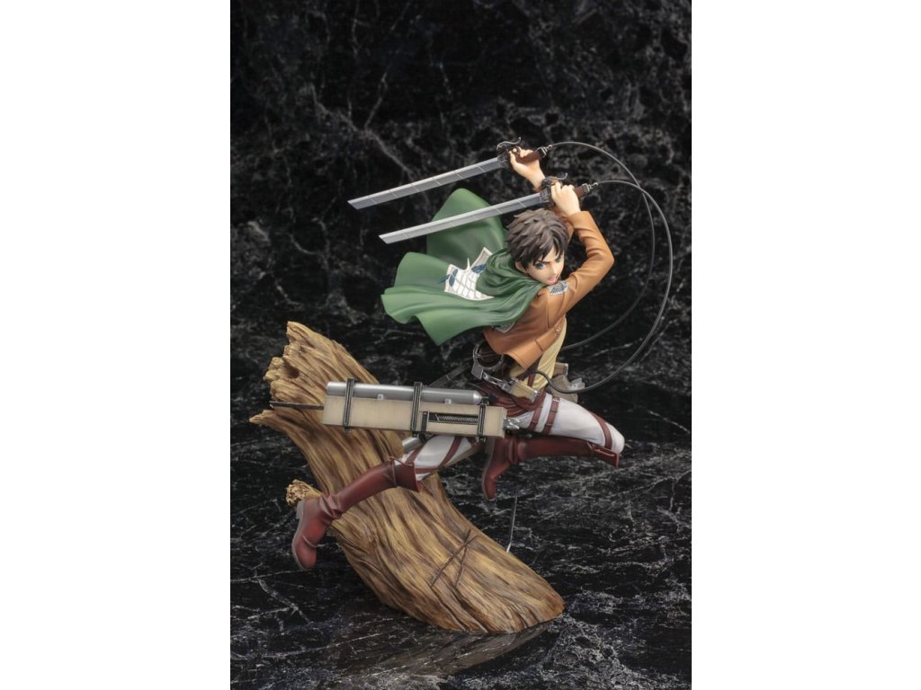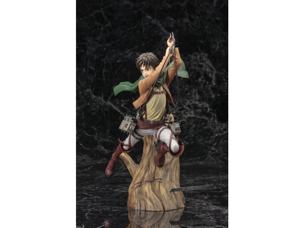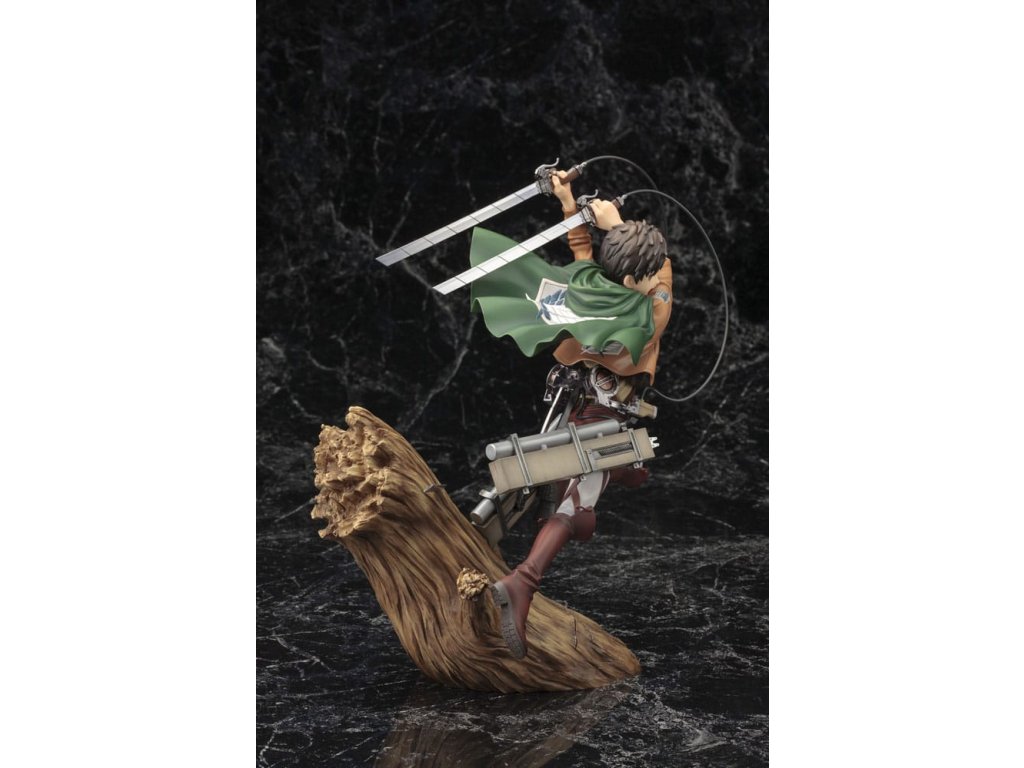 A Kotobukiya ARTFX J sorozat új dimenzióba lép! A népszerű "Attack on Titan" anime sorozat főszereplője, Eren Yeager most egy teljesen új csomagban csatlakozik az ARTFX J sorozathoz! A szobor dinamikus pózban van ábrázolva, amely egy erdei csata képeit idézi fel! Eren a szuperkemény kardjával a magasba emelve látható, amint éppen a Titánt támadja! Az Eren arcán megjelenő erős akarat és az általános póz a fő jellemzője ennek a szobornak; a lábak olyan természetesnek tűnnek, mintha Eren valóban a levegőbe ugrott volna. Eren szobra nyilvánvalóan részletgazdag, de a függőleges manőverező eszközt is olyan precizitással készítették el, hogy egyetlen rész sem veszítette el gépszerűségét. Emellett a szobor alapjául szolgáló nagy fa minden részletét aprólékosan kidolgozták: a kéregmintáktól kezdve a törzsön lévő karcolásokig. A szobor kétféle stílusban állítható ki, mivel levehető héjjal rendelkezik. *Ez a termék reprodukció.Kiegészítő paraméterek