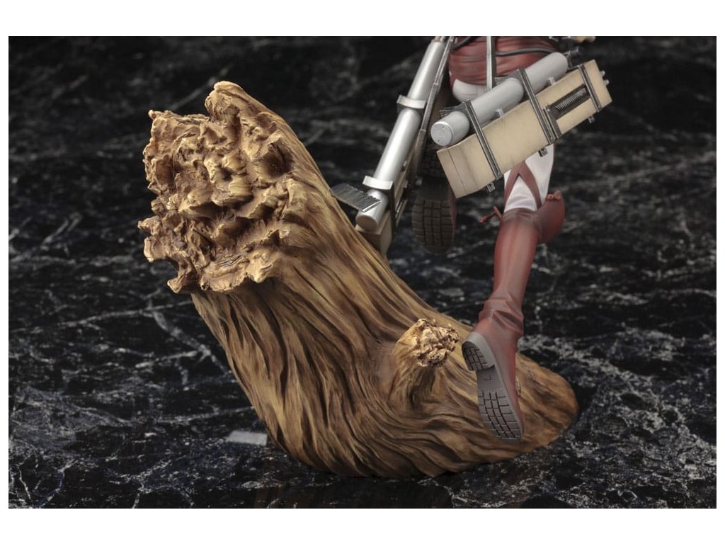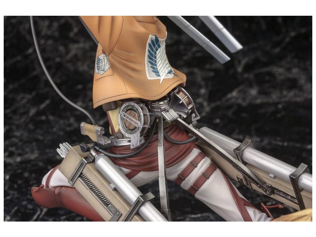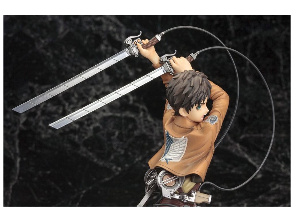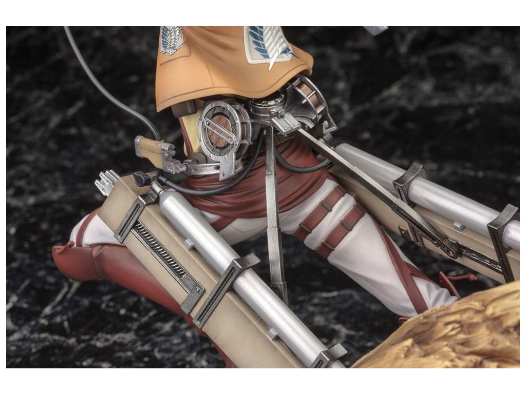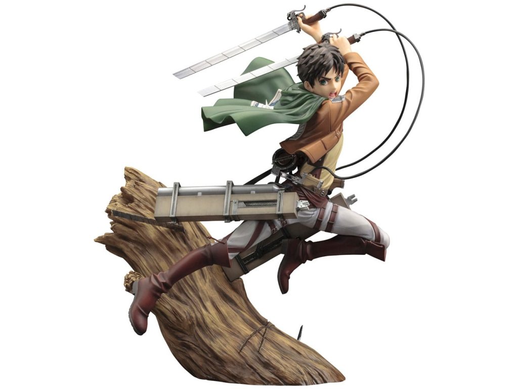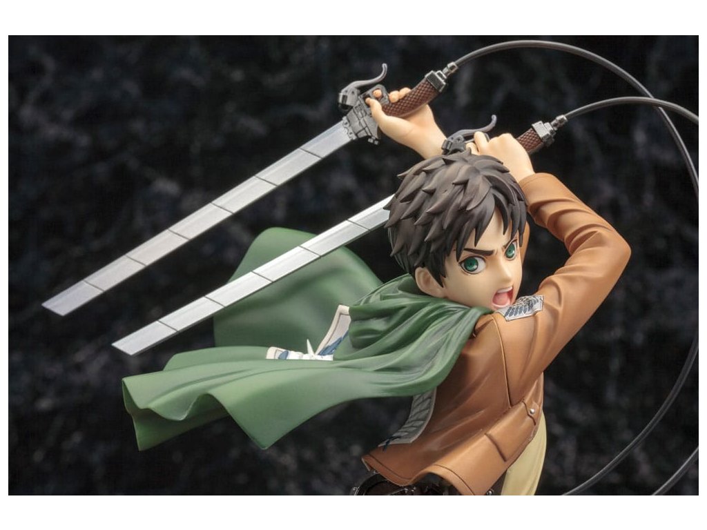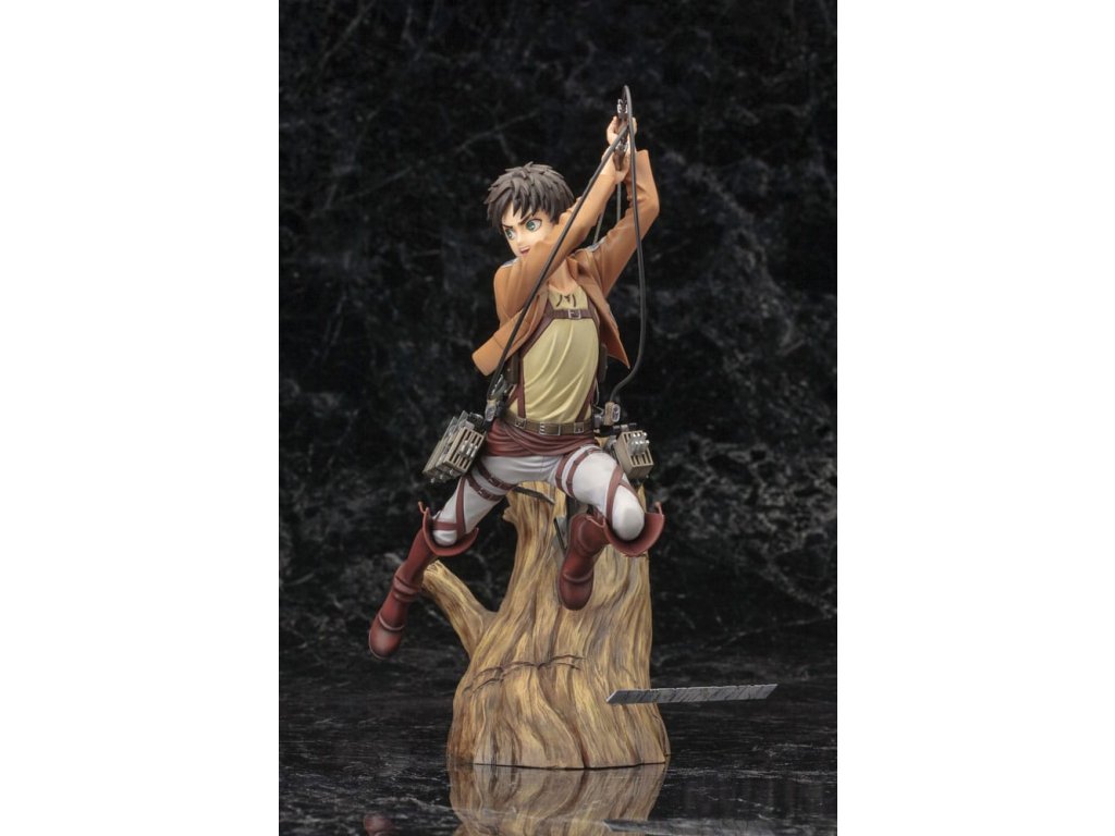 A Kotobukiya ARTFX J sorozat új dimenzióba lép! A népszerű "Attack on Titan" anime sorozat főszereplője, Eren Yeager most egy teljesen új csomagban csatlakozik az ARTFX J sorozathoz! A szobor dinamikus pózban van ábrázolva, amely egy erdei csata képeit idézi fel! Eren a szuperkemény kardjával a magasba emelve látható, amint éppen a Titánt támadja! Az Eren arcán megjelenő erős akarat és az általános póz a fő jellemzője ennek a szobornak; a lábak olyan természetesnek tűnnek, mintha Eren valóban a levegőbe ugrott volna. Eren szobra nyilvánvalóan részletgazdag, de a függőleges manőverező eszközt is olyan precizitással készítették el, hogy egyetlen rész sem veszítette el gépszerűségét. Emellett a szobor alapjául szolgáló nagy fa minden részletét aprólékosan kidolgozták: a kéregmintáktól kezdve a törzsön lévő karcolásokig. A szobor kétféle stílusban állítható ki, mivel levehető héjjal rendelkezik. *Ez a termék reprodukció.Kiegészítő paraméterek