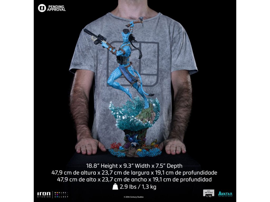 Miután átvándorolt az egzotikus és vad Panda tengerén, és egyesítette erőit a Metkayina klánnal a szigetvilágban, az Omaticaya klán bátor, bátor és rettenthetetlen vezetője alámerül az óceán vizébe, ahol buja, színes korallok és különc tengeri állatvilág buja növényzete között úszik, felkészül a harcra, hogy megvédje családját és klánját az Égi Nép betolakodóival szemben, bal vállán M69-es támadófegyverével, amely emberi tengerészként töltött napjait tükrözi, míg jobb kezében na'vi baltáját tartja! A James Cameron által közösen írt-adaptált-producált és rendezett sci-fi eposzból az Iron Studios bemutatja a "Jake Sully - Avatar: A víz útja - Art Scale 1/10" szobrot, amely az Avatar-franchise főszereplőjét ábrázolja, az Iron Studios második kiadványát, amelyet a folytatás ihletett, amely a 2022-es év legnagyobb bevételt hozó filmje volt, 4 Oscar-jelöléssel, a legjobb vizuális effektek díjával és számos más díjjal.2148-ban, amikor a Föld erőforrásai rohamosan fogynak, az Erőforrás-fejlesztési Hivatal (R.D.A.) egy Unobtainium nevű értékes ásványi anyag készleteit kezdte kutatni az Alpha Centauri Polyphemus egyik holdján, a Pandorán. Ehhez a bányászati művelethez az R.D.A. egykori katonákat és tengerészeket alkalmazott zsoldosként. Pandorát a na'vik lakják, kék bőrű, 9-10 láb magas, szénszállal megerősített farkú és csontozatú humanoid bennszülöttek, akik harmóniában élnek a természettel és imádják Ewou-t, az élet istennőjét. Mivel az emberek nem tudnak lélegezni a Panda légkörében, és a na'vikkal való konfliktusok következtében létrehozták az Avatar programot, amelyben idegkapcsolatokon keresztül mentálisan összekapcsolódnak genetikailag feljavított ember-na'vi hibrid testekkel. Jake Sully, a béna volt tengerészgyalogos pénzt keres egy műtéthez, amely meggyógyíthatná, és azért megy Pandorára, hogy genetikai hasonlóságuk miatt elhunyt testvérét helyettesítse a programban. Na'vi alakjában Neytiri, az Omaticaya klán hercegnője menti meg. Jake kapcsolatba kerül a na'vikkal, és az a feladata, hogy meggyőzze a klánt, hogy hagyják el a hatalmas Unobtainium-tartalék tetején álló szülőfájukat. De beleszeret Pandába, az ő kultúrájába és életmódjába, és Neytirivel kapcsolatot kialakítva és katonai felettesei ellen lázadva csatlakozik a klánhoz. Neytiri a leendő Tsahìk, klánjának szellemi vezetője, beleszeret Jake-be, és a hangok fája alatt megerősíti szerelmét. Az Avatar: A víz útja című filmben, több mint egy évtizeddel azután, hogy a na'vik visszaverték az emberi inváziót, Neytiri és Jake Sully az Omaticaya klán vezetőjeként családot alapítanak, miközben eligazodnak Panda kiterjesztett világában, és új szövetségeseket találnak, például a Metkayina klánt a Panda óceánjain. De minden megváltozik, amikor az R.D.A. ismét visszatér, hogy előkészítse Pandorát a gyarmatosításra, mivel a Föld meghal, és köztük vannak a Rekombinánsok, az elhunyt tengerészgyalogosok elméjével és emlékeivel beültetett Na'vi Avatárok, vezetőjük pedig a Rekombináns Cornel Miles Quaritch.A legmodernebb és leginnovatívabb fejlesztési és alkotási technikák, kiegészítve az Iron Studios csapatának tehetségével és csapatmunkájával, lenyűgöző eredményeket hoztak, amelyek a szobor szobrászatában és festésében a legapróbb részletekig visszaadják a Na'vi Avatar arcvonásait és anatómiáját, akit ismét Sam Worthington alakít Jake Sully szerepében. A november 30-án, csütörtökön, a CCXP 2023 Ultra Stage-en tartott panelbeszélgetésen bemutatott, majd az Iron Studios standján kiállított, világszerte már előrendelhető "Neytiri - Avatar: A víz útja - Art Scale 1/10" szobrot, a filmből készült eredeti Iron Studios-kiadványt, amelyet korábban a CCXP22-en mutattak be, és még sok más, hamarosan a közösségi médiában megjelenő szobrot keresd.Kiegészítő paraméterek