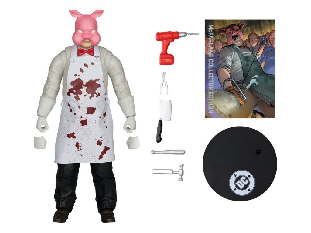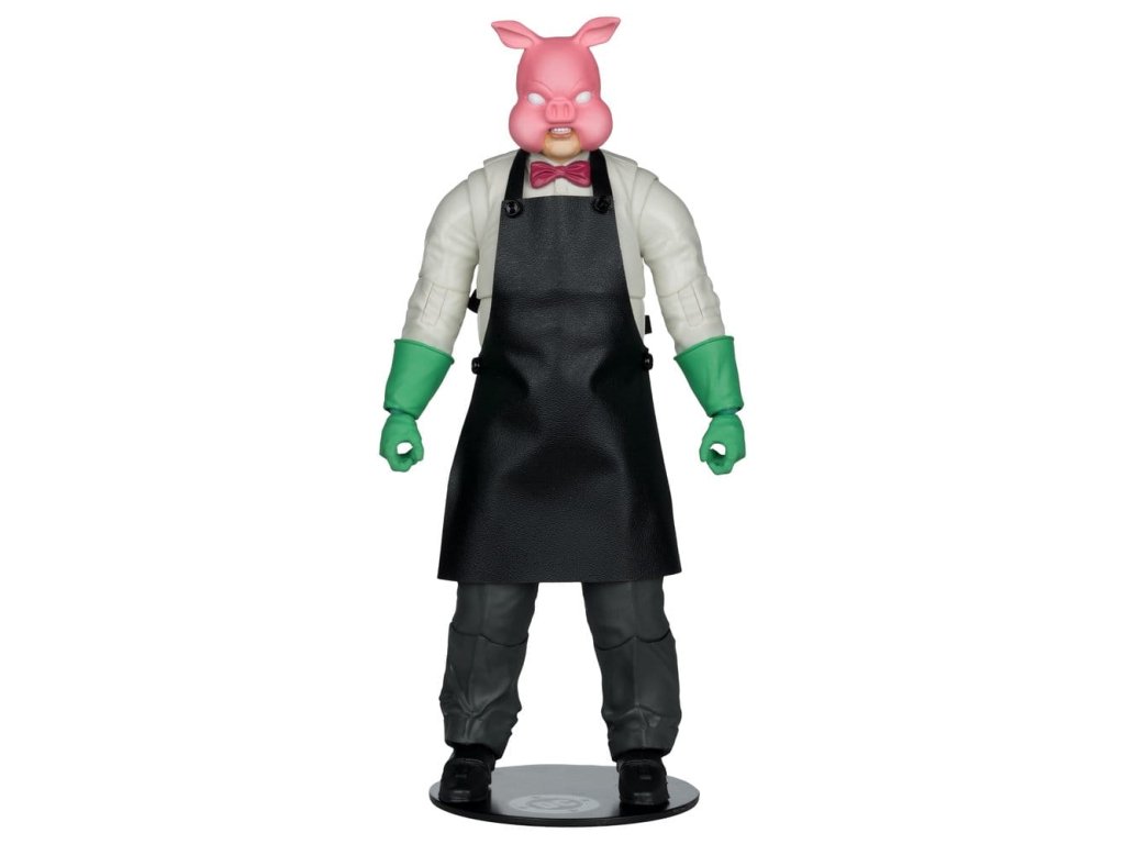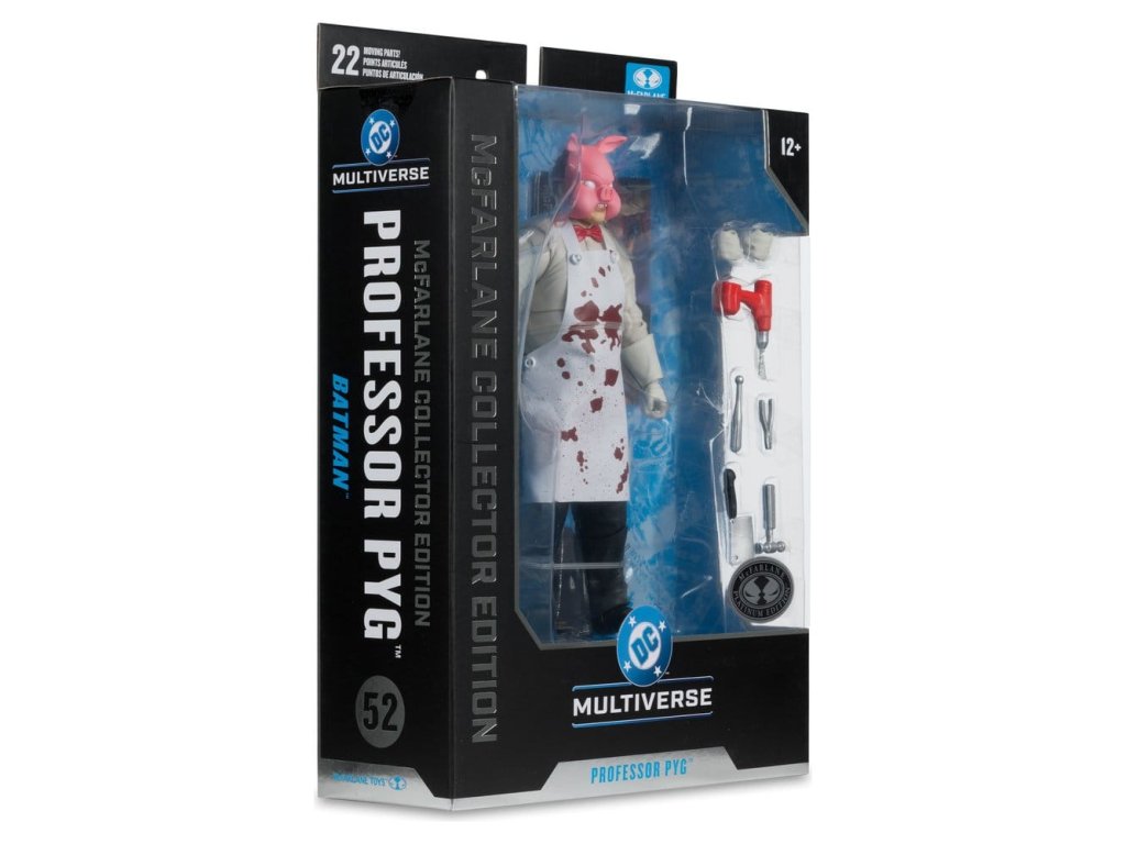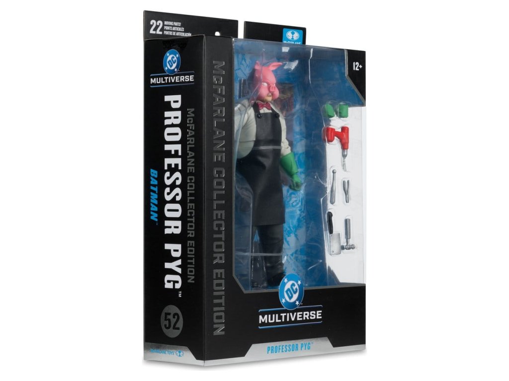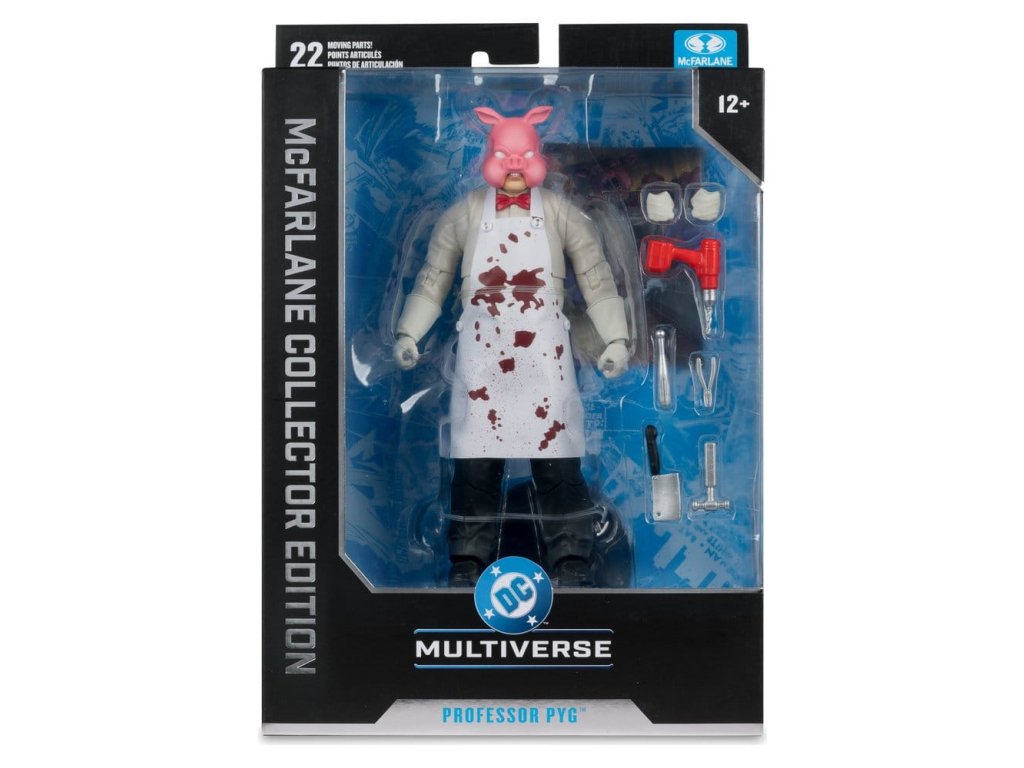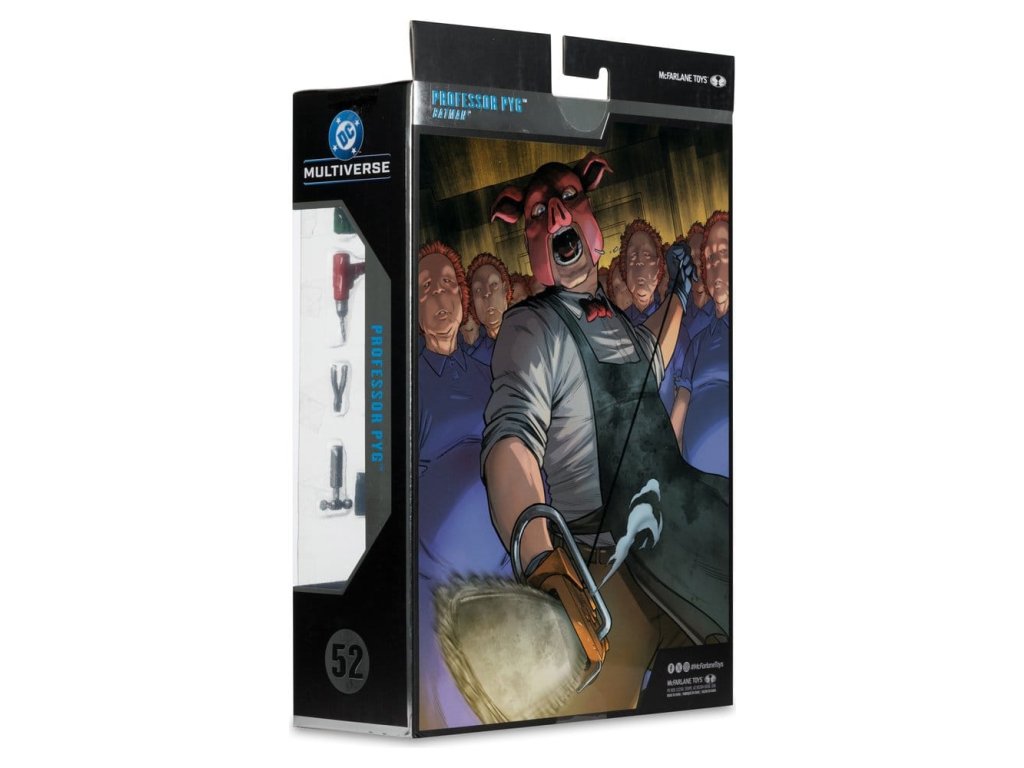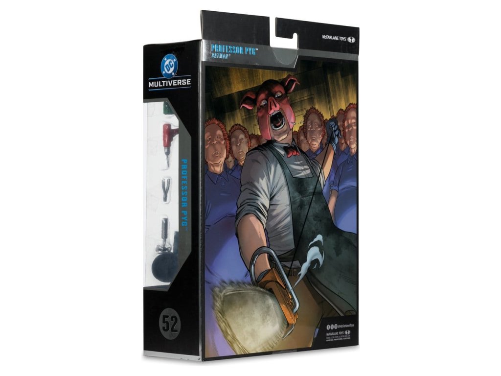 Dr. Dedalusnak a Spyral™-labirintusba való belépésével kiváltva Valentin Lászlóból Pyg professzor lett, aki disznómaszkot viselt. Pyg bűnei abból álltak, hogy elrabolta Gotham City™ szerencsétlen polgárait, és bizarr műtéteket hajtott végre rajtuk, majd babamaszkokat illesztett rájuk, amelyek engedelmes szolgákká, úgynevezett Dollotronokká™ változtatták őket. Mint irányított szabad szellem, Pyg gyakran nyit új "klinikákat". Legutóbbi ellenségei a Tini Titánok™, a Red Hood™ és a Törvényen kívüliek™, Nightwing™ és Batman™ voltak.- Hihetetlenül részletes, 7"-os méretarányú figura a DC MULTIVERSE™ alapján- Ultra Articulationval tervezve, akár 22 mozgó alkatrésszel a pózok és a játék teljes skálája érdekében- PROFESSOR PYG™, ahogyan a DC™-ben bemutatásra került. képregényekben- Tartalmaz fúrót, farönköt, 3 sebészeti eszközt, 2 extra kezet, kötényt és puha alapot- Tartalmaz gyűjtőkártyát a karakter képével az előlapon és a karakter életrajzával a hátoldalon- Gyűjtsd össze az összes DC MULTIVERSE™ figurát. by McFARLANE TOYS™- A fekete kötény a standard változat- A fehér véres kötény a feltűnő változat A figurával együtt szállított tényleges termék eltérhet az ábrától. Ebből a figurából létezik egy ritka Chase változat, ezek a változatok elsősorban a festés tekintetében térnek el a standard változattól, de lehetnek teljesen festetlenek vagy átlátszó műanyagból készültek is. A szállítás során a tárgyak kiválasztása teljesen véletlenszerű. Megközelítőleg megjelenési dátum: 2026. február.Kiegészítő paraméterek