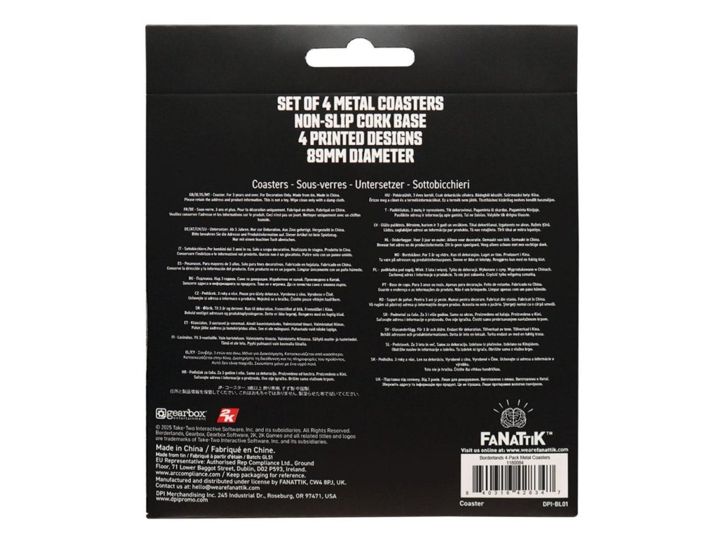 Élvezze a Pandora egy csipetnyi ízét minden kortyával! A Borderlands 4 darabos fém alátétkészlet a Vault-vadászok elengedhetetlen bárkelléke. Az alján csúszásmentes parafa, a tetején pedig a Borderlands világának képeivel ellátott fém felület található. Szerinted melyik ital illik a legjobban az egyes italokhoz? - Hivatalos engedéllyel - Négy minta - Fém felső rész parafa alappal - 89 mm átmérőjűKiegészítő paraméterek