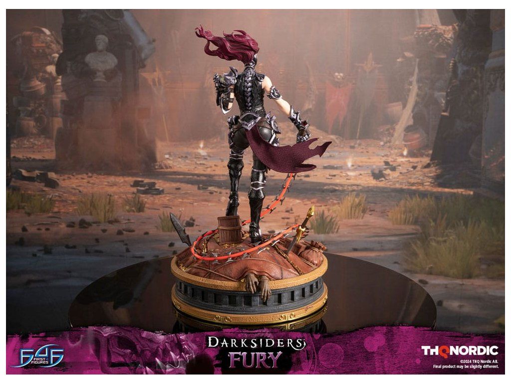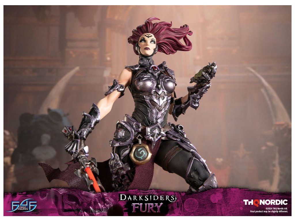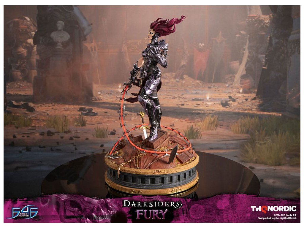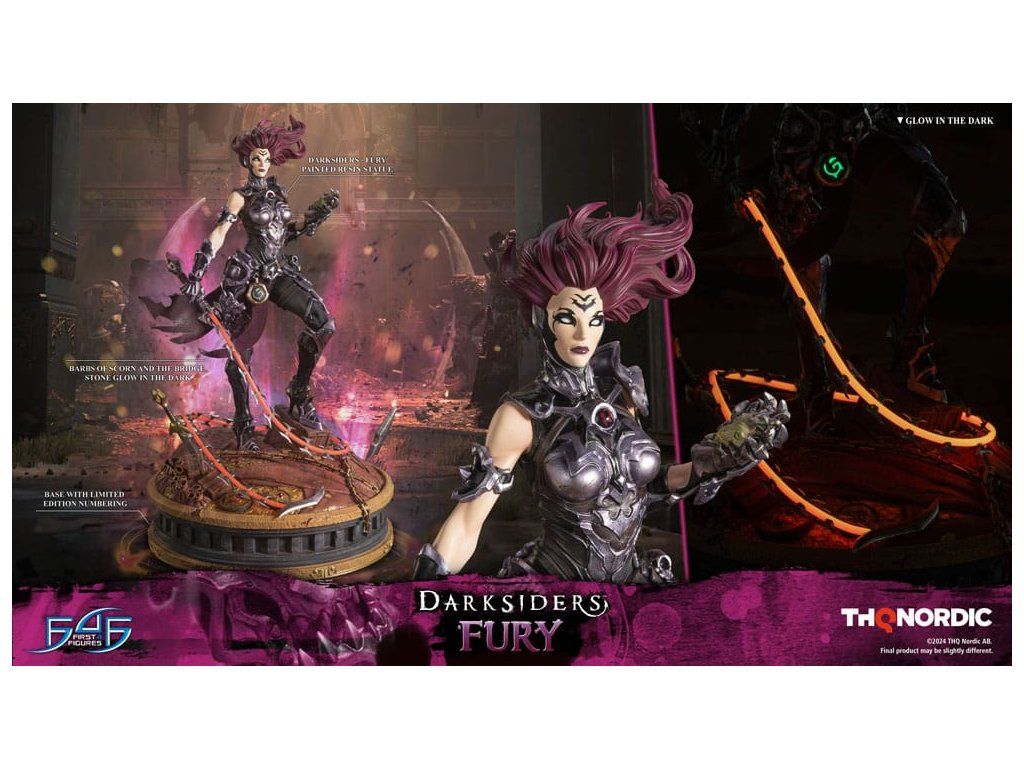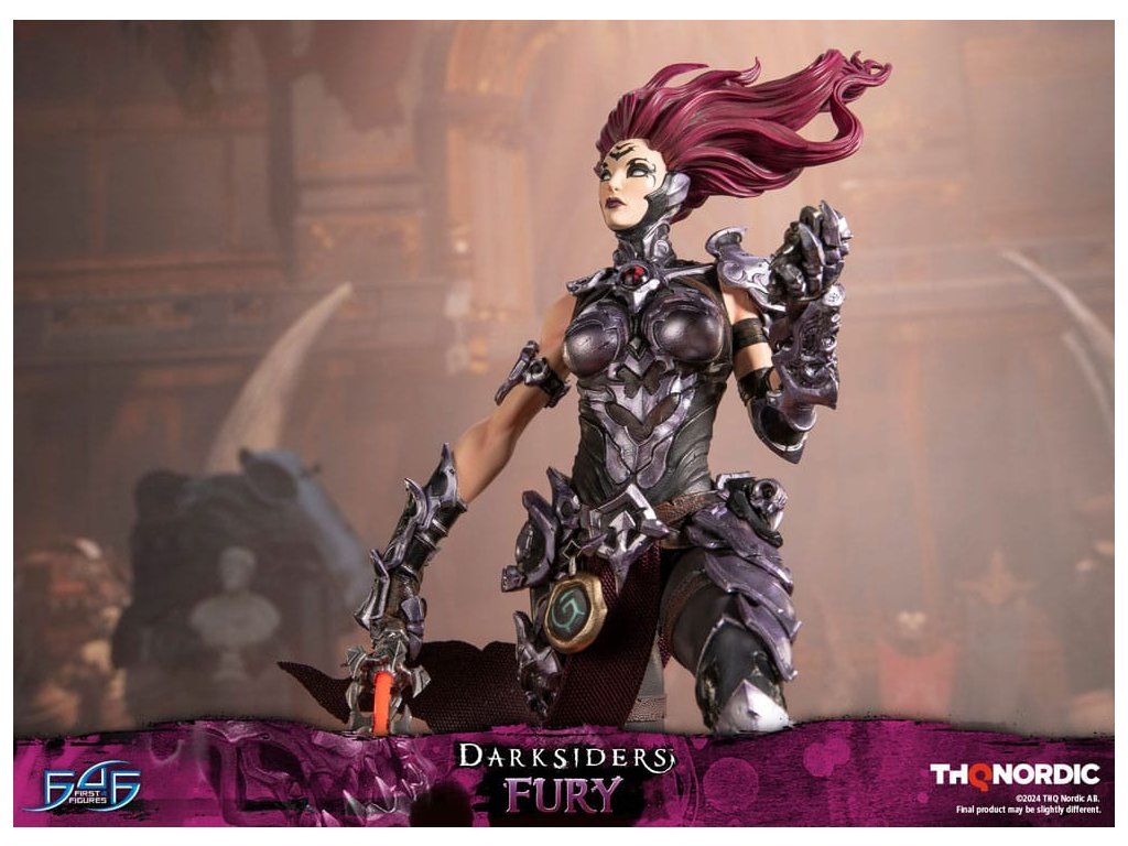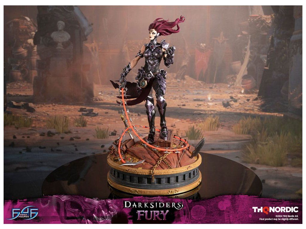 A szobor koncepcióját a Hét Halálos Bűn egyik tagjával, Avarice főnökével való küzdelem ihlette. Fury győztesként van ábrázolva, mintha csak legyőzte volna őt, bal kezében a Sin Talisman-talizmánnal hadonászva, hogy csapdába ejtse őt. Jobb kezében tartja ostorát, a Megvetés Tüskéit. A szobor gondosan ábrázolja Fury sötét, durva és bonyolultan kidolgozott páncélját, az övére erősített Hídkővel együtt. Ezenfelül a Spikes of Contempt és a Bridge Stone sötétben világító funkcióval rendelkezik. A talapzaton Avarice kincsekkel teli zsákja látható, míg az aljzatot a múzeum területének arany díszítésű határai ihlették. A Darksiders - Fury a következőket tartalmazza: - Darksiders - Fury műgyanta festett szobor - A Darksiders művészeti stílusa által inspirált, rendkívül részletes alap - A Spikes of Contempt és a Bridge Stone világító funkció - Korlátozott példányszámú számozás és hitelesítő kártya.Kiegészítő paraméterek