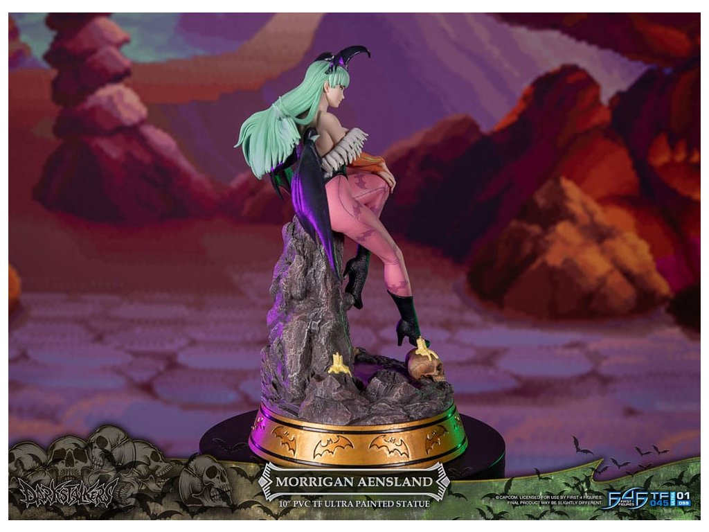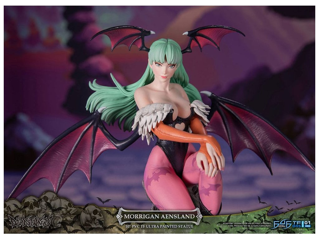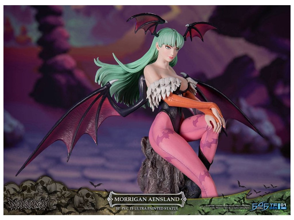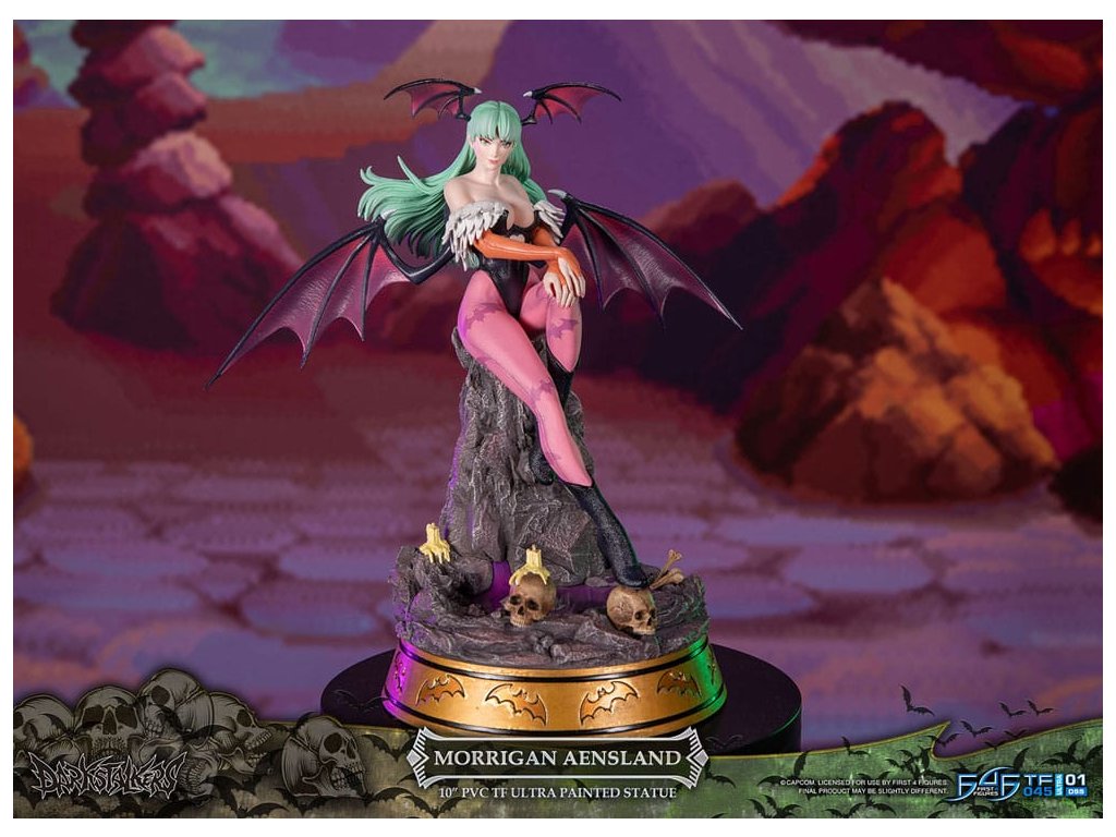 A First 4 Figures büszkén mutatja be legújabb gyűjthető szobrát, Morrigan Aenslandet! Ez az első szobor a vadonatúj Darkstalkers sorozatban. Morrigan a híres Aensland család magabiztos, csábító, érzéki succubusa. Ő a következő a démoni Makai Birodalom trónjának sorában, miután örökbefogadó apja, Belial Aensland meghal. Ereje, személyisége és viselkedése teszi őt egyedivé és mindenki által szeretetté, sőt, még e szobor koncepcióját is ő ihlette. Attól kezdve, ahogyan a lábai állnak, egészen addig, ahogyan a kezeit a térdére támasztja, könnyen érezhető a bájos és érzéki természete. A talapzat dizájnja a The Abandoned Shroud című játékban szereplő Morriganről származik. A jelenet előterében és hátterében számos sziklaalakzat található, mintha a játékosok egy barlangban harcolnának. Ami a koporsót, a lila tócsát, a koponyákat és a gyertyákat illeti a bázison, ezek olyan részletek, amelyek a The Abandoned Shroud hátterében is megtalálhatók. A koporsó a jelenet bal szélén fekszik, jobbra pedig egy lila folyadékból álló, gyertyák által megvilágított tócsa, amelyben koponyák és csontok lebegnek. A Darkstalkers- Morrigan Aensland (PVC TF Ultra) a következőket tartalmazza:- Darkstalkers- Morrigan Aensland PVC festett szobor- Rendkívül részletes alap, amelyet a Darkstalkers művészeti stílusa ihletett.Kiegészítő paraméterek
