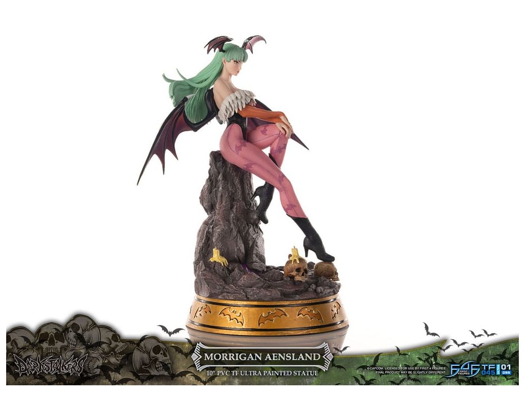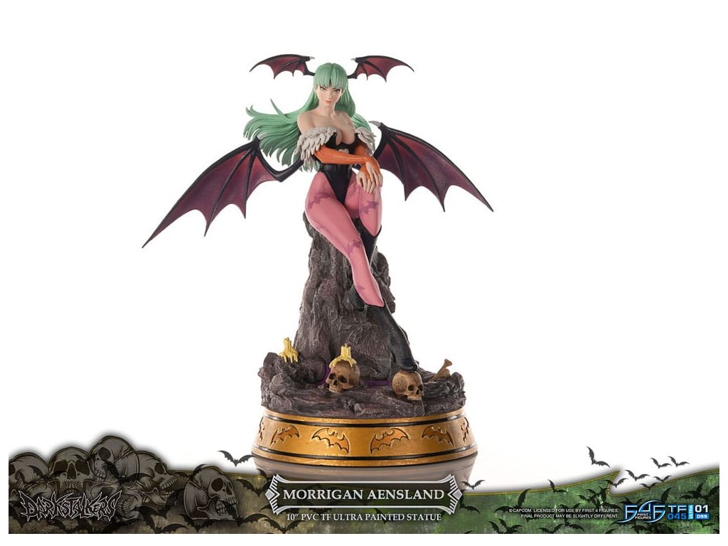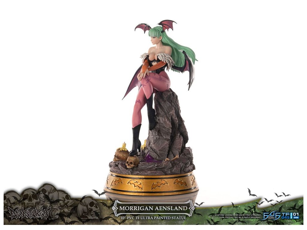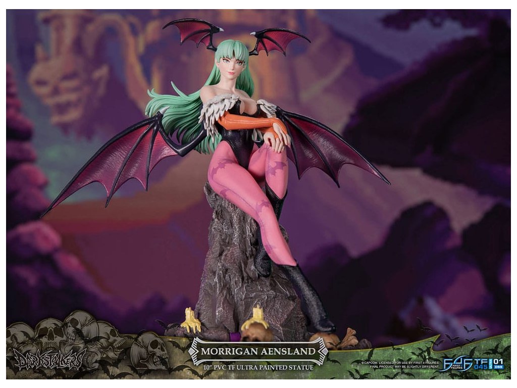 A First 4 Figures büszkén mutatja be legújabb gyűjthető szobrát, Morrigan Aenslandet! Ez az első szobor a vadonatúj Darkstalkers sorozatban. Morrigan a híres Aensland család magabiztos, csábító, érzéki succubusa. Ő a következő a démoni Makai Birodalom trónjának sorában, miután örökbefogadó apja, Belial Aensland meghal. Ereje, személyisége és viselkedése teszi őt egyedivé és mindenki által szeretetté, sőt, még e szobor koncepcióját is ő ihlette. Attól kezdve, ahogyan a lábai állnak, egészen addig, ahogyan a kezeit a térdére támasztja, könnyen érezhető a bájos és érzéki természete. A talapzat dizájnja a The Abandoned Shroud című játékban szereplő Morriganről származik. A jelenet előterében és hátterében számos sziklaalakzat található, mintha a játékosok egy barlangban harcolnának. Ami a koporsót, a lila tócsát, a koponyákat és a gyertyákat illeti a bázison, ezek olyan részletek, amelyek a The Abandoned Shroud hátterében is megtalálhatók. A koporsó a jelenet bal szélén fekszik, jobbra pedig egy lila folyadékból álló, gyertyák által megvilágított tócsa, amelyben koponyák és csontok lebegnek. A Darkstalkers- Morrigan Aensland (PVC TF Ultra) a következőket tartalmazza:- Darkstalkers- Morrigan Aensland PVC festett szobor- Rendkívül részletes alap, amelyet a Darkstalkers művészeti stílusa ihletett.Kiegészítő paraméterek