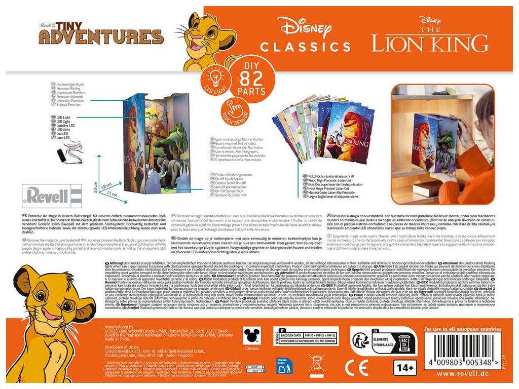 Fedezze fel a könyvtárában rejlő varázslatot: a könnyen összeszerelhető Könyvsarokkal lenyűgöző miniatűr világokat hozhat létre, amelyek elbűvölő hangulatot kölcsönöznek bármely könyvgyűjteménynek! A precíz dugós rendszer nagyszerű építési szórakozást kínál garantált sikerrel! A kiváló minőségű nyomtatott és lézerrel faragott fa alkatrészek és a hangulatos LED-es hangulatvilágítás ragyogóvá teszi a darabot. Az elemeket nem tartalmazza! Az apró részletekhez faragó ragasztó szükséges. Nem tartozék. Kiváló minőségű fakészlet, LED-ek elemes dobozzal, összeszerelési útmutató.A Revell Mini Adventures kézzel készített, LED-es világítással összeszerelhető miniatűr fából készült világok. 2 db LR03 elemet igényel, nem tartozék.Méretek: kb. 18 x 11 x 23 cm.Kiegészítő paraméterek