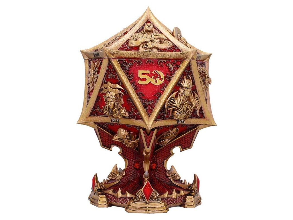 A Dungeons & Dragons 50. évfordulója alkalmából készült exkluzív gyűjtői doboz, amely egy 20 oldalú kocka alakú. A doboz részletes 3D arany művészi ábrázolást tartalmaz a D&D ikonikus gonosztevőiről és szörnyeiről, mint például Vecna, Beholder és még sokan mások. A dobozhoz tartozik egy levehető fedél is, amely egy vörös bársonybelsőt tár fel. Egy hivatalosan engedélyezett D&D bemutató dobozba csomagolva a biztonságos szállítás és a megnövekedett gyűjtési érték érdekében, tökéletes a boltokban való bemutatásra vagy a rajongóknak ajándékba. Ideális a régóta D&D-játékosoknak, fantasy emléktárgyak gyűjtőinek, TTRPG-rajongóknak és ajándékvásárlóknak, akik a franchise évfordulójának megünneplésére keresnek egy különleges darabot. Ünnepeld meg a kalandok öt évtizedét ezzel a kézzel festett évfordulós dobozzal, amely a D&D rajongók számára kötelező gyűjtőeszköz, és bármely fantasy-kiállítás fantáziadús központi darabja.Kiegészítő paraméterek