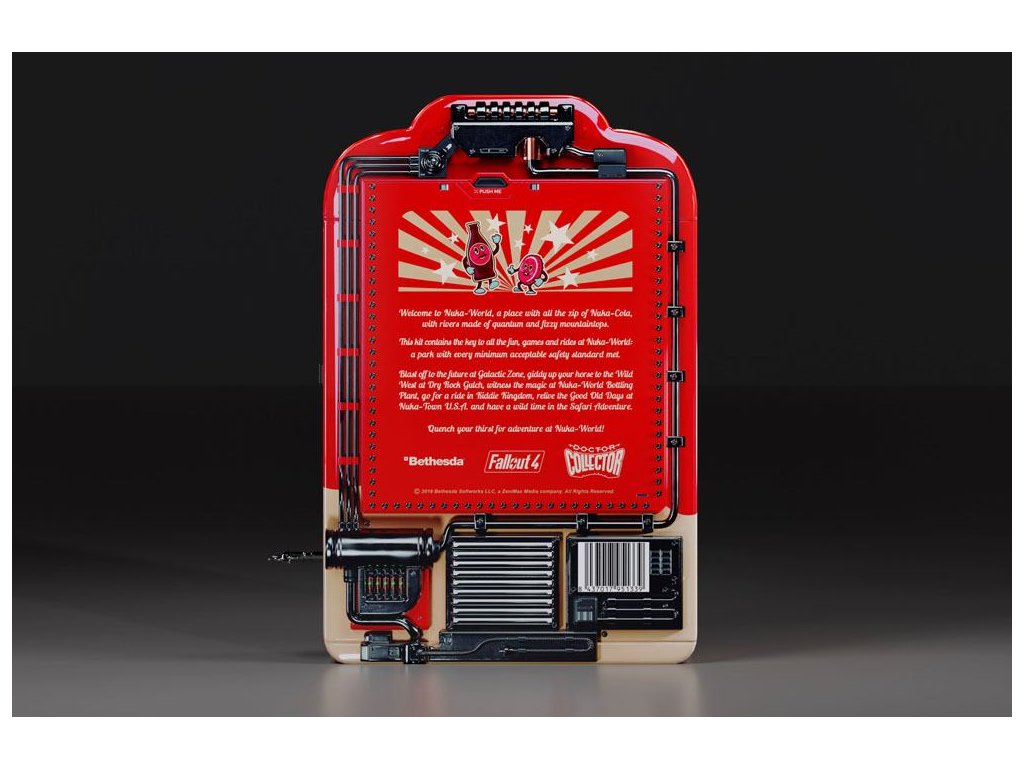Üdvözöljük a Fallout Nuka-világban, egy pezsgő Nuka-kólával teli helyen, kvantumfolyókkal és szénsavas hegycsúcsokkal. Ez a készlet tartalmazza a kulcsot az összes mókához, játékhoz és látnivalóhoz itt a Nuka-Worldben, a minimális biztonsági előírásoknak megfelelő parkban. Sétálj a csillagok között vagy repülj a jövőbe a Galaktikus Zónában, exportálj aranyat Mad Mulligan-nel a Dry Rock Gulch-ban, üzletelj a majmokkal a Safari Kalandban. A csomag tartalma: - Nuka Cola automata ihlette tok, animált képernyővel - Nuka-World főcímdalt játszó zenedoboz - Jegy a Nuka-World témaparkba - Kapsz egy - Nuka-World témapark útmutatót, amely részletezi a parkban található látnivalókkal kapcsolatos információkat és korlátozásokat - Nuka-World térkép, amely részletezi a parkban található összes látnivaló elhelyezkedését. - VIP kulcstartó és útlevél a parkba - Nuka-World parki kabalák - kitűző üveg és Cappy - Nukacade Token - Nuka-Case gépeken adható ki, hogy különböző nyereményekre szóló jegyeket nyerhessen. - Nuka-World Palackkupak-gyűjtemény - 4 palackkupak - 1 Nuka-Cade jegy, amellyel a játékteremben lévő nyereményterminálon tárgyakat és fegyvereket lehet vásárolni - 1 Grandchester Mystery Museum jegy, amellyel beléphetsz a látványosságba. - Keresd meg az elrejtett Cappy-k szórólapját - Megtalálod az összes elrejtett Cappy-t, ez a szórólap biztosan segít - Palack és Cappy matrica - NukaWorld poháralátét - Cappy őrült szívószál a sok Nuka-Cola megivásához.