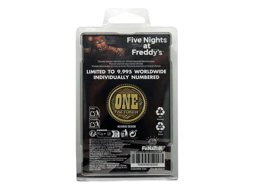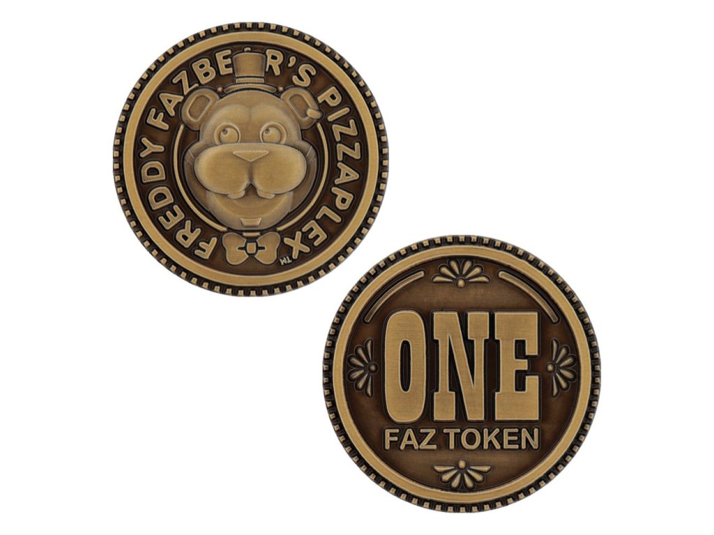A Faz-Token, amelyet először a Freddy Fazbear's Pizzeria Simulatorban mutattak be, egy gyűjthető fizetőeszköz, amely több Five Nights at Freddy's játékban is megtalálható. Ez a limitált, 38 mm átmérőjű, világszerte 9.995 darabból egyenként számozott érme-replika - Hivatalos licenc - 9.995 darabra limitált - Egyedi számozás a peremén - 38 mm átmérőjű - Egyedi számozás a peremenKiegészítő paraméterek