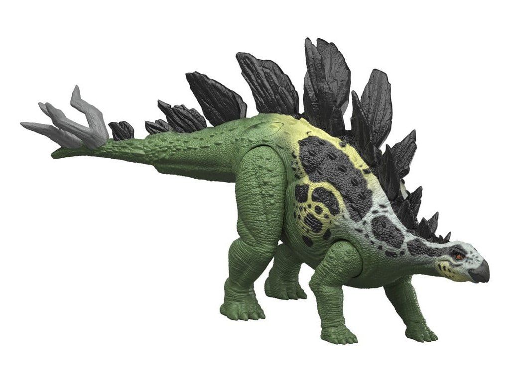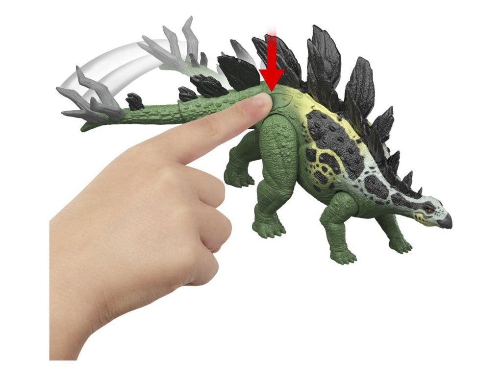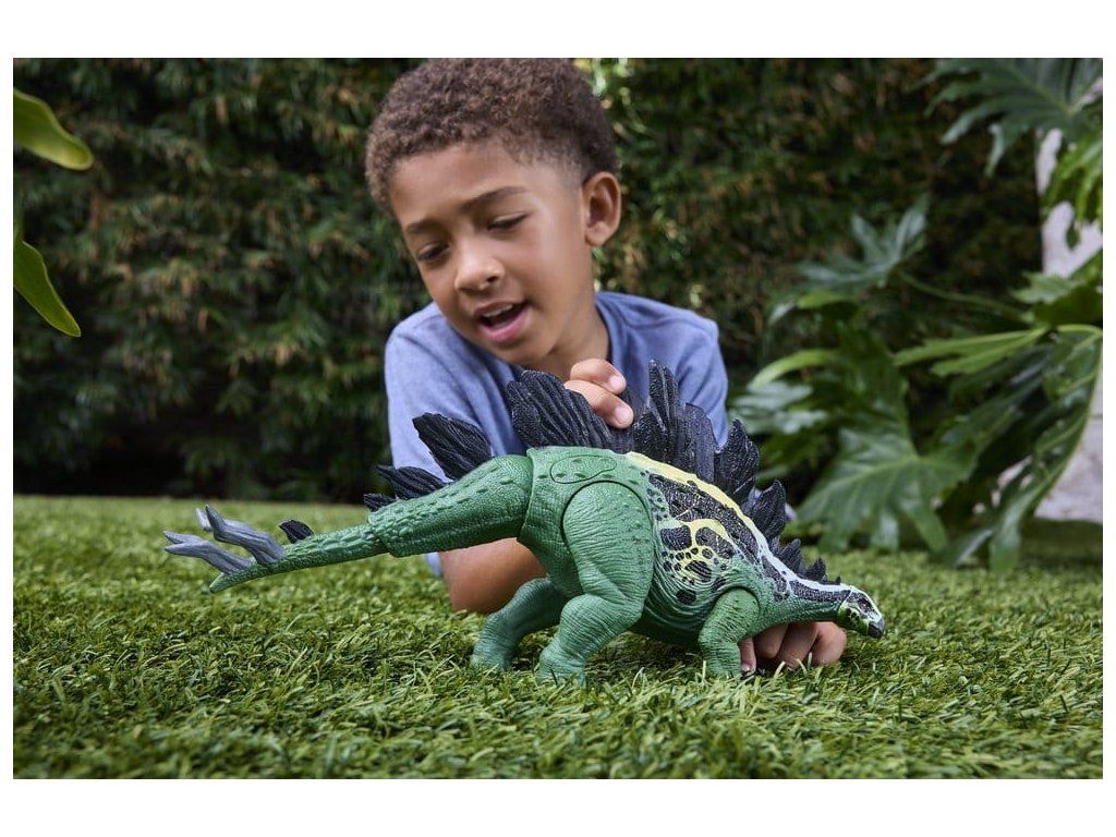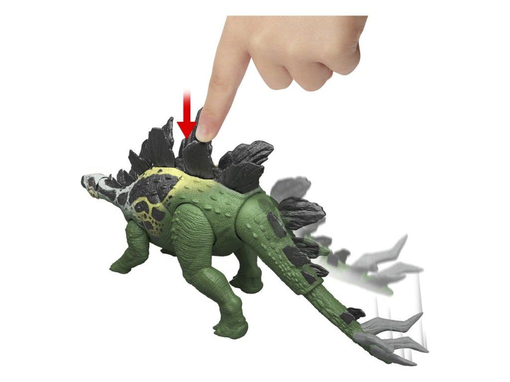 A Jurassic Worldből ismert óriás stegosaurusz figurája két látványos támadási mozdulatot tud végrehajtani, és evolúciós funkcióval is rendelkezik. Az oldalán lévő gomb aktiválja a drámai támadást a farok oldalra történő használatával. A hátsó lemezen lévő gomb megnyomásával a felfelé irányuló támadás aktiválódik, a faroklemez pedig kitágul, lehetővé téve egy intenzívebb támadást. A körülbelül 34 cm hosszú, autentikus dizájnnal, díszítéssel és textúrával rendelkező, nagyméretű, általános játék készen áll a harcra vagy vad pózolásra. A stegosaurus lábán található nyomkövető kód beolvasása az ingyenes Jurassic World Play alkalmazásban egy kompatibilis okoseszközzel (Android vagy iOS, nem tartozék) feloldja a dinoszaurusz digitális változatát, valamint egy szórakoztató játékot, amelyben különböző járművek versenyeznek egymással szárazföldön, levegőben és vízen. Ez a játék 4 éves kortól alkalmas a dinoszauruszok rajongóinak. A színek és a minták változhatnak.