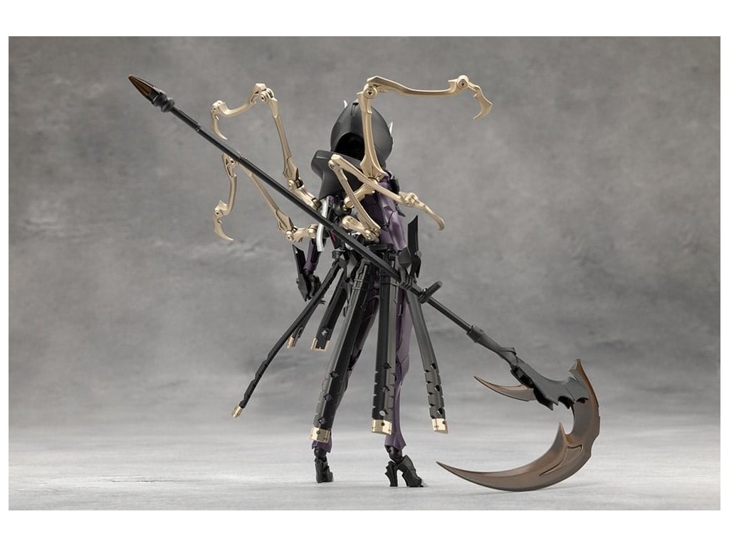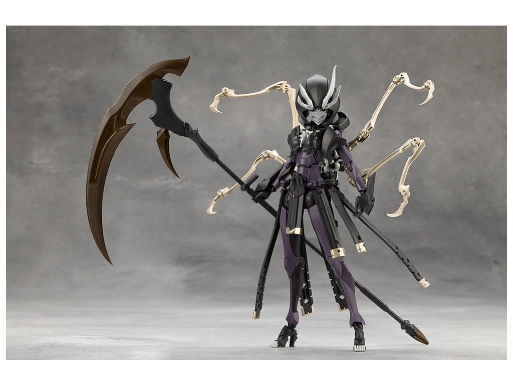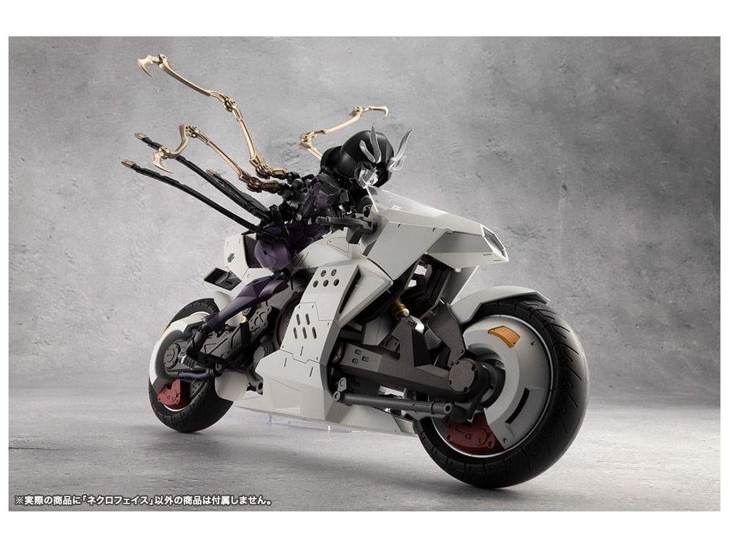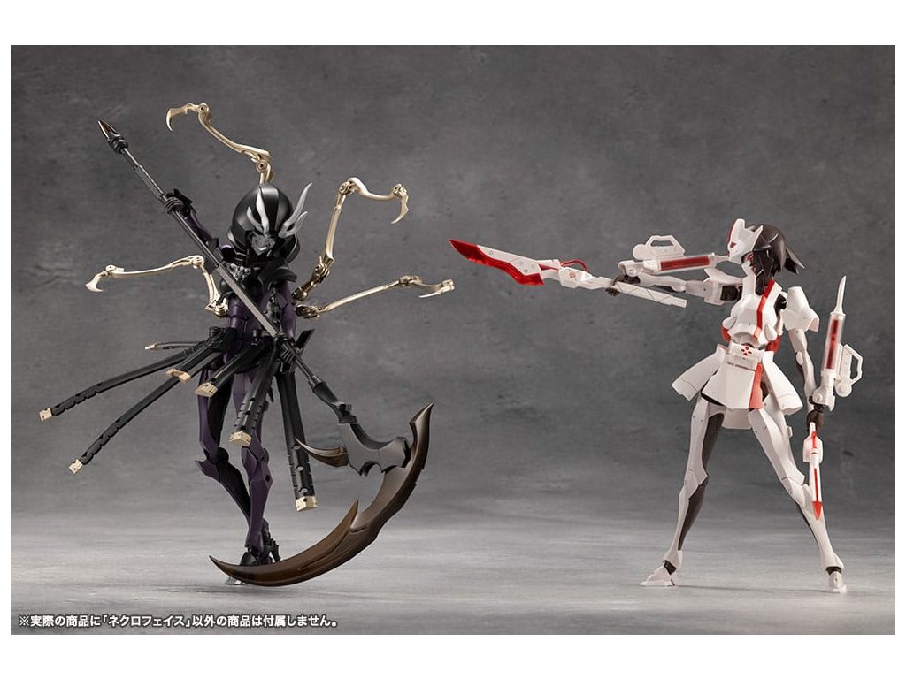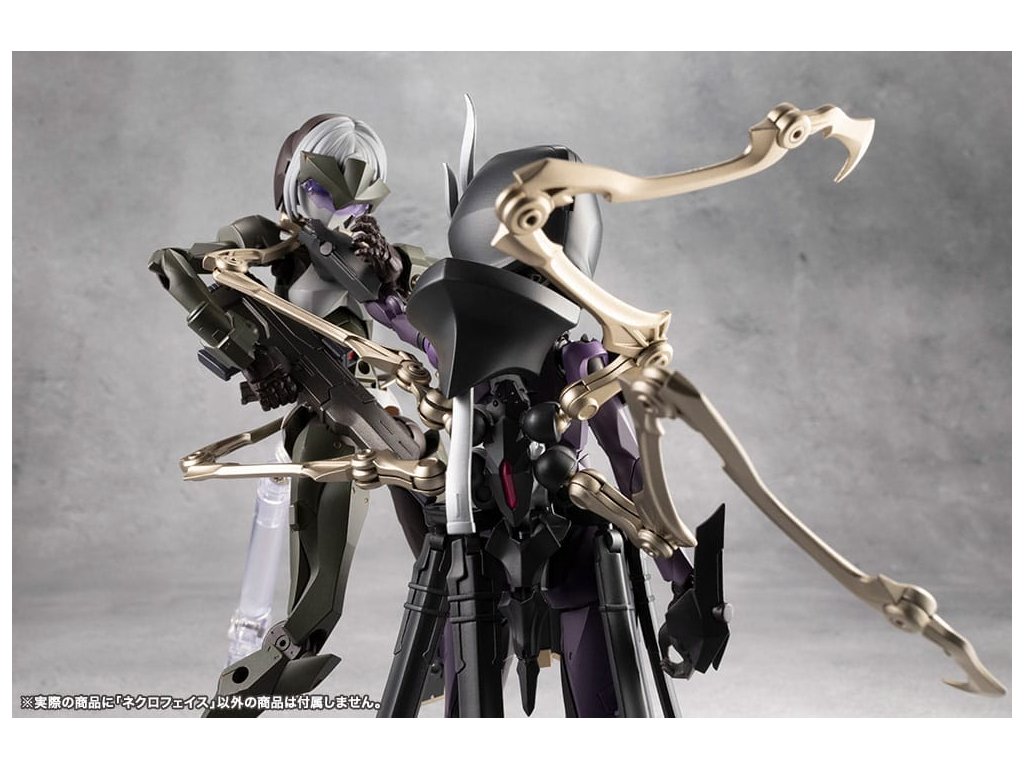 Bemutatunk egy vadonatúj, Kaszás ihlette boss karaktert, Necro Face-t! Necro Face egy DX elem, amely a Halál kaszájával és Exarmor Necromancer páncéllal van felszerelve. Exarmor Necromancer: ez a páncél tartalmaz egy csuklyát és egy levehető koponyát. A koponya maszk mögötti alapmaszk három szemmel rendelkezik, a homlokába egy harmadik szemet véstek. A szemek mozgathatóak, és a mellékelt szerszámmal vagy a Halál kaszája hegyének végével állíthatók. A maszk kicserélhető más női Megalomaria típusok és Sousai Shojo Teien karakterek arcára. A páncél nélküli vizor a Sousai Shojo Teien karakterek hajrészleteire is cserélhető. Még a csuklyával együtt is felhelyezhetőek egyes karakterek hajrészletei. Madoka Yuki, Emma Koishikawa, Koyomi Takanashi, Eimi Nijimura és a Short Wig hajrészek felcsatolhatók. *Nem kompatibilis Ao Gennai és Bukiko Kotobuki arc- és hajrészekkel. A hátul lévő négy mesterséges kar mozgatható, és ki- és behúzható. Az alap 4 mm-es gömbcsuklós, így Megalomaria női karjait is fel lehet csatolni, hogy egy hatkarú figurát hozzon létre. A páncéldarabok gömbcsuklós csuklóval vannak összekötve, és több csuklós ponton is mozgathatóak, ami sokféle dinamikus póz kialakítását teszi lehetővé. A hosszúkás műkarok eltávolíthatók és a mágus személyes alakjaként is használhatók. A halál kaszája: A halál kaszája egy nagyméretű fegyver, amelyet a halálfaló kaszája után terveztek. A penge átlátszó műanyagból készült, és ki lehet cserélni, hogy a Halál kaszája alapformáját mágikus botra változtassa. Az alsó hegye + alakú, és a Necro Face Mask szemeinek mozgatására használható. Extended Skin Parts: A Extended Skin Parts, amelyek nagy visszhangot kaptak az első bejelentésük után, szintén a műanyag női testmodellekkel, például a Sousai Shojo Teiennel való kompatibilitás növelése érdekében kerültek bele. Az alkatrészek egy halvány C bőrszínt használnak, amely jól illik a Sousai Shojo Teien Kuon Yakushiji [Maria Kagaribi jelmez] karakterhez. Artikuláció: A modell körülbelül 50 pontnyi artikulációval rendelkezik az egész testén. A térdízület egyetlen ízületi rétegből áll, és eléggé hajlítható ahhoz, hogy a modell felhúzott térddel ülhessen. A térdpáncél önállóan mozoghat, és a kívánt pozícióba állítható. A karok több ízületből állnak, és előre mozgathatók, hogy keresztbe tett karú pózt hozzanak létre. A vállak körüli mozgástartomány szintén sokféle pózt támogat, például a dinamikus, egész testet átfogó pózokat és a kétkezes kardállásokat. A törzs is kiváló mozgástartományt biztosít, lehetővé téve a karakter számára, hogy fekvő pózba helyezkedjen. A nyak minden irányba mozoghat, lehetővé téve az olyan pózokat, ahol a fej oldalra van fordítva. A könyök mélyen behajlik, lehetővé téve az olyan aranyos pózokat, mint például a kéz arcára helyezése. A jobb és bal csípőízület mind a négy irányban önállóan mozoghat, széles előre irányuló mozgással, amely lehetővé teszi a felhasználók számára, hogy hihetetlenül sokféle pózt hozzanak létre az ülő, keresztbe tett lábaktól a magasra rúgásokon át a guggolásig. A hátpáncélnak van egy egyrészes változata is, amely nem oszlik jobb és bal részre, és szabadon használható. Hárompontos csukló: a csuklót úgy tervezték, hogy majdnem 180 fokban befelé hajoljon, lehetővé téve a fix pont előrefordulását. A csuklópáncélhoz a Seeker és a Grin Dollhoz tartozó (külön megvásárolható) Hysteria Blades pengék csatlakoztathatók. A csomag tartalmazza:Necro arcmodell x1Koponya maszk x1Hétféle kézalkatrészKasza a halálból (kasza) x1 Átlátszó mágikus botalkatrészek x1Szabályos csuklóízület és rés x1 (bal és jobb)Egyrészes hátpáncél x1 Bővített bőrszínű C alkatrészek ×1 Szett.Kiegészítő paraméterek