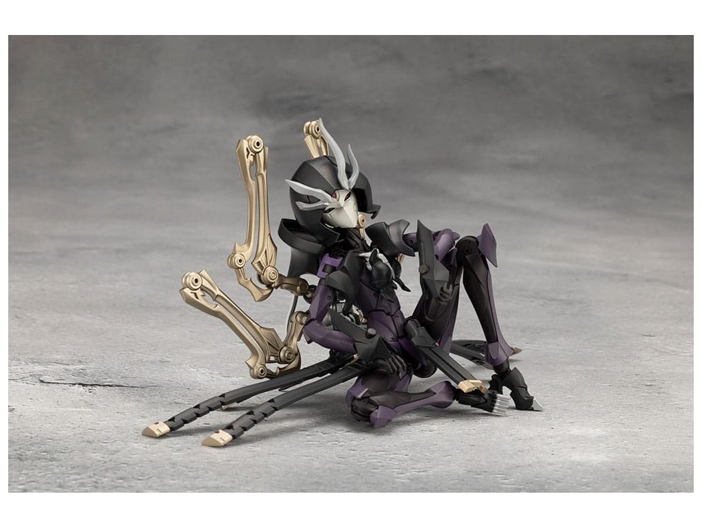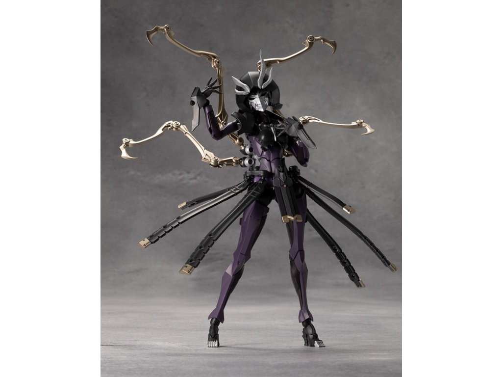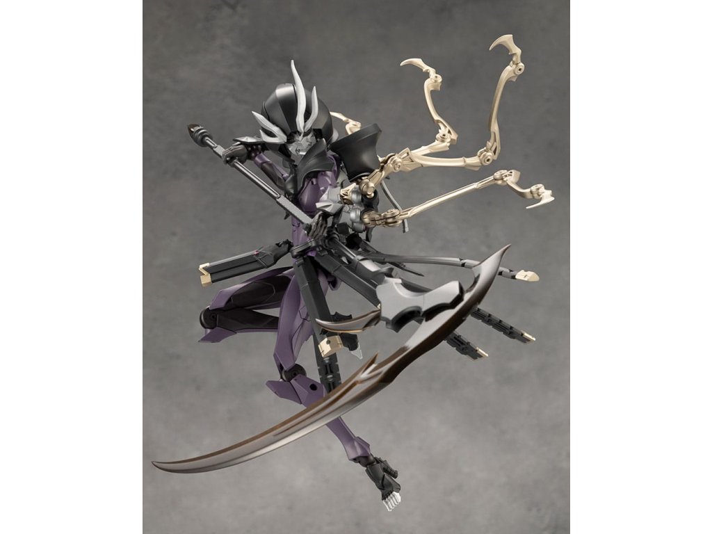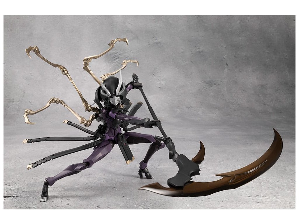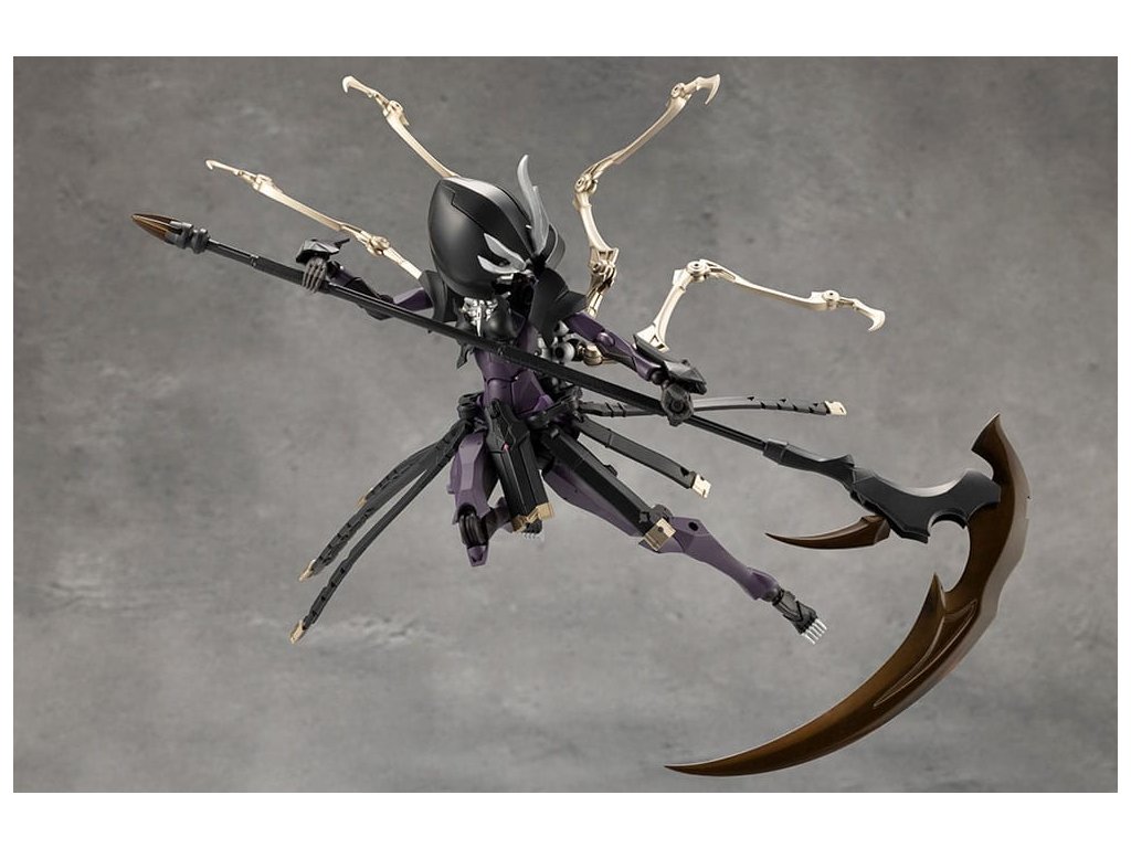 Bemutatunk egy vadonatúj, Kaszás ihlette boss karaktert, Necro Face-t! Necro Face egy DX elem, amely a Halál kaszájával és Exarmor Necromancer páncéllal van felszerelve. Exarmor Necromancer: ez a páncél tartalmaz egy csuklyát és egy levehető koponyát. A koponya maszk mögötti alapmaszk három szemmel rendelkezik, a homlokába egy harmadik szemet véstek. A szemek mozgathatóak, és a mellékelt szerszámmal vagy a Halál kaszája hegyének végével állíthatók. A maszk kicserélhető más női Megalomaria típusok és Sousai Shojo Teien karakterek arcára. A páncél nélküli vizor a Sousai Shojo Teien karakterek hajrészleteire is cserélhető. Még a csuklyával együtt is felhelyezhetőek egyes karakterek hajrészletei. Madoka Yuki, Emma Koishikawa, Koyomi Takanashi, Eimi Nijimura és a Short Wig hajrészek felcsatolhatók. *Nem kompatibilis Ao Gennai és Bukiko Kotobuki arc- és hajrészekkel. A hátul lévő négy mesterséges kar mozgatható, és ki- és behúzható. Az alap 4 mm-es gömbcsuklós, így Megalomaria női karjait is fel lehet csatolni, hogy egy hatkarú figurát hozzon létre. A páncéldarabok gömbcsuklós csuklóval vannak összekötve, és több csuklós ponton is mozgathatóak, ami sokféle dinamikus póz kialakítását teszi lehetővé. A hosszúkás műkarok eltávolíthatók és a mágus személyes alakjaként is használhatók. A halál kaszája: A halál kaszája egy nagyméretű fegyver, amelyet a halálfaló kaszája után terveztek. A penge átlátszó műanyagból készült, és ki lehet cserélni, hogy a Halál kaszája alapformáját mágikus botra változtassa. Az alsó hegye + alakú, és a Necro Face Mask szemeinek mozgatására használható. Extended Skin Parts: A Extended Skin Parts, amelyek nagy visszhangot kaptak az első bejelentésük után, szintén a műanyag női testmodellekkel, például a Sousai Shojo Teiennel való kompatibilitás növelése érdekében kerültek bele. Az alkatrészek egy halvány C bőrszínt használnak, amely jól illik a Sousai Shojo Teien Kuon Yakushiji [Maria Kagaribi jelmez] karakterhez. Artikuláció: A modell körülbelül 50 pontnyi artikulációval rendelkezik az egész testén. A térdízület egyetlen ízületi rétegből áll, és eléggé hajlítható ahhoz, hogy a modell felhúzott térddel ülhessen. A térdpáncél önállóan mozoghat, és a kívánt pozícióba állítható. A karok több ízületből állnak, és előre mozgathatók, hogy keresztbe tett karú pózt hozzanak létre. A vállak körüli mozgástartomány szintén sokféle pózt támogat, például a dinamikus, egész testet átfogó pózokat és a kétkezes kardállásokat. A törzs is kiváló mozgástartományt biztosít, lehetővé téve a karakter számára, hogy fekvő pózba helyezkedjen. A nyak minden irányba mozoghat, lehetővé téve az olyan pózokat, ahol a fej oldalra van fordítva. A könyök mélyen behajlik, lehetővé téve az olyan aranyos pózokat, mint például a kéz arcára helyezése. A jobb és bal csípőízület mind a négy irányban önállóan mozoghat, széles előre irányuló mozgással, amely lehetővé teszi a felhasználók számára, hogy hihetetlenül sokféle pózt hozzanak létre az ülő, keresztbe tett lábaktól a magasra rúgásokon át a guggolásig. A hátpáncélnak van egy egyrészes változata is, amely nem oszlik jobb és bal részre, és szabadon használható. Hárompontos csukló: a csuklót úgy tervezték, hogy majdnem 180 fokban befelé hajoljon, lehetővé téve a fix pont előrefordulását. A csuklópáncélhoz a Seeker és a Grin Dollhoz tartozó (külön megvásárolható) Hysteria Blades pengék csatlakoztathatók. A csomag tartalmazza:Necro arcmodell x1Koponya maszk x1Hétféle kézalkatrészKasza a halálból (kasza) x1 Átlátszó mágikus botalkatrészek x1Szabályos csuklóízület és rés x1 (bal és jobb)Egyrészes hátpáncél x1 Bővített bőrszínű C alkatrészek ×1 Szett.Kiegészítő paraméterek