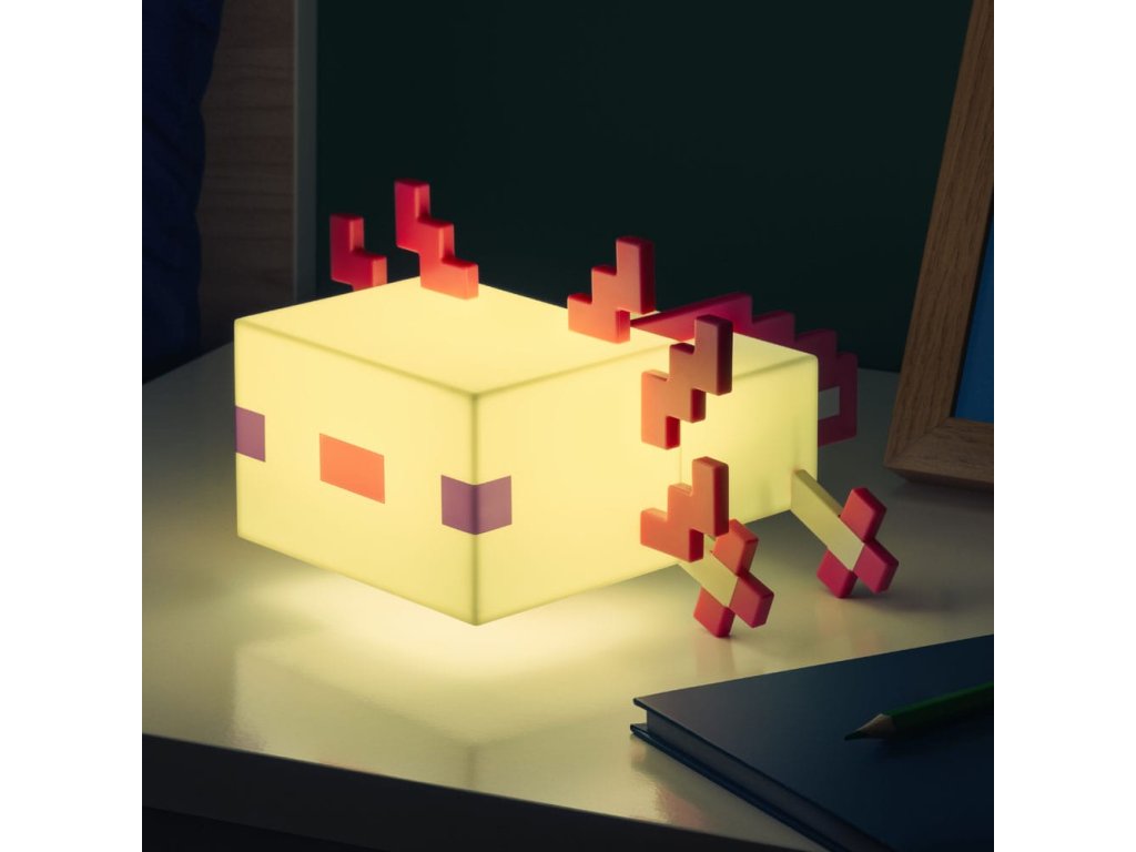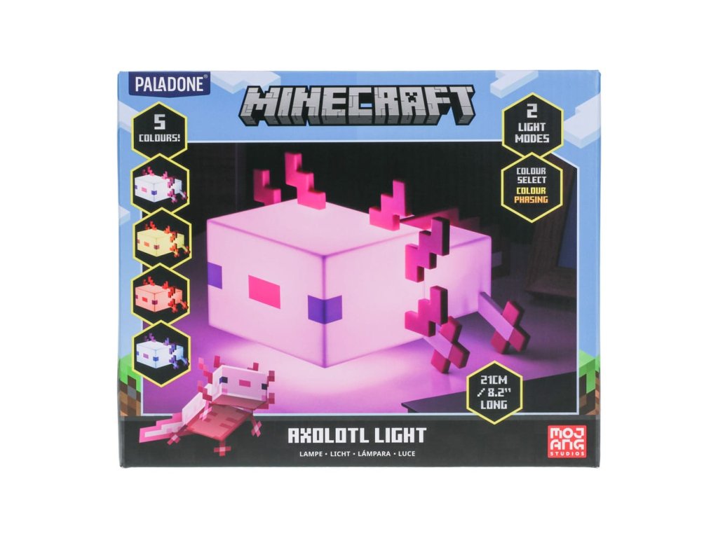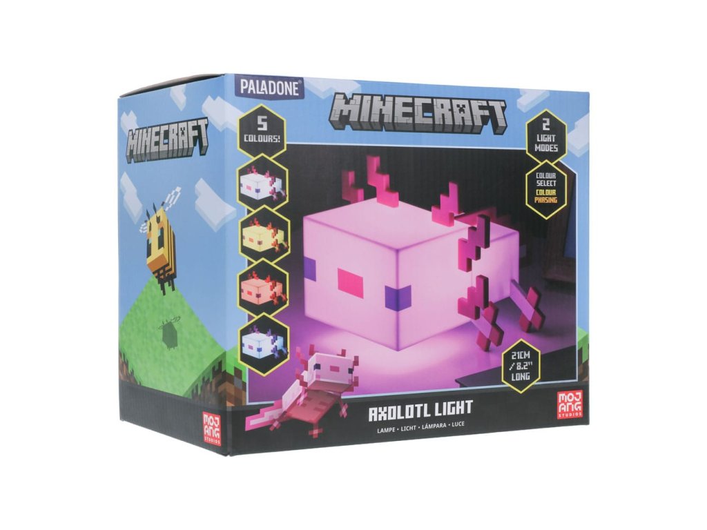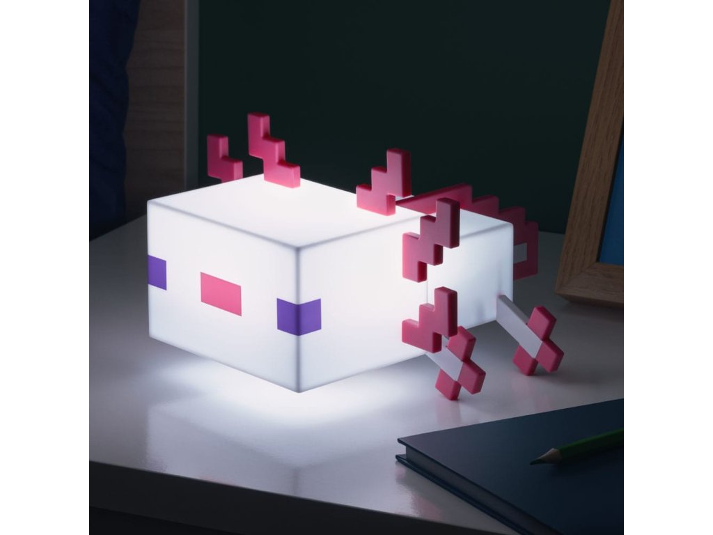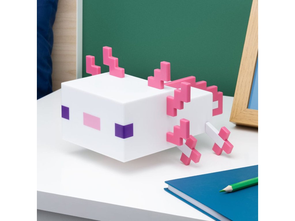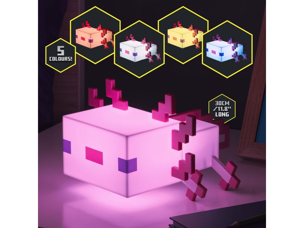 Világítsd meg szobádat ezzel az aranyos Axolotl lámpával. A 21 cm széles éjszakai lámpa úgy lett kialakítva, hogy a Minecraftból ismert barátságos vízi lényre hasonlítson. Kellemes és nyugtató rózsaszín fényt bocsát ki, amely segít ellazulni. A két elérhető fénymóddal hagyja, hogy a fény öt különböző árnyalaton keresztül cikázzon, vagy válasszon csak egyet. A lámpa 3x AA elemmel működik (nem tartozék). Az Axolotl lámpa nagyszerű kiegészítője lesz minden játékos otthonának.Kiegészítő paraméterek