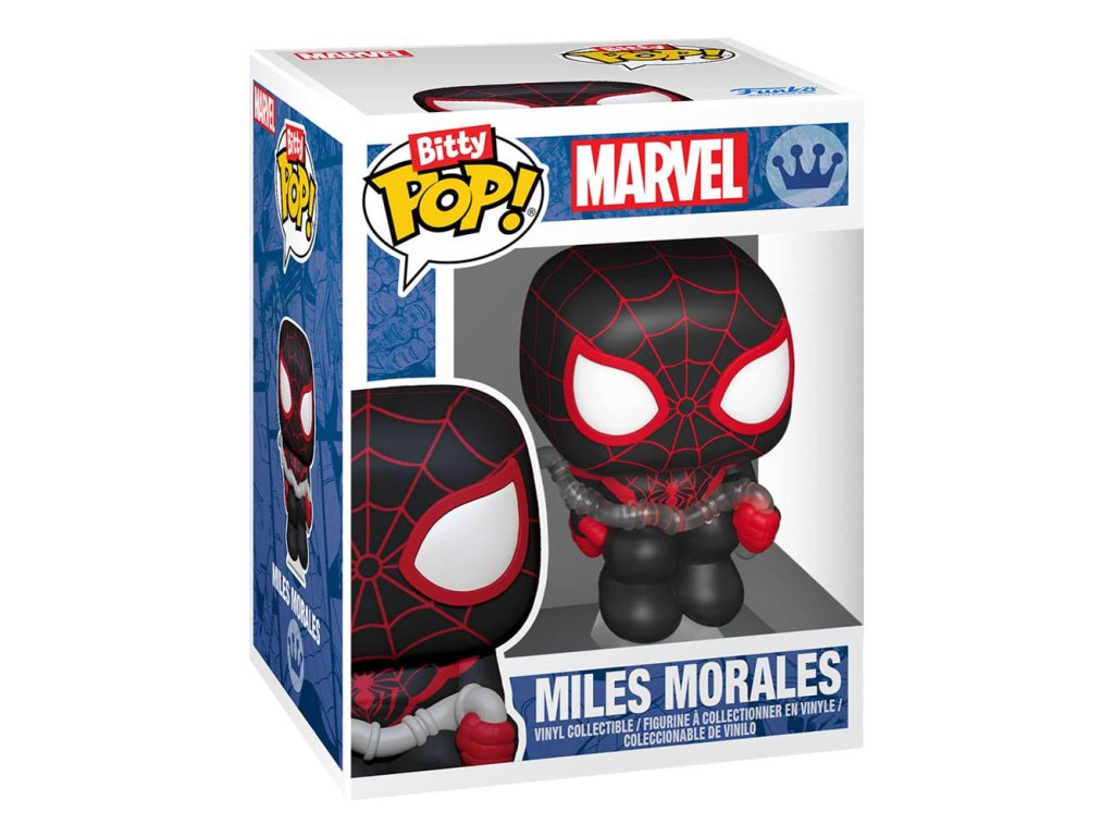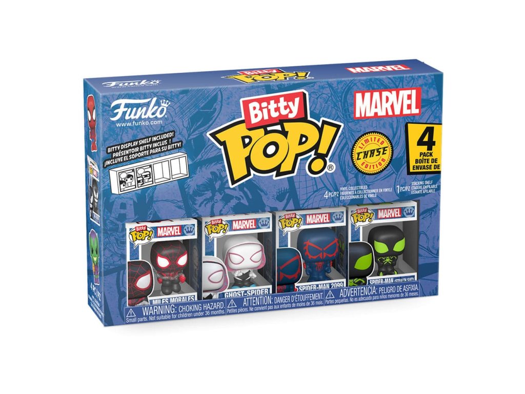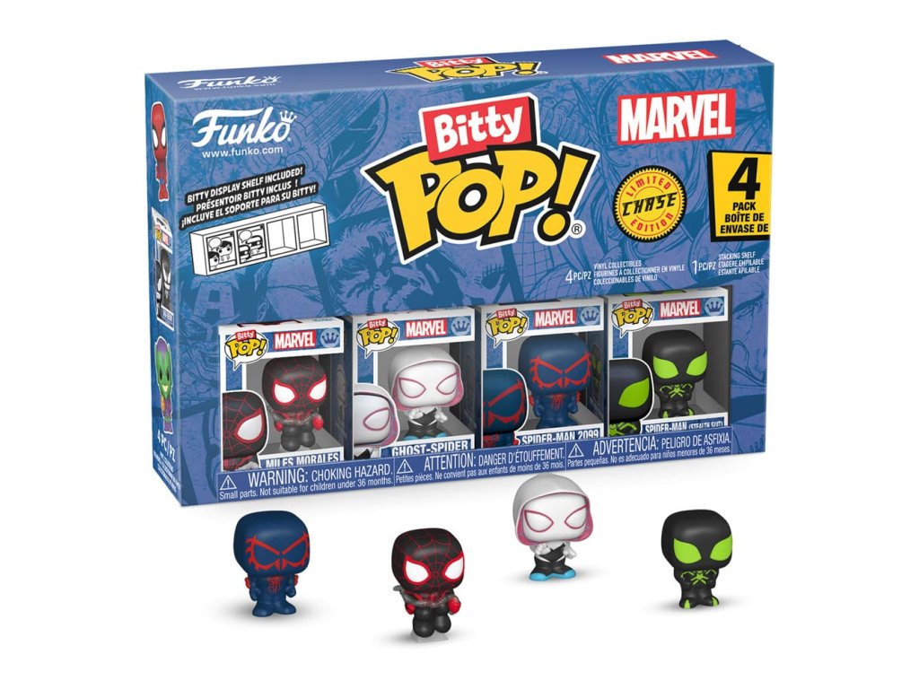 A Funko "Bitty POP!" sorozatából érkezik ez a négy miniatűr, vinilből készült POP! figurából álló csomag. Mindegyik kb. 2 cm magas, és a szokásos POP! A csomag tartalmaz egy tálcát is, amelyen mind a négy figura elfér. A következő figurákat tartalmazza:- Miles Morales- Ghost-Spider- Spider-Man 2099- Chase figuraA tartalom a Chase figura miatt eltérhet a képektől. A lehetséges Chase figurák:- Ritka (1/3) Pókember - Lopakodó öltöny- Ritka (1/3) Pókember - Szimbióta öltöny- Hyper Ritka (1/6) Peter Parker- Hyper Ritka (1/6) Pókember - SpotlightKiegészítő paraméterek