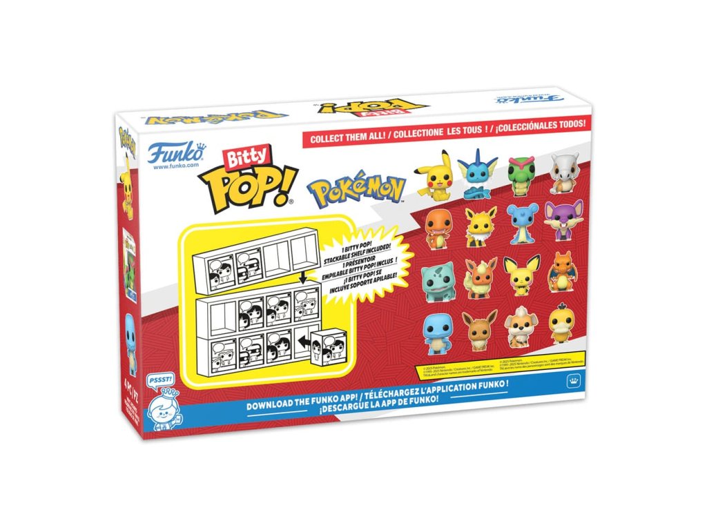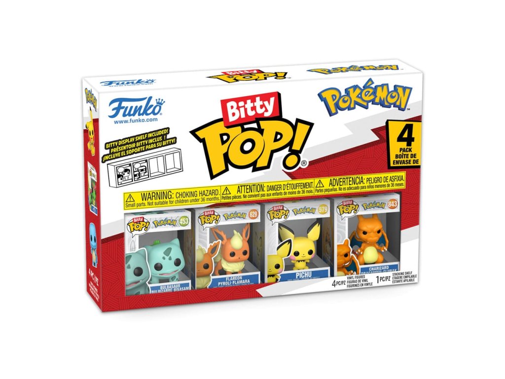 A Funko "Bitty POP!" sorozatának 4 mini vinyl figurájából álló csomag egyenként kb. 2 cm magas, akril csomagolásban, tipikus POP! dizájnban. Tartalmaz továbbá egy egymásra helyezhető displayt, amely mind a négy figurát képes befogadni. A csomagban a következőket találod:- Bulbasaur- Flareon- Pichu- Charizard