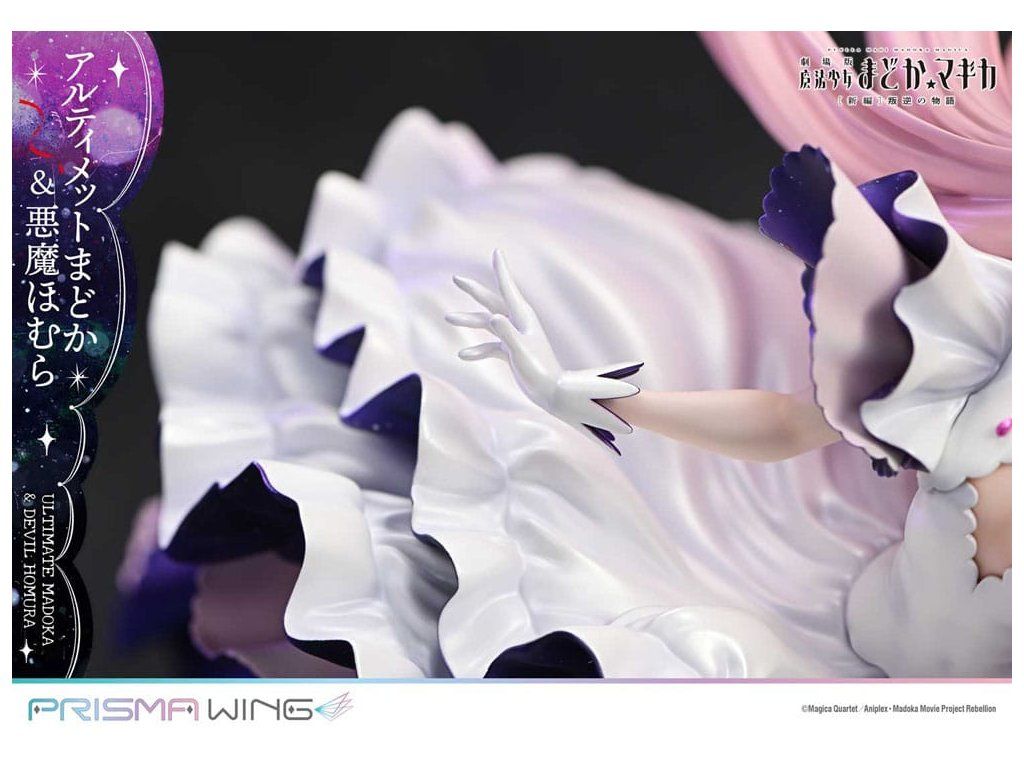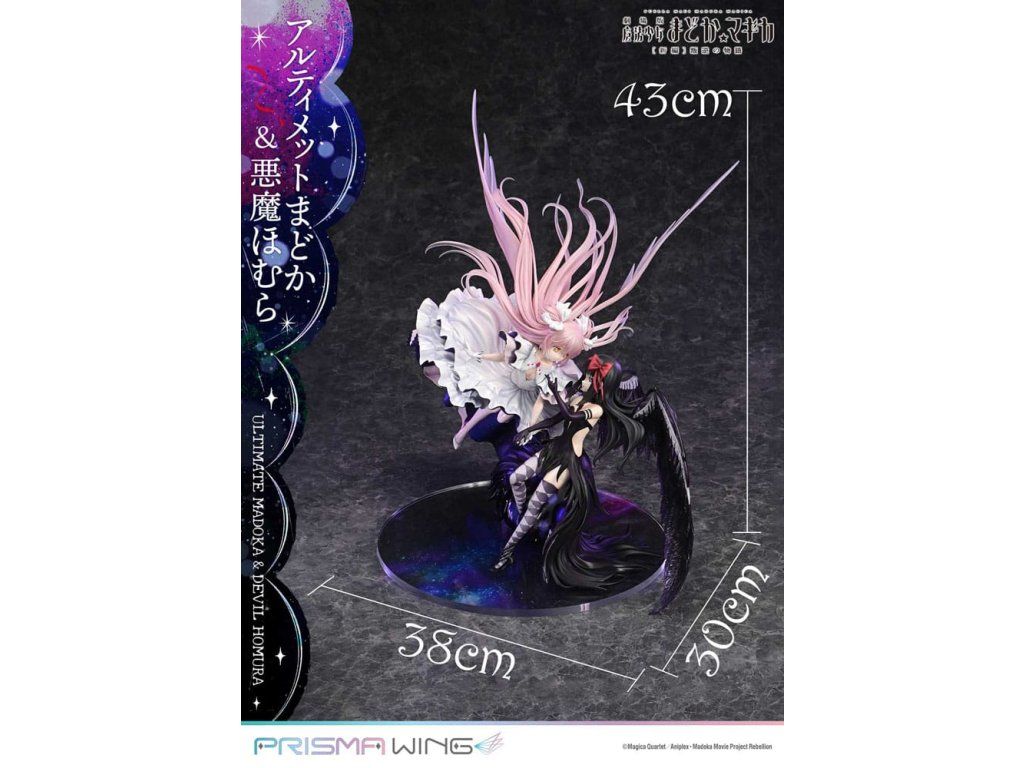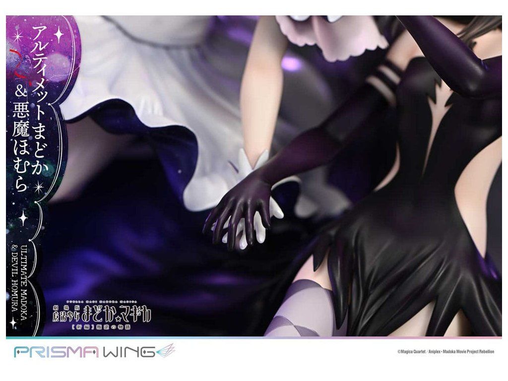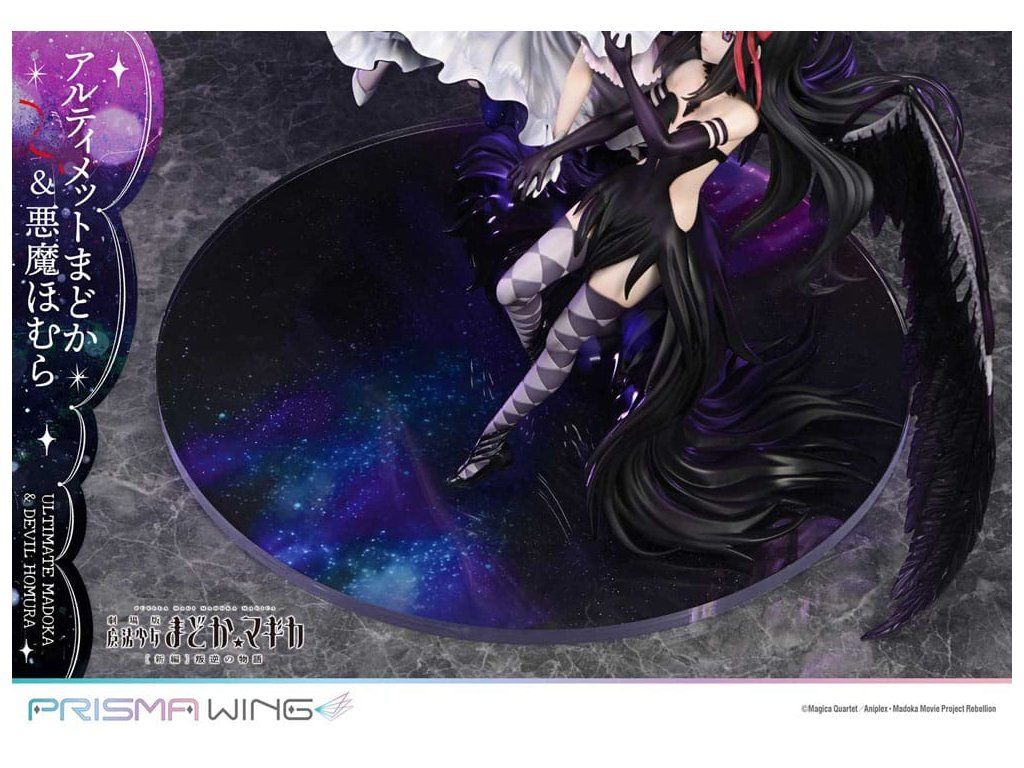 A Puella Magi Madoka Magica The Movie -Rebellion-ból a végső Madoka és a démoni Homura egy lenyűgöző figurában elevenedik meg! A Végső Madoka, aki a megváltás kezét nyújtja minden mágikus lánynak, és a Démoni Homura, aki meggyalázta a Ciklusok Törvényét, és bitorolja a démoni címet. Ez a figura drámaian érzékelteti ellentétes alakjukat. Madoc áttetsző haja és lágyan hullámzó szoknyája éteri könnyedséget sugall, míg Homura hatalmas szárnyai és szabadon hulló ruhája súlyos eleganciát sugároz. Dinamikus pózaik a mozgás közepette a gravitáció érzetét keltik. A színösszeállítás az egyes karakterek egyéniségét hangsúlyozza, kezdve Madoka rózsaszín hajával és Homura fekete hajával. A gyöngyházfehér fény és a mélyfeketébe átmenő lila árnyalatok feltűnő kontrasztot alkotnak. A Madoka mellkasán lévő ékszer és Homura harisnyájának kidolgozott részletei gyönyörűen visszaadottak. Még a szoknyák belsejében is gondosan alkalmazott fény- és árnyékpontok követik a fodros kontúrokat. A talapzat kialakításával együtt ez a figura a világűr nagyszerűségét idézi.Kiegészítő paraméterek