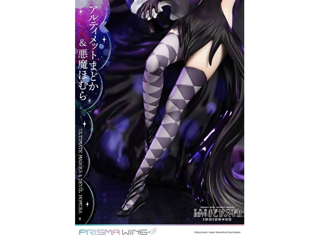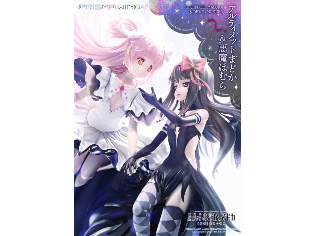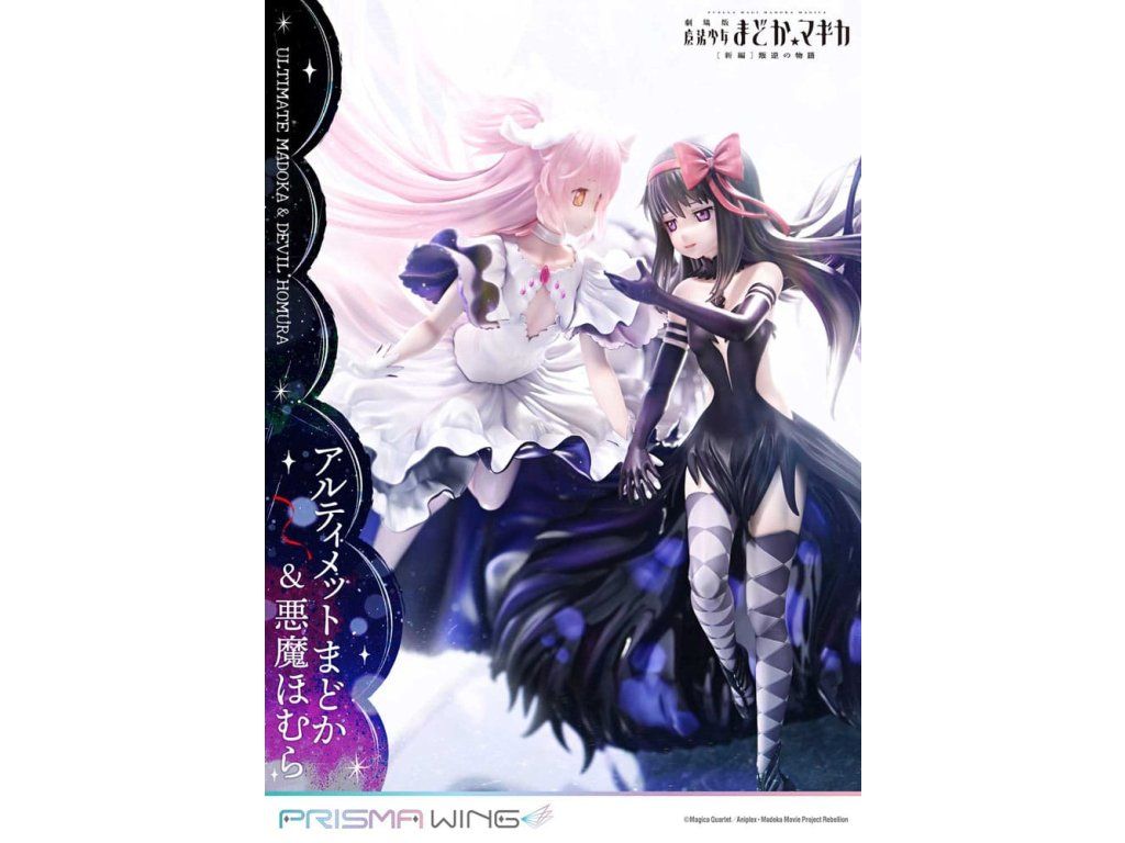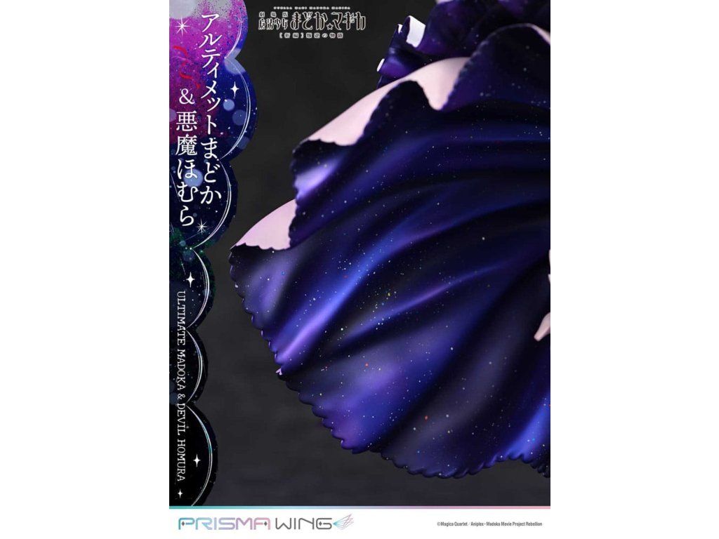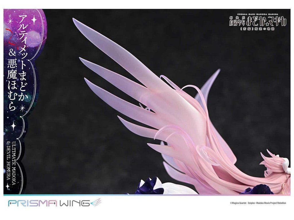 A Puella Magi Madoka Magica The Movie -Rebellion-ból a végső Madoka és a démoni Homura egy lenyűgöző figurában elevenedik meg! A Végső Madoka, aki a megváltás kezét nyújtja minden mágikus lánynak, és a Démoni Homura, aki meggyalázta a Ciklusok Törvényét, és bitorolja a démoni címet. Ez a figura drámaian érzékelteti ellentétes alakjukat. Madoc áttetsző haja és lágyan hullámzó szoknyája éteri könnyedséget sugall, míg Homura hatalmas szárnyai és szabadon hulló ruhája súlyos eleganciát sugároz. Dinamikus pózaik a mozgás közepette a gravitáció érzetét keltik. A színösszeállítás az egyes karakterek egyéniségét hangsúlyozza, kezdve Madoka rózsaszín hajával és Homura fekete hajával. A gyöngyházfehér fény és a mélyfeketébe átmenő lila árnyalatok feltűnő kontrasztot alkotnak. A Madoka mellkasán lévő ékszer és Homura harisnyájának kidolgozott részletei gyönyörűen visszaadottak. Még a szoknyák belsejében is gondosan alkalmazott fény- és árnyékpontok követik a fodros kontúrokat. A talapzat kialakításával együtt ez a figura a világűr nagyszerűségét idézi.Kiegészítő paraméterek