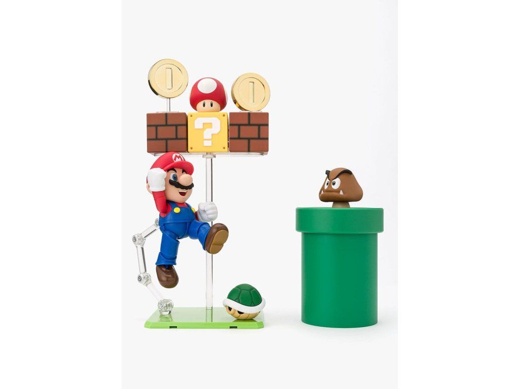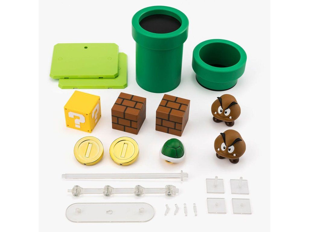 Az S.H.Figuarts Super Mario sorozat visszatér! Mostantól kapható egy játékkészlet, amely tovább bővíti Super Mario világát. Az olyan ismert tárgyak mellett, mint a zöld kagylók és érmék, kérdőjeles dobozok, téglatömbök és szennyvízcsövek is szerepelnek benne. Kombináld a sorozat más termékeivel (külön megvásárolható), hogy különböző jeleneteket építs fel. Egy ellenséges Goomba figurát is tartalmaz. Package contents.Kiegészítő paraméterek