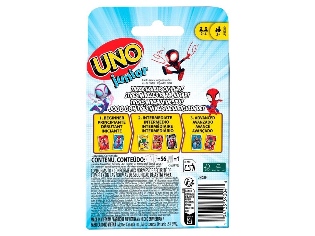 UNO Junior találkozik Spidey-vel és szuper barátaival! Ez a gyermekbarát kártyajáték 2-4 játékos számára ideális 3 éves kortól, és segít a kicsiknek játékos módon megtanulni a színeket és a számokat. A sorozat kedvenc karaktereivel a játékest igazi szuperhős kalanddá válik.Kiegészítő paraméterek