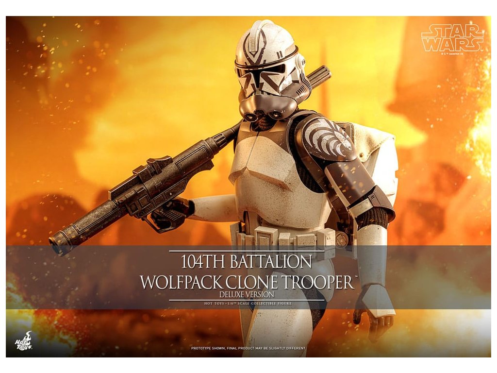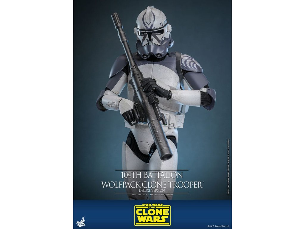 "Mi csak klónok vagyunk, uram, minket fel kell áldozni. "Nekem nem." - Plo KoonPlo Koon jedi tábornok és Wolffe klónparancsnok parancsnoksága alatt a 104. zászlóalj, a Farkasfalka zászlóalj néven ismert klóncsapat a Köztársaság Nagy Hadseregében harcolt, mint a klónkatonák egysége. A 104. zászlóalj eredetileg gesztenyebarna jelvényeket viselt, de az Abregadóban elvesztett katonáik tiszteletére szürkére változtatták páncéljuk színét. A klónháborúk során több nagy csatában is harcoltak, ami a katonák és a parancsnokok közötti kapcsolatot is elmélyíti. ma a Hot Toys örömmel mutatja be a 104. zászlóalj "Wolfpack" 1/6-os méretarányú, gyűjthető klónkatona figurát a rajongóknak, akik szeretnék kiegészíteni a 104. zászlóalj gyűjteményüket!Ez a nagy hűségű gyűjtőfigura kifejezetten a 104. zászlóalj klónkatonái alapján készült, a szürke és fehér sisakjuk és páncéljuk ügyes újraalkotásával, jellegzetes "Farkasfalka" jelzésekkel és kopási effektekkel, magas jelzőfénnyel, számos fegyverrel, köztük egy puskával és pisztolyokkal, valamint egy bemutató talapzattal. A deluxe változat egy cserélhető I. fázisú klónkatonasisakot is tartalmaz, valamint egy II. fázisú sisakot, forgó robbanóágyút, rakétavetőt és hátizsákot fedővel a további megjelenítési lehetőségekhez.Kiegészítő paraméterek