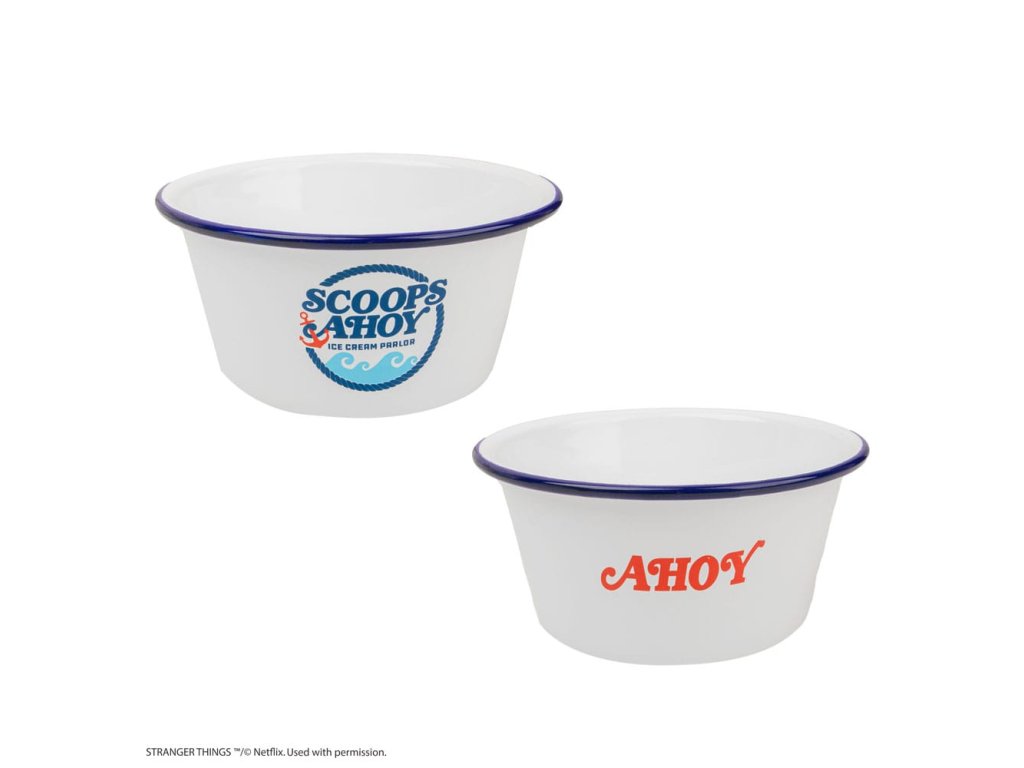 Lépj vissza az időben a 80-as évek színes korszakába a Scoops Ahoy fagylaltos tál és matrózsapka szettünkkel, amelyet a Stranger Things sorozat Scoops Ahoy nevű vintage fagylaltozója ihletett. Élvezze kedvenc fagyasztott finomságait zománcozott fagylaltos tálunkban, amely az egyszerűbb időkre emlékeztető vintage stílust sugároz. A Scoops Ahoy átalakulását a mellékelt matrózsapkával teheted teljessé, amely a sorozatban Robin és Steve által viselt ikonikus fejfedőt idézi - Tál: Zománc - Sapka: Poliészter - Tál: 8,5 cm mély, 13 cm átmérő - Sapka: 6,5 cm magas, 19 cm átmérőjű.Kiegészítő paraméterek