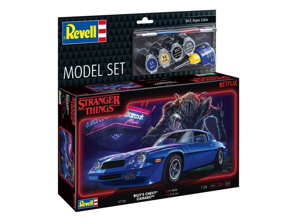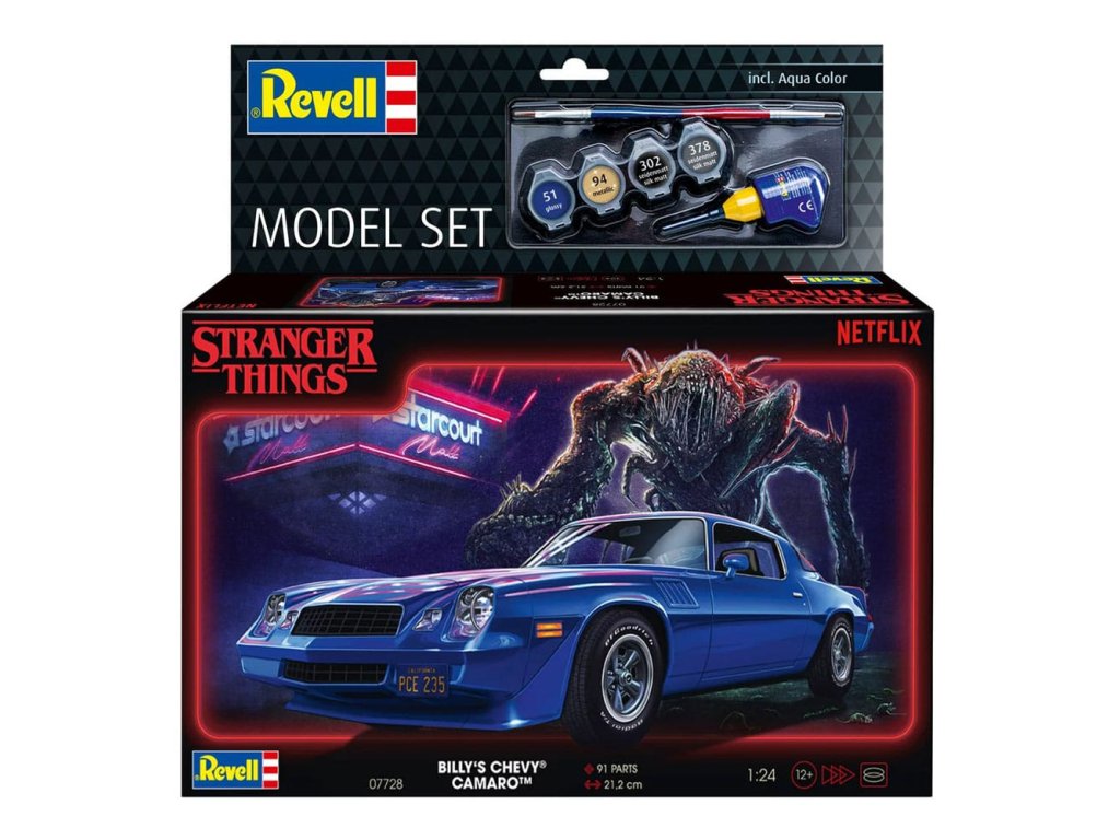 A Netflix "Stranger Things" című sorozata világszerte nagy sikert aratott, több tinédzser élményeit követi nyomon, akik természetfeletti dolgokat tapasztalnak, miközben egy eltűnt barátjukat keresik, sőt, egy párhuzamos "árnyékvilágba" is belebotlanak. A második szériában megjelenik Billy Hargrove Hawkinsban, aki a sorozat előrehaladtával az egyik antagonistává válik. Ez a felelőtlen tinédzser egy Chevrolet Camarót vezet, egy jellegzetes amerikai izomautót, nagy V8-as motorral és hangos hanggal - újraindítás és új epizódok - többrészes motor - a Netflix sorozatán alapuló felszerelések - a sorozat járművein alapuló matricák. Az alapfestékekhez ragasztók és ecsetek is tartoznak. Részletes modellkészlet az antagonista Billy Hargrove feltűnő Chevrolet Camarójáról a sikeres "Stranger Things" sorozat második évadából. 1:25 méretarány. 100 alkatrész. Hossza 191 mm. Alkalmas 12 éves kortól.Kiegészítő paraméterek