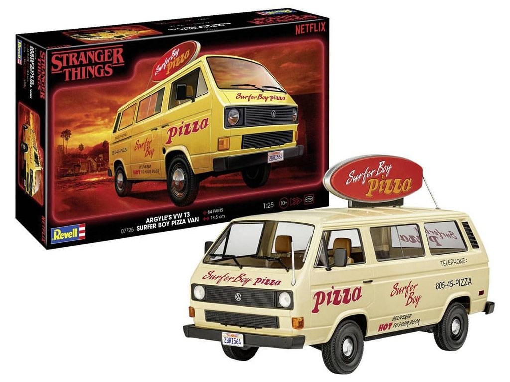 A "Stranger Things" negyedik évadában az eredeti szereplők közül néhányan elhagyják Hawkins kisvárosát, köztük Jonathan Byers, akit Kaliforniába vonz. Ott találkozik Argyle-lel, aki egy VW T3 buszt vezet, amelynek reklámszlogenje a 'Surfer Boy'. Ők ketten a busszal útnak indulnak az USA nyugati részén, hogy újraegyesítsék az eredeti csoportot és megmentsék Hawkinst. A lenyomaton egy pizzéria látható, ahol a sorozat későbbi részében ideiglenesen legyőzik a szörnyeteg Vecnát - Új alkatrészek és újbóli bemutatás - Többrészes motor - Tolóajtók - Festési útmutató és matricák a 'Surfer Boy' feliratú széria VW T3-as alapján A 'Stranger Things' negyedik sorozatából ismerős, kezdő készletként kapható. 1:25 méretarány. 96 alkatrész. Hossza 185 mm. Alkalmas 10 éves kortól.Kiegészítő paraméterek