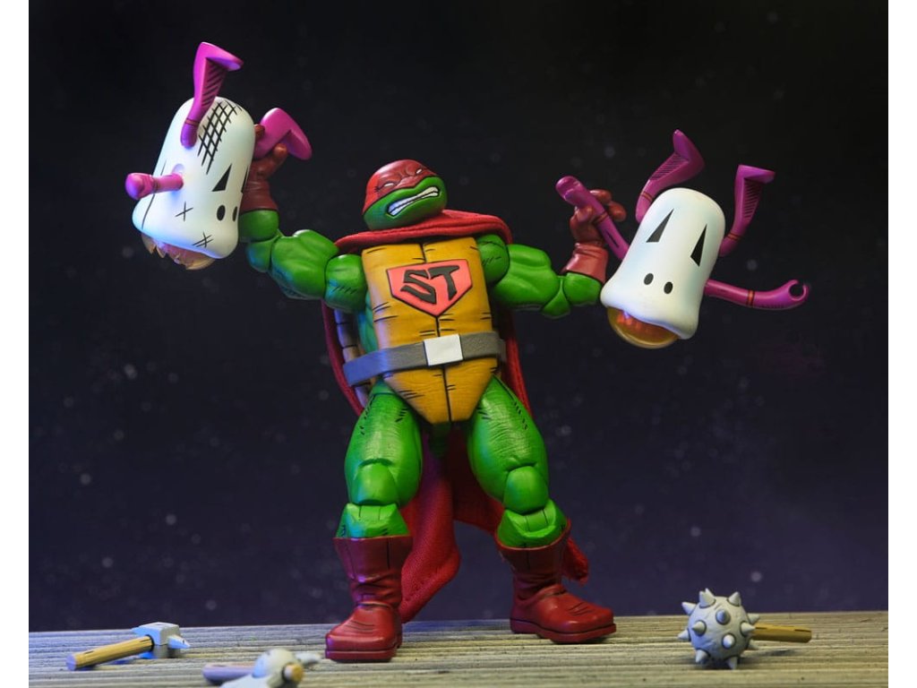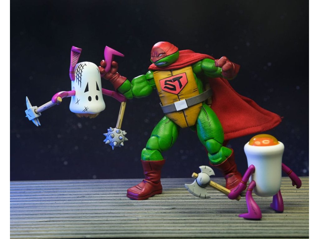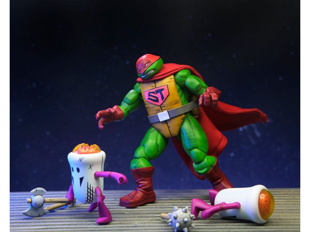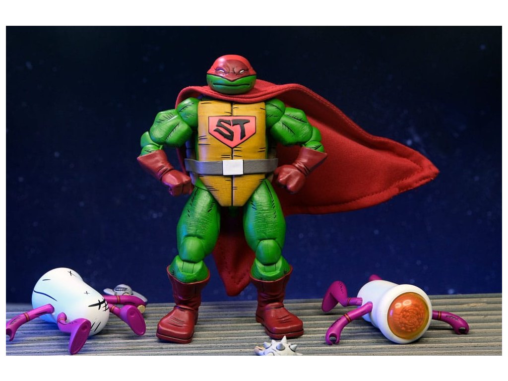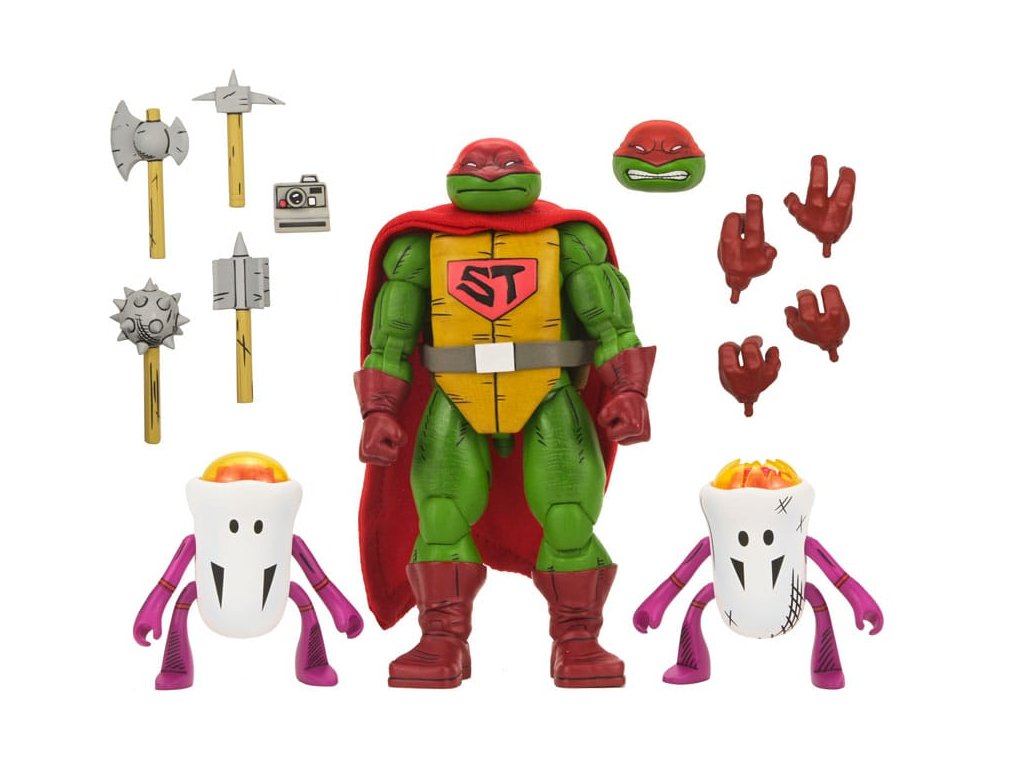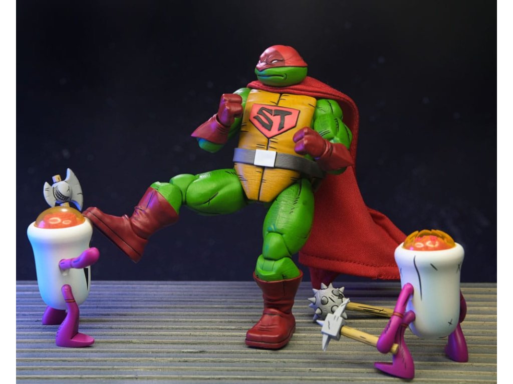 Ahogy a TMNT 5. sztorijában is láthatod, ez Szuper Teknőc! Ez a 7 hüvelykes NECA akciófigura készen áll, hogy csatlakozzon a Tini Mutáns Nindzsa Teknőcök gyűjteményedhez! A puha árucikkekből készült köpennyel kiegészített Super Turtle készen áll arra, hogy megmentse a napot, több fejjel, karral és fegyverrel. Ráadásul Domeoid minifigurákkal érkezik, tiszta és csatasérült kivitelben, ahogy a 15. számban is látható! Gyűjtőbarát csomagolásban, Kevin Eastman eredeti grafikájával.Kiegészítő paraméterek