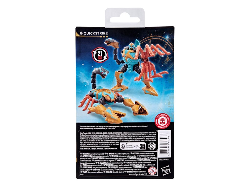 Ismerd meg az epikus Transformers robotuniverzumot a Transformers Age of the Primes Quickstrike játékkal! A 14 cm-es (5,5 hüvelykes) Deluxe osztályú figura 21 lépésben alakul át robotból skorpió módba, és kobra alakú farokkal/karral rendelkezik. A részletes mozgékonysággal rendelkező Quickstrike figura remek kiegészítője bármely gyűjteménynek. Keress más gyűjthető Transformers játékokat (külön megvásárolható, a rendelkezésre állás függvényében), amelyek olyan karaktereket ábrázolnak, mint Optimus Prime, Bumblebee, Megatron és mások, hogy egy olyan építményt hozz létre, amely - több, mint ami a szemnek látszik.
