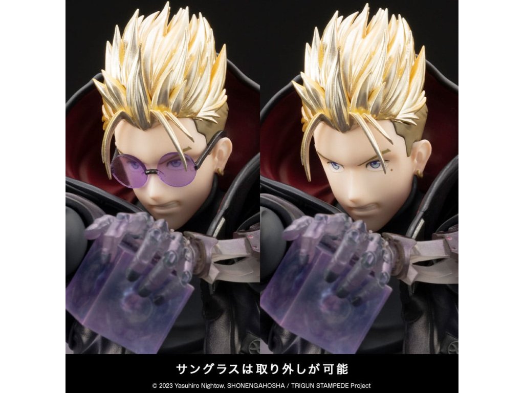 Vash the Stampede, a TRIGUN STAMPEDE főszereplője színes variációban, újratervezett részekkel tér vissza! Vash újrateremtésre került a Késekkel való harc során feketére változott öltözékében. A fejét és a bal vállát újratervezték, és az általános színösszeállítás is megváltozott az eredeti ARTFX J Vash the Stampede TRIGUN STAMPEDE Ver. A napszemüvege is levehető. További bónuszként egy Nightow TRIGUN STAMPEDE Ver. chibi stílusú minifigurát is tartalmaz! Ez a darab minden TRIGUN rajongónak kötelező darab, ezért még ma egészítsd ki a gyűjteményedet!Kiegészítő paraméterek