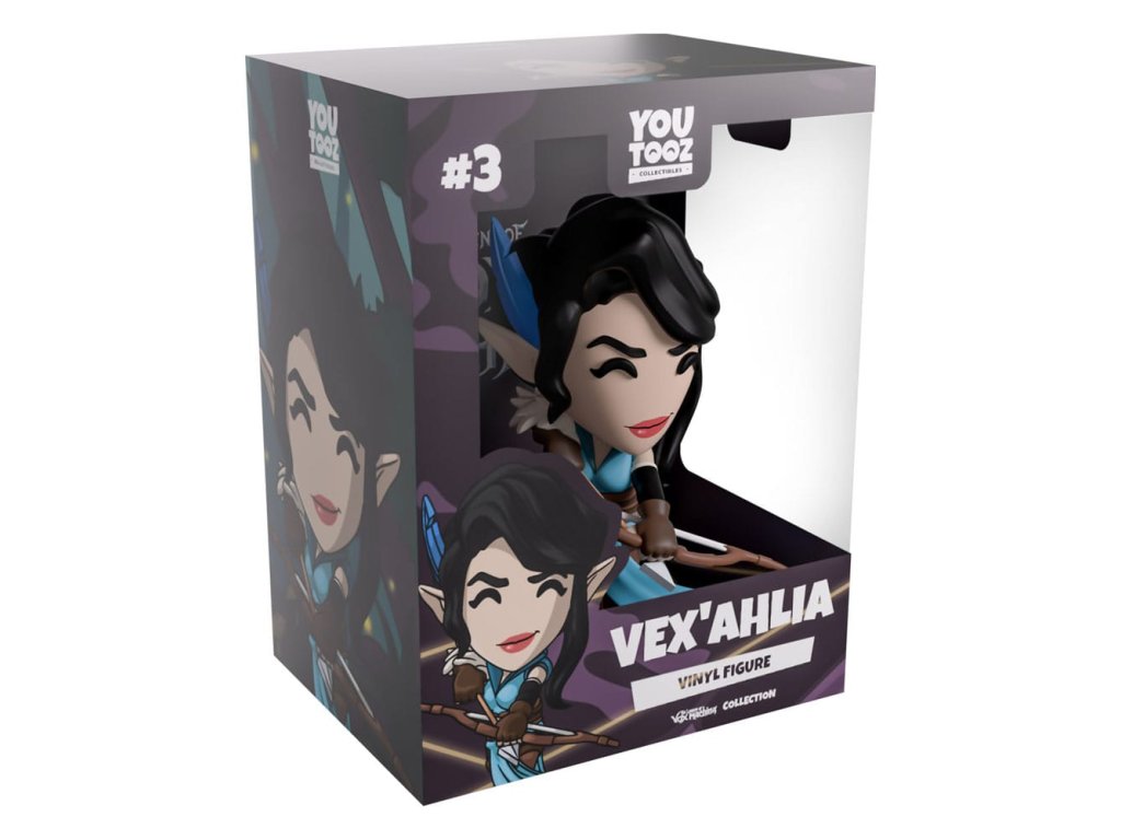Vigyázz, tele van a fejszéje! Vex'Ahliának már sikerült egyszer pontot szereznie, és most végre ő is Youtooz figura! Ez a 13 hüvelyk magas, félelf határlány komolyan gondolja a dolgot, ahogy keresztbe tett lábakkal és gyönyörű barna, combig érő csizmában áll. Kék tunikáját oldalra fújja a szél, amelyet széles barna öv tart szilárdan a helyén. Bal kezében előre tartja az íját, jobb keze pedig készen áll egy pusztító lövésre. Barna kesztyűvel, fekete karkötővel és fehér ajkakkal van kiegészítve a jobb vállán, fekete haját pedig vékony copfba kötve hordja. Hosszú frufru keretezi huncut, mosolygós arcát, míg jobb füle fölött egy kék toll emeli ki hosszúkás elf fülét. Az üvegdobozban Vex egy sötét erdő közepén áll íjjal, amelyet levelek vesznek körül, és fényfoltok tarkítanak. Míg a doboz belseje sötét vízhullámokat ábrázol, amelyeken sárga fényszálak táncolnak, a védőborításon pedig a Vox Machina csapat sziluettjei láthatók naplemente előtt. Ez a gyűjtői darab matt, dombornyomott külső védőhüvelyben és egyedi méretű műanyag védőborításban érkezik a maximális védelem érdekében a szállítás során.A Legend of Vox Machina: A The Legend of Vox Machina egy felnőtteknek szóló animációs televíziós sorozat, amely a Dungeons and Dragons Critical Role websorozat kampányán alapul. A sorozat premierje az Amazon Prime-on volt, ahol az első 10 epizódot a Kickstarteren keresztül finanszírozták. A sorozat Exandriában játszódik, egy kitalált világban, amelyet Matthew Mercer 2012-ben hozott létre saját D&D kampányához.Kiegészítő paraméterek
