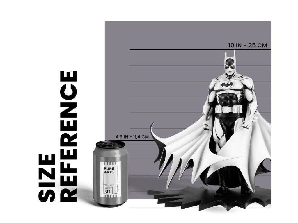 Örökítsd meg minden idők egyik legikonikusabb Batman művészének ikonikus munkáját ezzel a lenyűgöző Masquerade szoborral a PureArts-tól! Az 1/8 méretarányban lenyűgöző, 11 láb magas Batman fekete-fehér változata a Neal Adams ikonikus munkája által inspirált drámai képregényes tintázási stílust örökíti meg. A precízen megmunkált PVC és ABS anyagokból készült PREVIEWS gyűjtői exkluzív szobor egy színesen illusztrált gyűjtői dobozban kerül bemutatásra. A Sötét Lovag e lenyűgöző fekete-fehér változata, amely Neal Adams örök örökségének bizonyítéka, minden bizonnyal értékes kiegészítője lesz bármelyik DC gyűjteménynek!Kiegészítő paraméterek