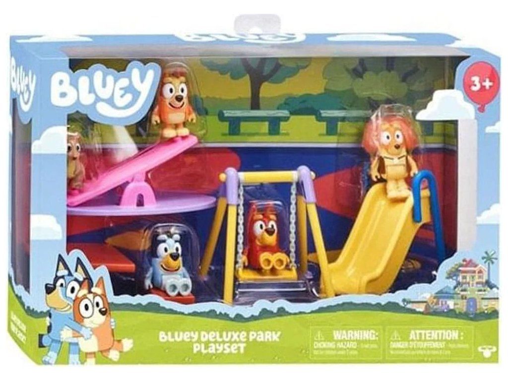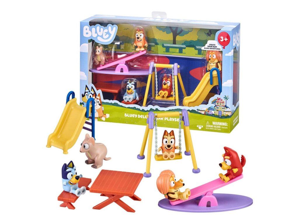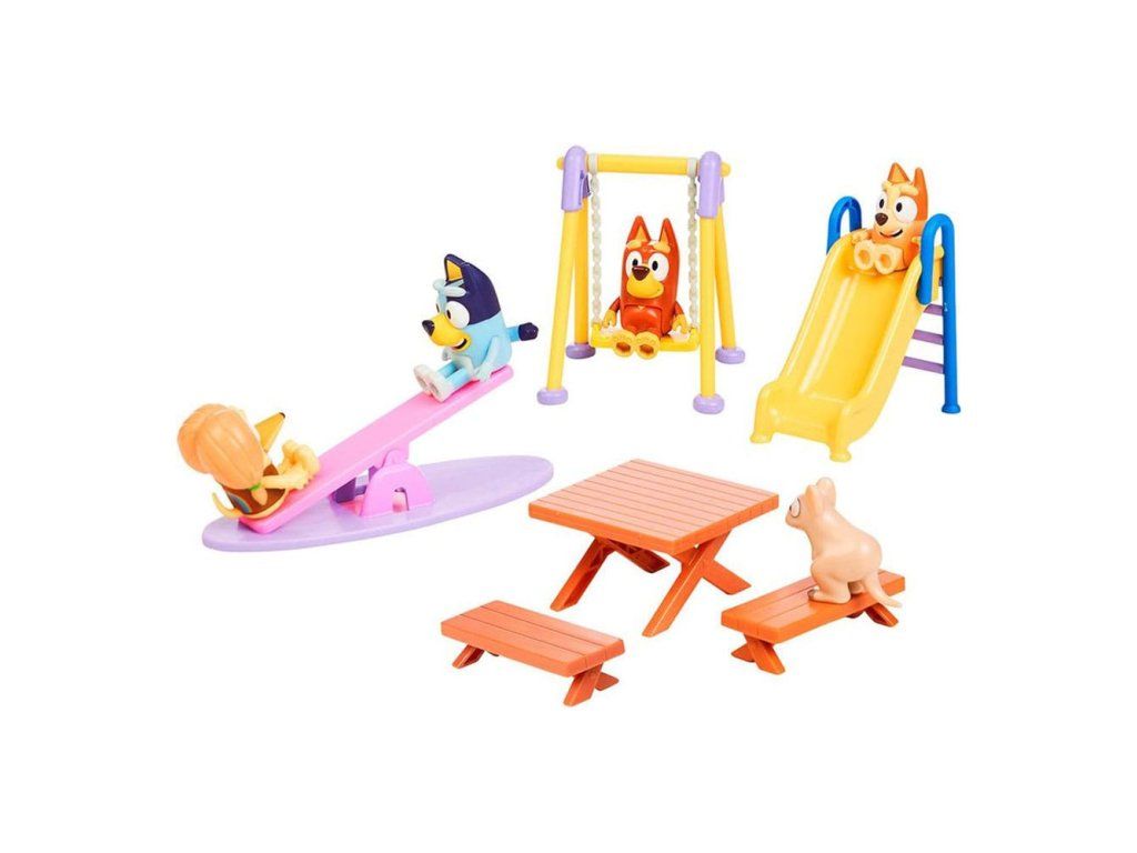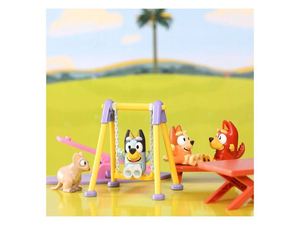 Élvezd a szórakozást a parkban Bluey-val és barátaival ezzel a luxus Bluey játszótérrel. A készlet a következőket tartalmazza: - 4 x 6,5 cm magas játék (Bluey, Bingo, Rusty, Indy) - 1 x Marsupial - 1 x Csúszda - 1 x Hintalemez - 1 x Sarokpad - 1 x Piknikasztal.