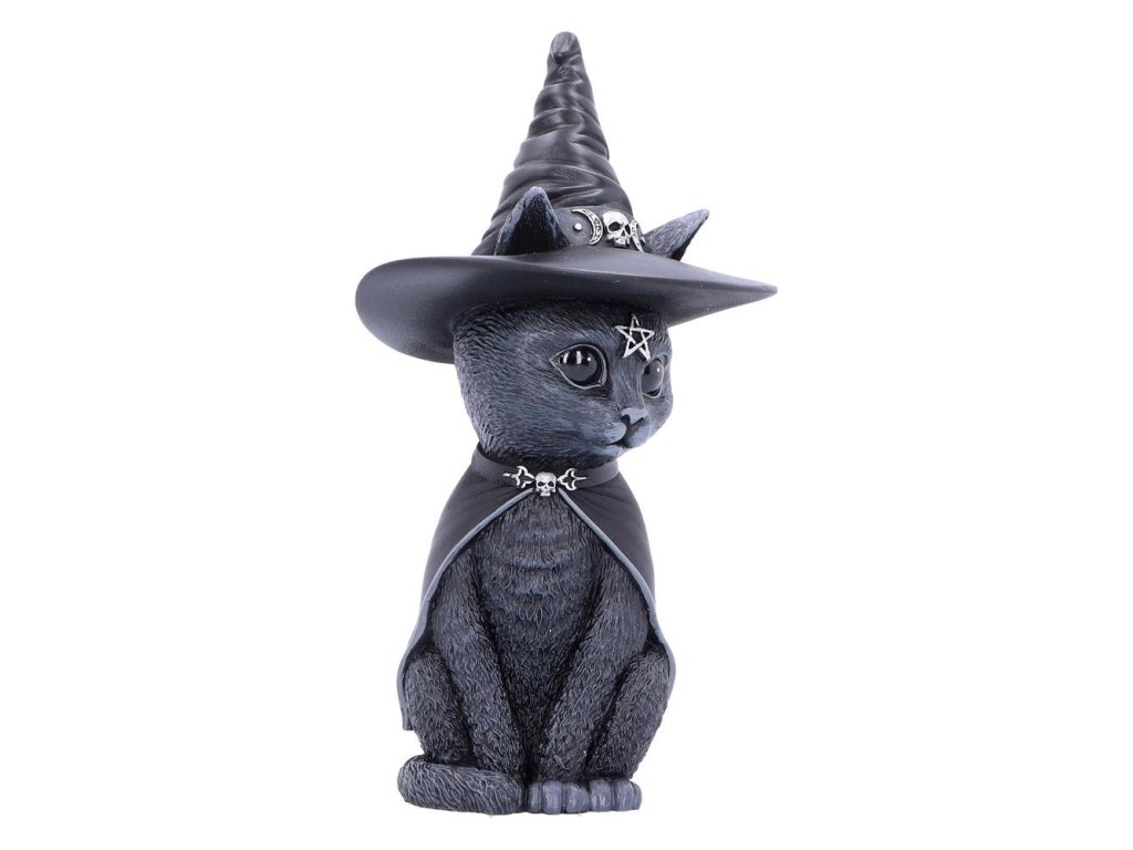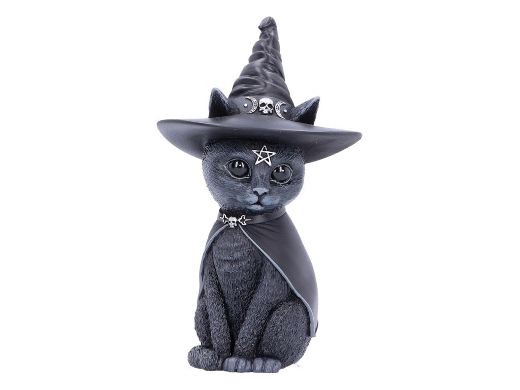 Szörnyen aranyos macskafigura szárnyakkal. Kis koponyákkal, pentagrammákkal és holdakkal díszített - Kézzel festett - Anyaga: gyanta - Mérete: kb. 13 cm.Kiegészítő paraméterek