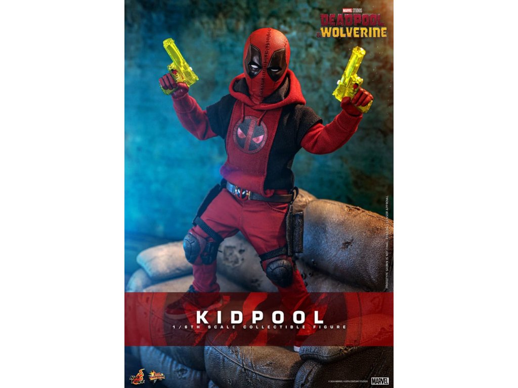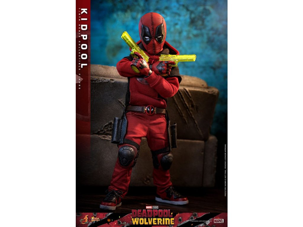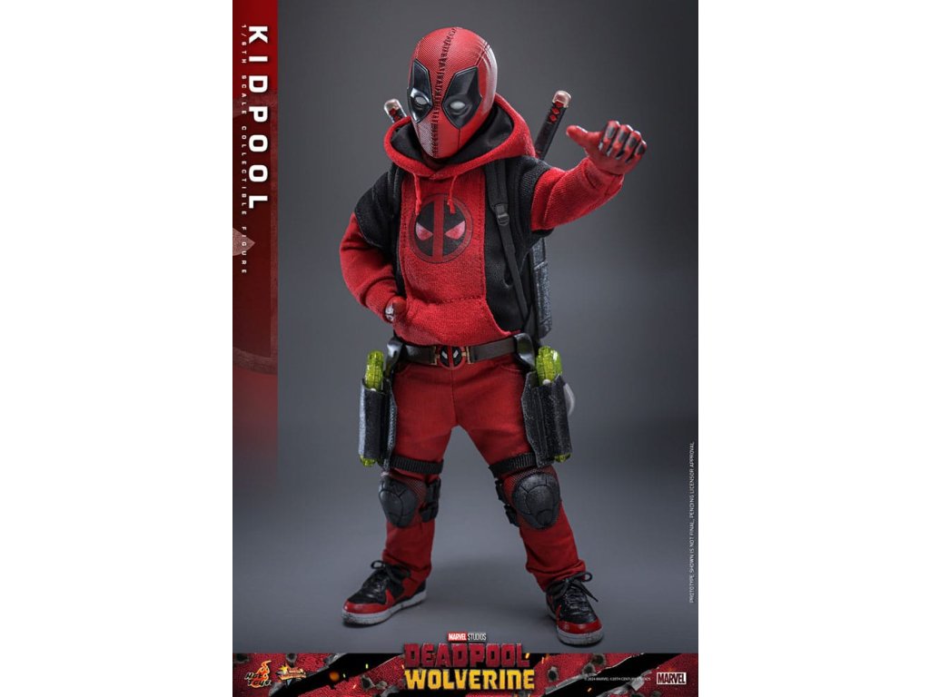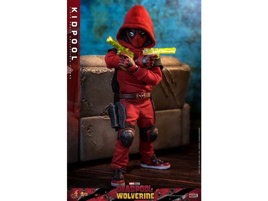 A nagy sikerű Deadpool & Wolverine 2024-ben mindenképpen egy epikus hősfilmmel ismertette meg a Marvel rajongókat. De ez nem csak egy újabb akciófilm, hanem egy "családi film" is lehet, hiszen Deadpool és Ladypool mellé csatlakozik Kidpool és Babypool is. Érdekes cameóként a filmben Kidpool is emlékezetes benyomást hagyott a sajátos humorával, amit Deadpooltól örökölt. A film megjelenése óta a rajongók rajongói szeretete mindenhol megvan. A Deadpool és Rozsomák 1/6-os méretarányú gyűjteményed kiegészítéseként a Hot Toys büszkén mutatja be az 1/6-os méretarányú Kidpool gyűjtői figurát!!! A gondosan megmunkált Kidpool akciófigura egy újonnan kifejlesztett maszkos fejet tartalmaz több pár cserélhető szembilinccsel, egy sérült piros-fekete jelmezt, amely Kidpoolt a kétrétegű pulóverében és a térdvédővel ellátott piros nadrágban, valamint egy pár hozzá illő tornacipőben adja vissza. Kidpool különleges fegyverei - pár vízipisztoly, egy hátizsák két katanával, valamint a különböző pózokhoz és gesztusokhoz cserélhető kezek - is a figura részét képezik. Ráadásul egy szürke kanapé a harci emblémával teszi teljessé a saját, gyönyörű 1/6-os méretarányú "Deadpool családi fotódat!" Most, hogy már megvan az egyhatos méretarányú Deadpool figurák variánsa, csinálj helyet Kidpoolnak is!Kiegészítő paraméterek