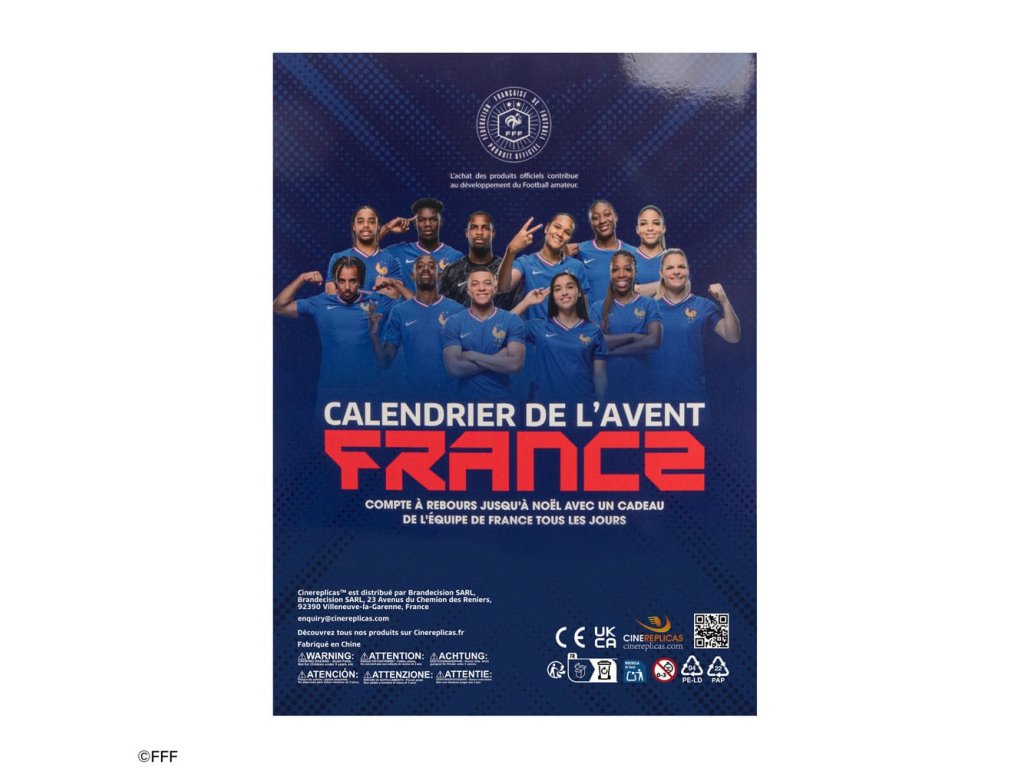 Hivatalos engedéllyel rendelkező adventi naptár 24 Francia Labdarúgó Szövetség tematikus ajándékkal (mini puha labda, cipőfűző, akril könyvjelző, összecsukható vizes palack, felfújható karkötő, akril állvány, cipőfűző, gumi kulcstartó, mikroszálas kendő, bababélyegző, mágnes, horgászsapka, jegyzetfüzet, kitűző, tolltartó, csomagcímke, washi szalag, zokni, zsinórzsák, nyakpánt, radír, alvómaszk, toll, lézermatrica)Kiegészítő paraméterek