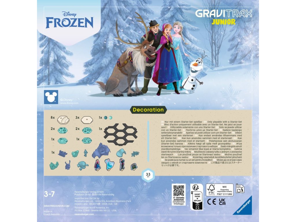 A GraviTrax Junior egy interaktív golyós pályarendszer 3 éves és idősebb gyermekek számára. A kicsik saját világokat építenek a golyós pályákból, amelyeket tetszőlegesen díszíthetnek, hogy egyedi tematikus világokat hozzanak létre. A gyerekek nagyon jól fognak szórakozni a kreatív építkezés közben. A Disney: Ice Kingdom bővítmény különböző játékfigurákat tartalmaz Anna, Elsa, Olaf, Sven és dekorációs elemeket, például egy jégpalotát és még sok mást. A gyerekek felépíthetik és felfedezhetik saját jégkirályságukat a GraviTrax pályán belül. A figurákkal való játék, az építőelemek és a tematikus világok díszítése ösztönzi a kreatív szerepjátékot, a képzelőerőt és a finommotoros készségeket. Egyesíti az építkezést és a szórakoztató játékot. Minden építő- és díszítőelem fából készült bioműanyagból készült. A bővítmény 33 építő- és díszítőelemet tartalmaz.