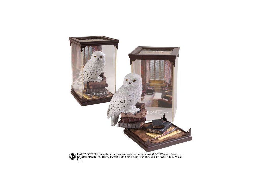 A Noble Collection büszkén jelenti be a Harry Potter-sorozat által inspirált varázslatos lények új termékcsaládját. Mindegyik kb. 10,5 cm széles és 18,5 cm magas a vitrinben. A lények és a diorámák kivehetők a vitrinből. Hedwig volt Harry Potter baglya, amelyet Hagridtól kapott tizenegyedik születésnapjára. Ő is meghalt, amikor megmentette Harry életét a roxforti csatában.Kiegészítő paraméterek