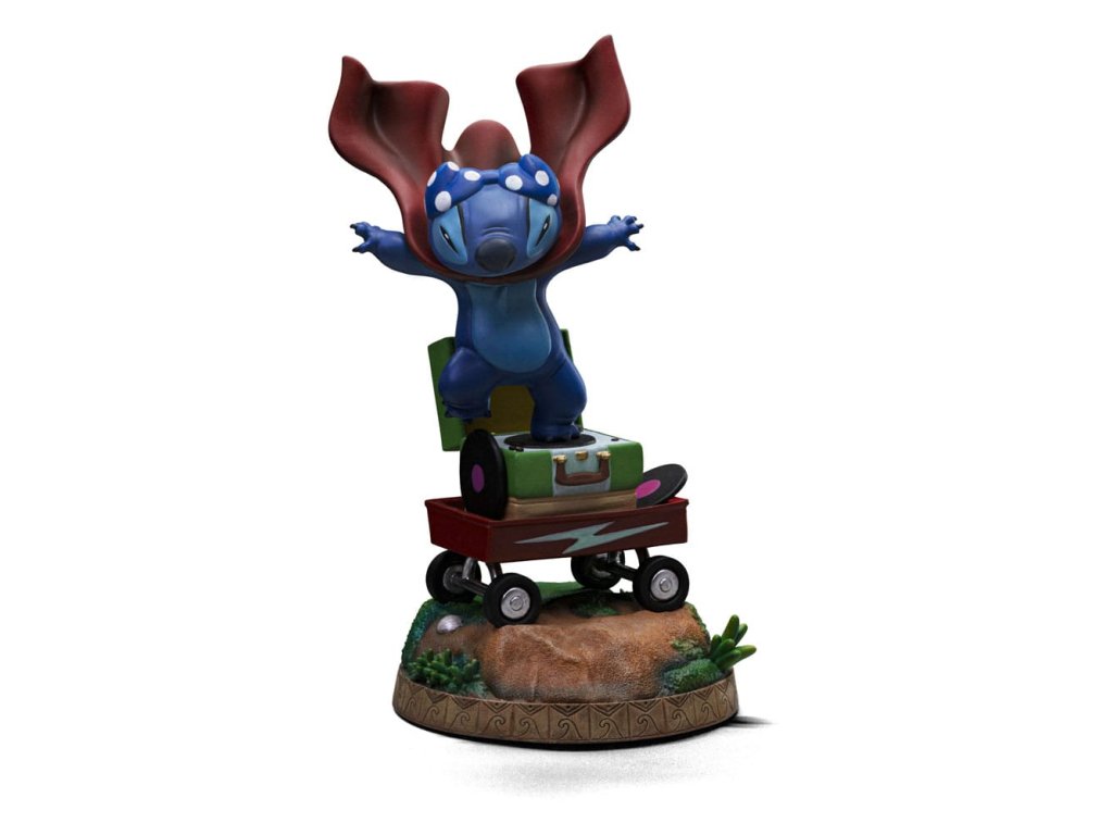 A Kauai hawaii strandjainak homokját és növényzetét ábrázoló alapon egy kis kék földönkívüli lény táncol vidáman egy klasszikus régi bőröndön egy gramofonnal, egy antik piros kézzel vontatott kocsiban, amelyben értékes bakelitlemezek és a lejátszáshoz szükséges felszerelés található. A karizmatikus földönkívüli 4 különböző megjelenésben mutatkozik be az Iron Studios alulnézetből készült szoborkollekciójában. Méret: 19 x 12 x 10 cm.Kiegészítő paraméterek