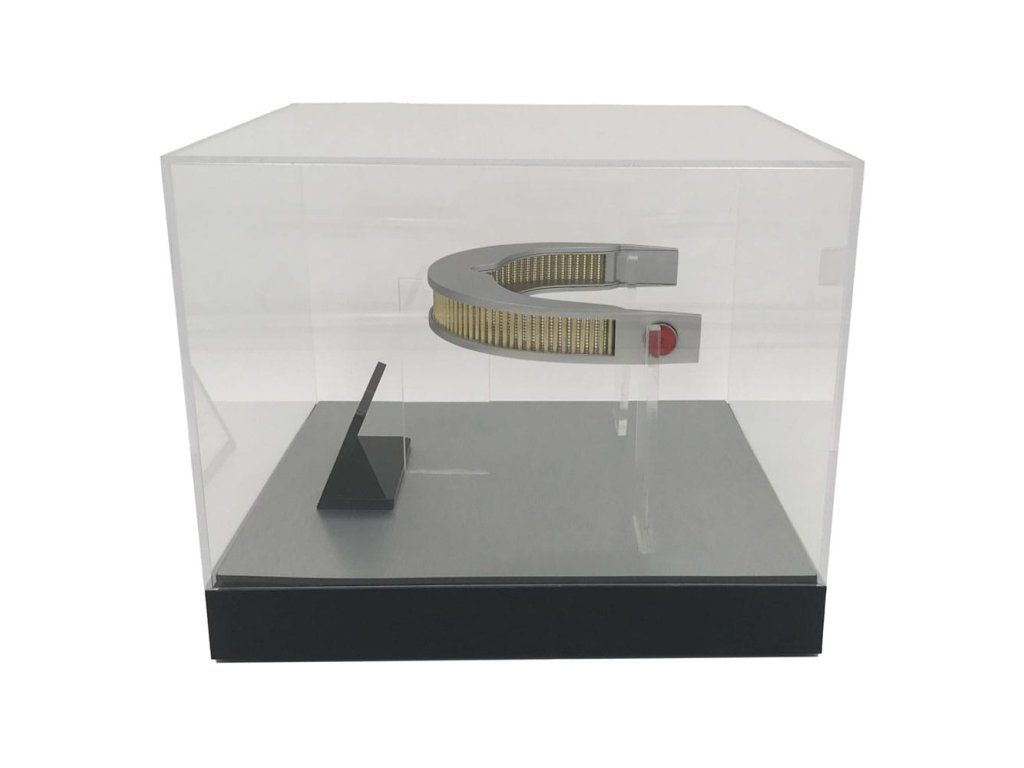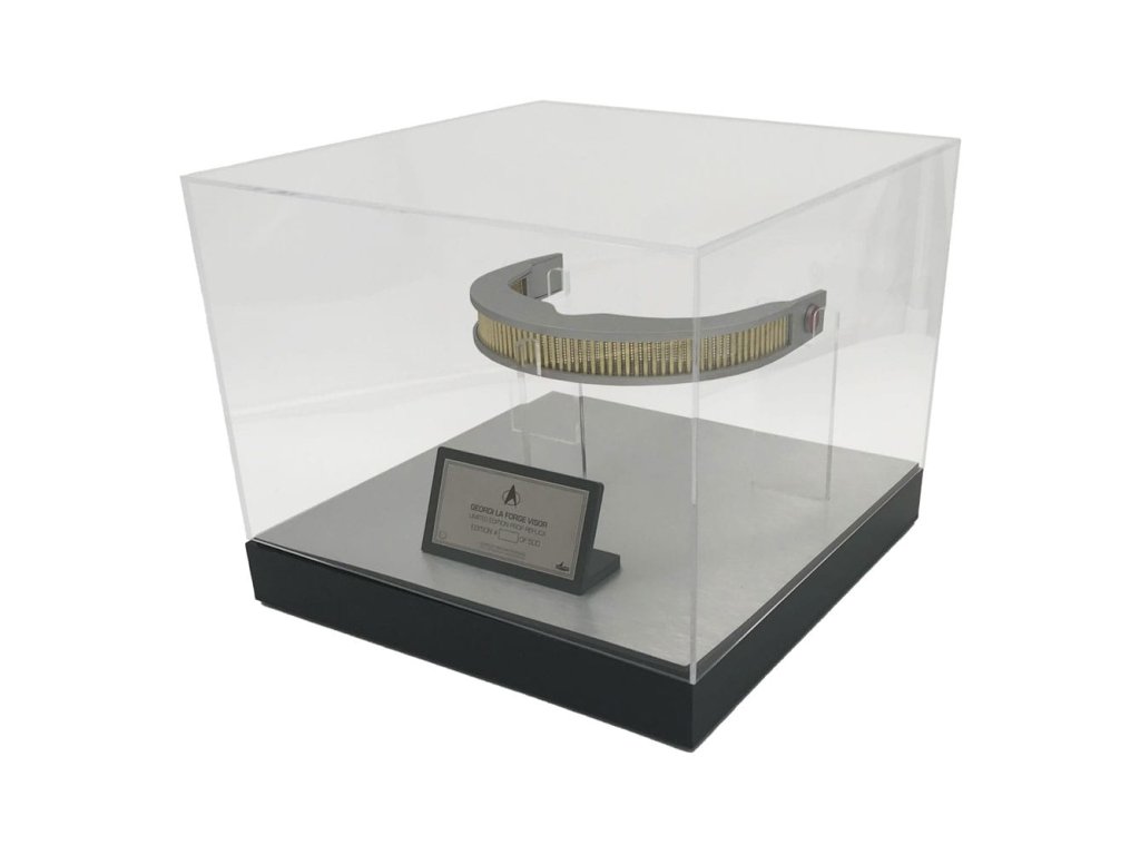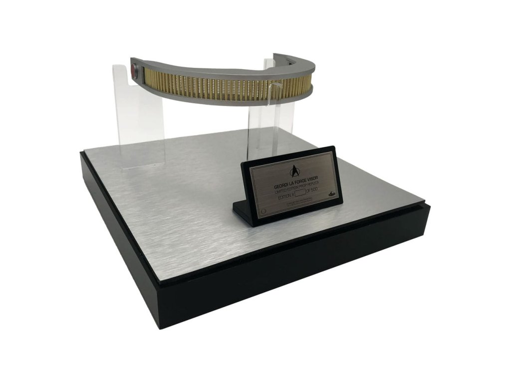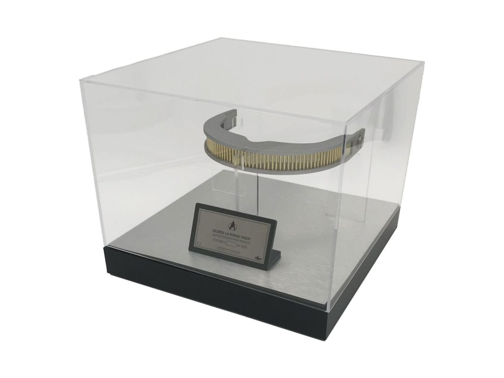 "Ez a bioelektromos mérnöki munka figyelemre méltó darabja..." Geordi La Forge. A VISOR (a Visual Instrument and Sensory Organ Replacement rövidítése) egy orvosi protézis volt, amelyet a Föderáció a vakság és a látáskárosodás kezelésére használt. A felhasználók számára a tipikus emberi képességeket messze meghaladó látásélességet tett lehetővé, beleértve más spektrumokat is, mint például az infravörös és az ultraibolya. A VISOR, ahogyan a Star Trek televíziós sorozatból ismert: The Next Generation és az 1994-es Star Trek: Generációk című filmből ismert, Geordi La Forge kormányos, majd főmérnök viselte, akit Levar Burton alakított. Több kellék is készült, és a hosszú története során többször változott a design. Nem volt egyetlen végleges VISOR kellék. A Factory Entertainment replika VISOR kelléke a Paramount archívumában található források és a magángyűjteményekben található hiteles kellékek gondos tanulmányozása után készült. A replika úgy lett megtervezve, hogy az összes VISOR kelléket megörökítse, ahogyan azok a Star Trek 2-5. sorozatban megjelentek: A következő generáció, egyetlen egyesített formában. A replika vázát alumíniumötvözetből öntötték, míg a rudak és a háló sárgarézből készültek. Mágneses, vörös neurális kimeneti modulokkal is rendelkezik, hiteles vörös prizmás szalaggal, és kétféle lehetőséggel: kiálló vagy süllyesztett, ahogy a képernyőn látható a kellék különböző változataiban. Minden replika tartalmaz egy múzeumi stílusú üvegvitrint, egy számozott fémtáblát és egy hitelességi tanúsítványt (COA) tartalmazó füzetet. 500 darabra limitált példányszámban. Méret: 20 x 25 x 25 cm.