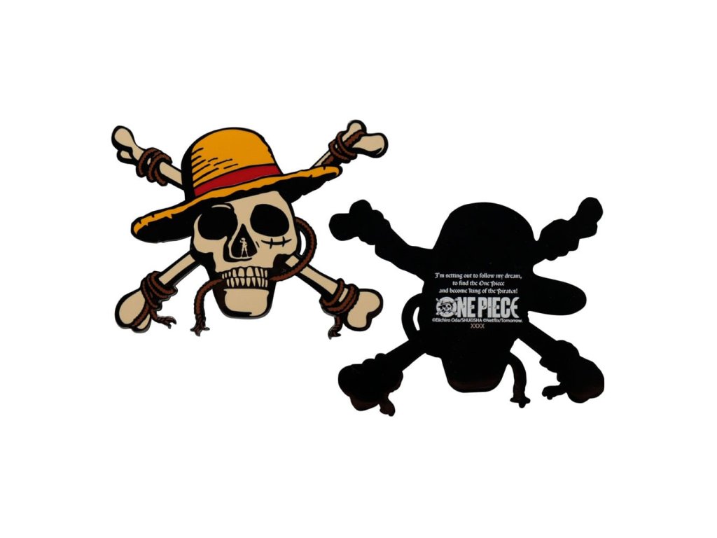 "Elindulok, hogy beteljesítsem az álmomat, hogy megtaláljam azt az egy darabot, és kalózkirály legyek! Monkey D. Luffy és a Szalmakalap-kalózok az egy darabért folytatott küldetése a fő cselekményszál a Netflix manga valósághű adaptációjában, és ezt alapozza meg Luffy fent említett idézete, amely ennek a medálnak a hátulján található. A sorozat Jolly Roger logóját formázó, az elülső oldalon az e-maillel ellátott medál világszerte 5000 darabra limitált, egyenként számozott - Hivatalos licenc - 5000 darabra limitált - Számozás a hátoldalon - Méret kb. 87 x 65mmKiegészítő paraméterek