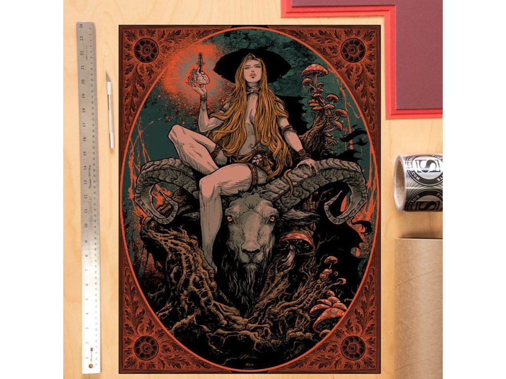 Valami rossz közeleg... A Sideshow Art Prints bemutatja a Godmachine művész Witch of the Woods művészeti nyomatát. Veszély táncol az erdőben, ahol egy pajkos szépség csalogatja az árnyékba a gyanútlan utazókat. Az erdő boszorkánya fekete hegyes kalapot és kevés mást visel, és elbűvölő külseje elrejti a benne rejlő sötétséget. Ez a stílusos portré a boszorkányt mérgező varangyszúnyogok és nyálkás fák gyökerei veszik körül erdei birodalmában. Alatta egy hatalmas, ívelt szarvú kecske bukkan elő a láthatatlan birodalmakból, és fekete mágiát sugároz. A boszorkány egy szívet tart a kezében, amelynek finom rózsaszín izmait ezüst tőr szúrja át - vajon ez az ára örök szépségének? Kevesen maradnak életben, hogy megosszák a szörnyű igazságot. A The Witch of the Woods minden egyes lenyomatán rajta van a Sideshow hitelességi pecsétje, amely egy 150 darabos limitált kiadás része. A kép keret nélküli giclée-nyomtatásként és drótakasztóval ellátott fekete keretben, keretezésre alkalmas átlátszó akrillal és hitelesített archiválási anyagokkal ellátott prezentációban is kapható. Párosítsd ezt a horror műnyomatot a Sideshow Originals külön megvásárolható Witch of the Woods Premium™ figurájával, hogy otthonodban teljesen elbűvölő látványt nyújtson! Ellopta már a szívedet? Hozd haza még ma a Godmachine Witch of the Woods művészeti nyomatát. Nyomtatás részletei: A boszorkányos boszorkányok a boszorkányok boszorkánya.Kiegészítő paraméterek