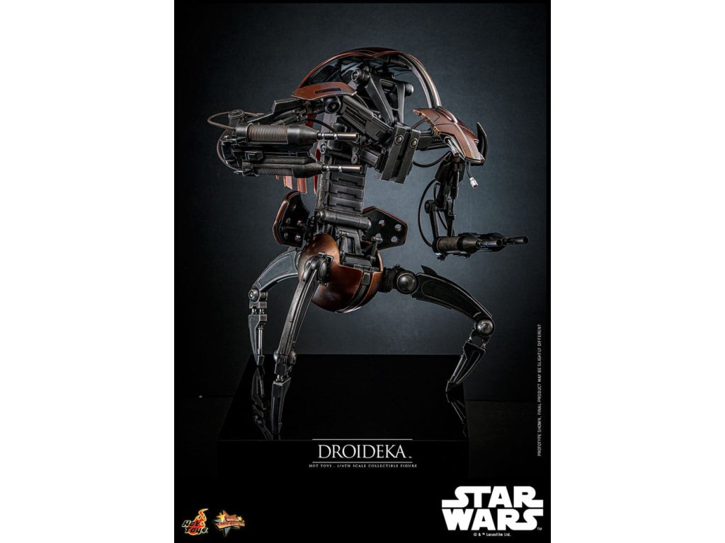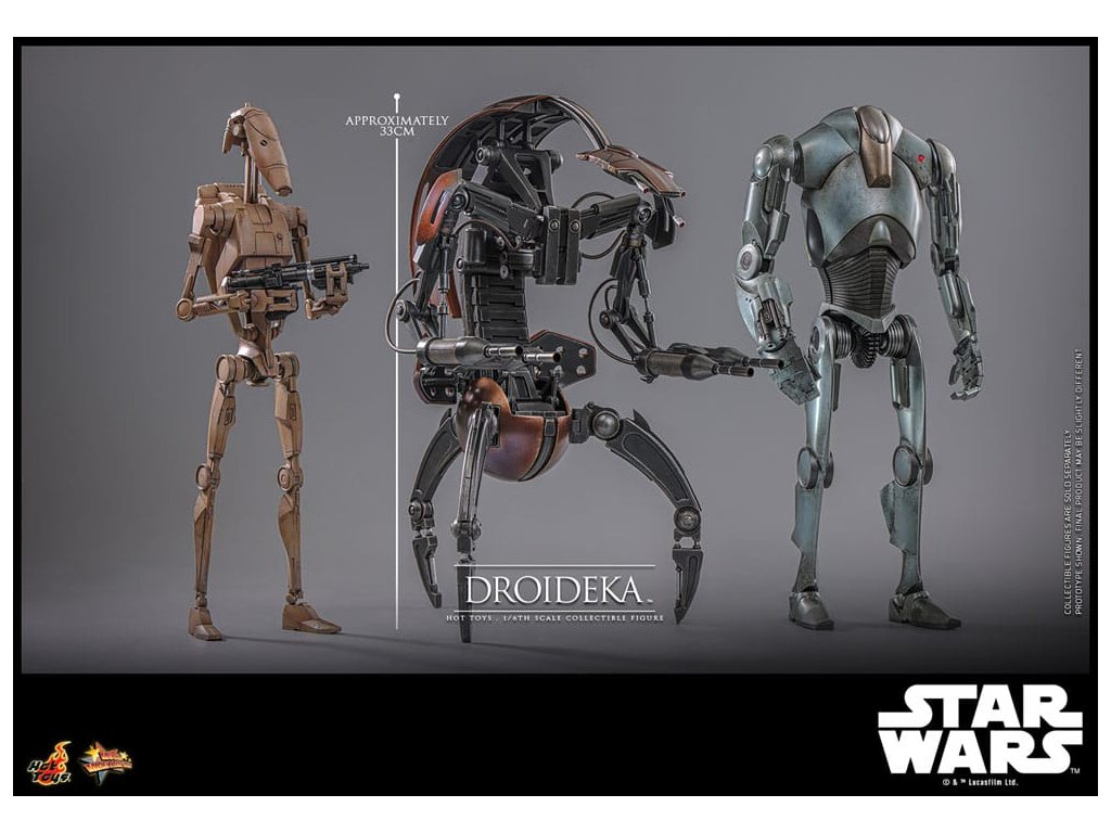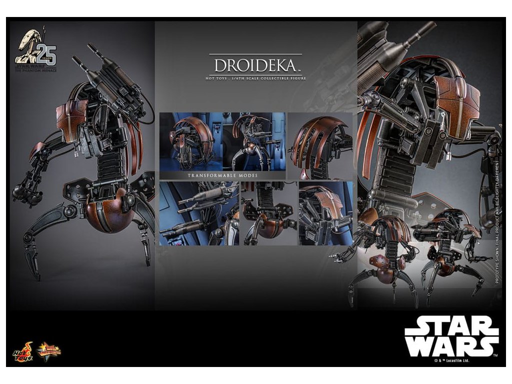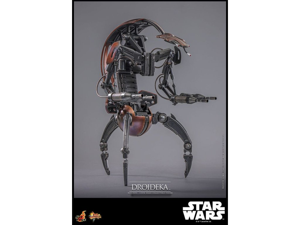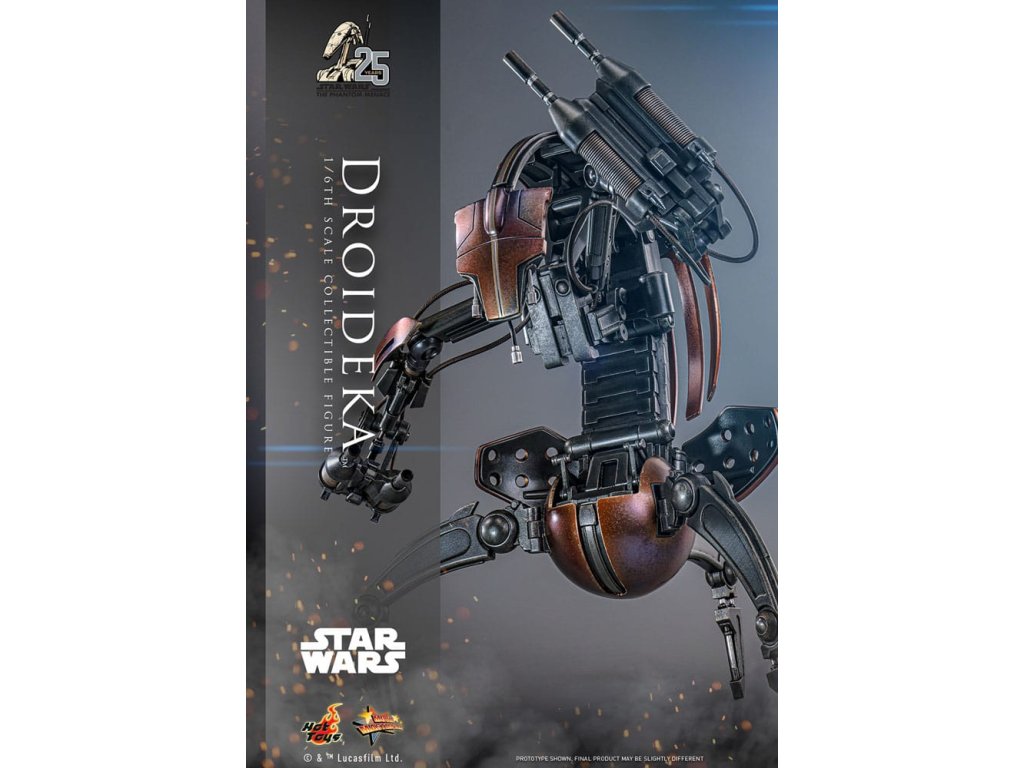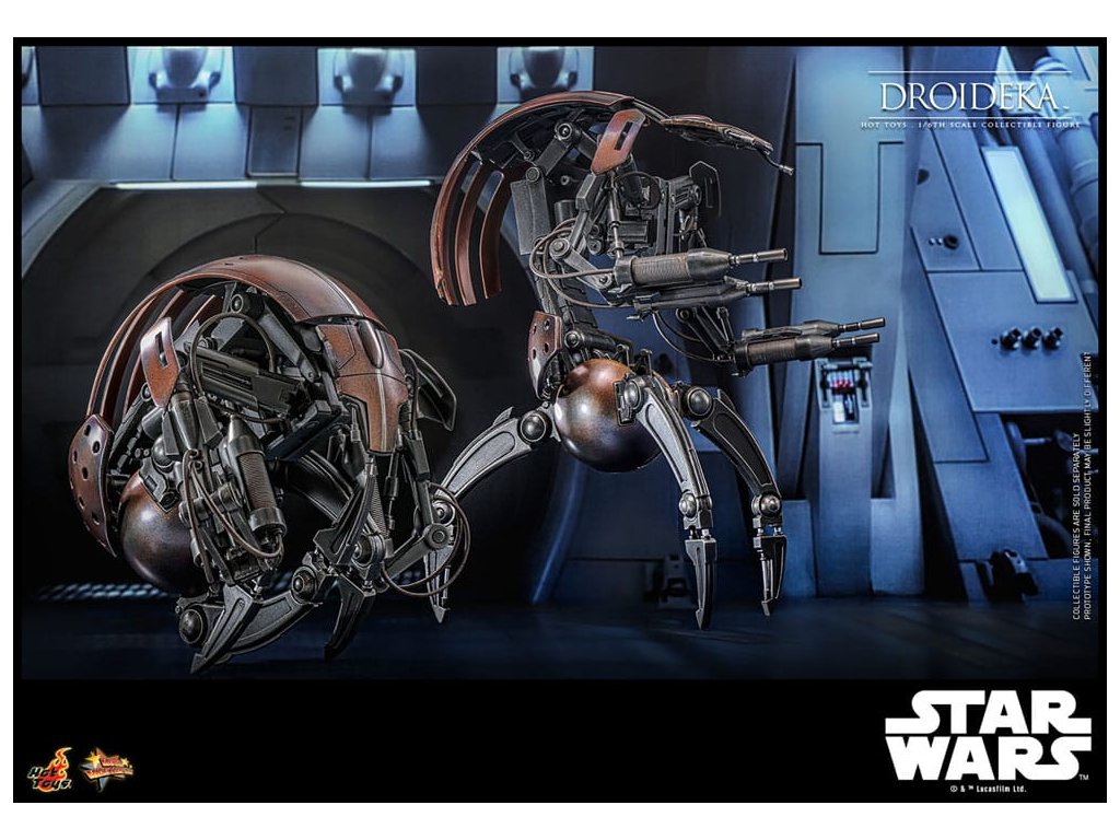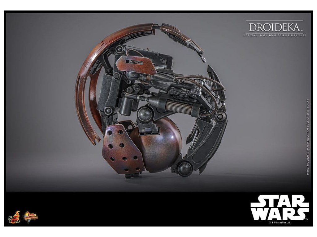 A karcsú harci droidokkal ellentétben, amelyek humanoid teste bizonyos fokú rugalmasságot biztosít számukra, a droidokat egyetlen céllal tervezték: a célpontok teljes megsemmisítése. A nehéz karok végén hatalmas ikerkilövők vannak, amelyek megsemmisítő energiát szabadítanak fel zúzó ritmusban. A bérgyilkos droid kompakt pajzsugráló generátorai segítségével képes teljesen védő energiagömbbe burkolni magát, bár ez a mozgékonysága rovására megy. Bár a droid lassú és esetlen a háromlábú futás közben, képes átalakulni egy sokkal gyorsabb, korongszerű formába. A Star Wars: A Fantomfenyegetés 25. évfordulója alkalmából a Sideshow és a Hot Toys örömmel mutatja be a Droideka gyűjtőfigurák hatodik sorozatát! A Droideka gyűjtőfigurák hatodik sorozata rendkívül részletes mechanikus szerkezetet mutat be, kivételes artikulációval, ügyesen alkalmazott fémfestéssel és a korong alakúvá alakulás képességével! Ez a csodálatos droid egy rendkívüli gyűjtői figura lesz a Star Wars™ gyűjteményedben!Kiegészítő paraméterek